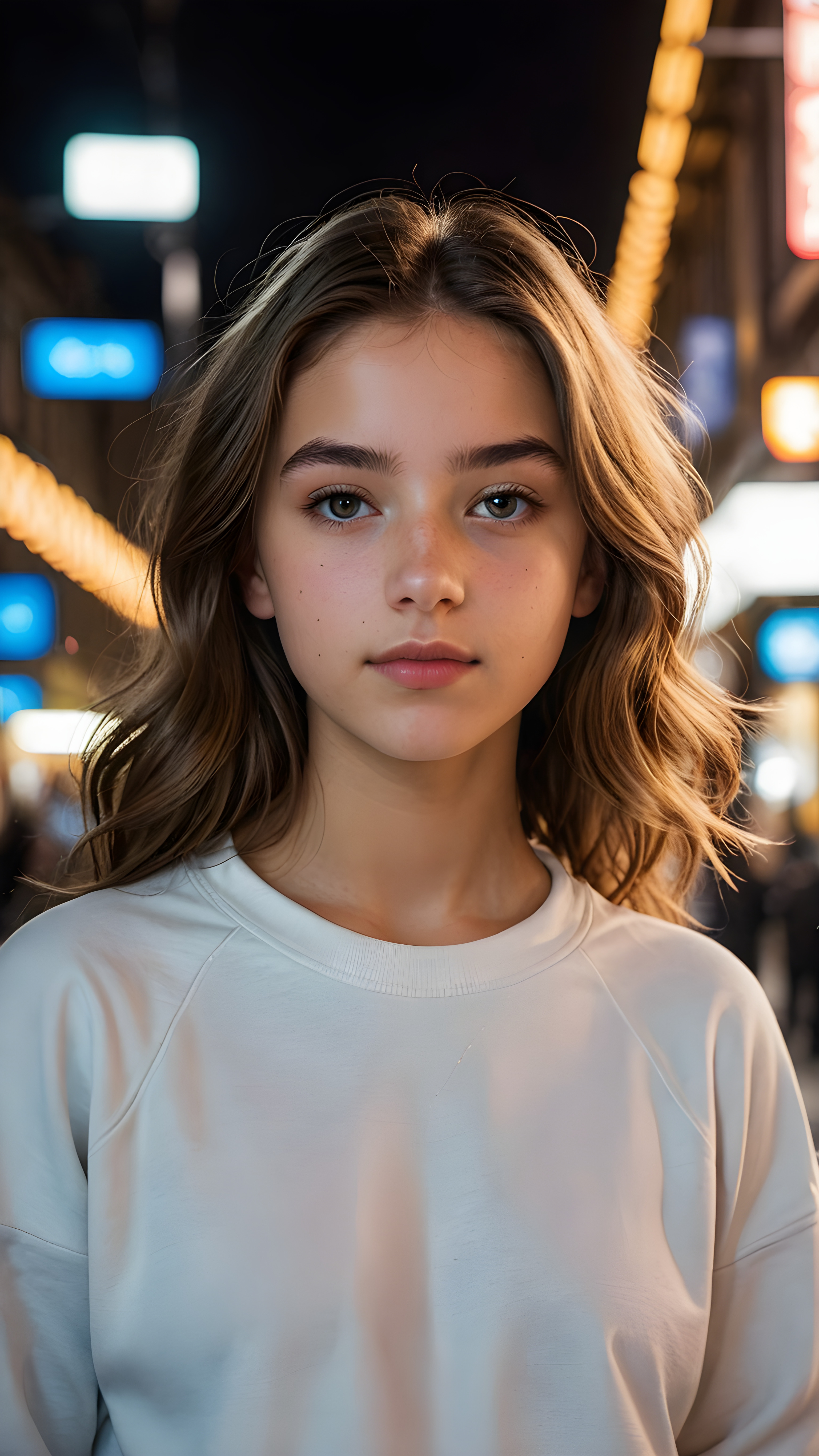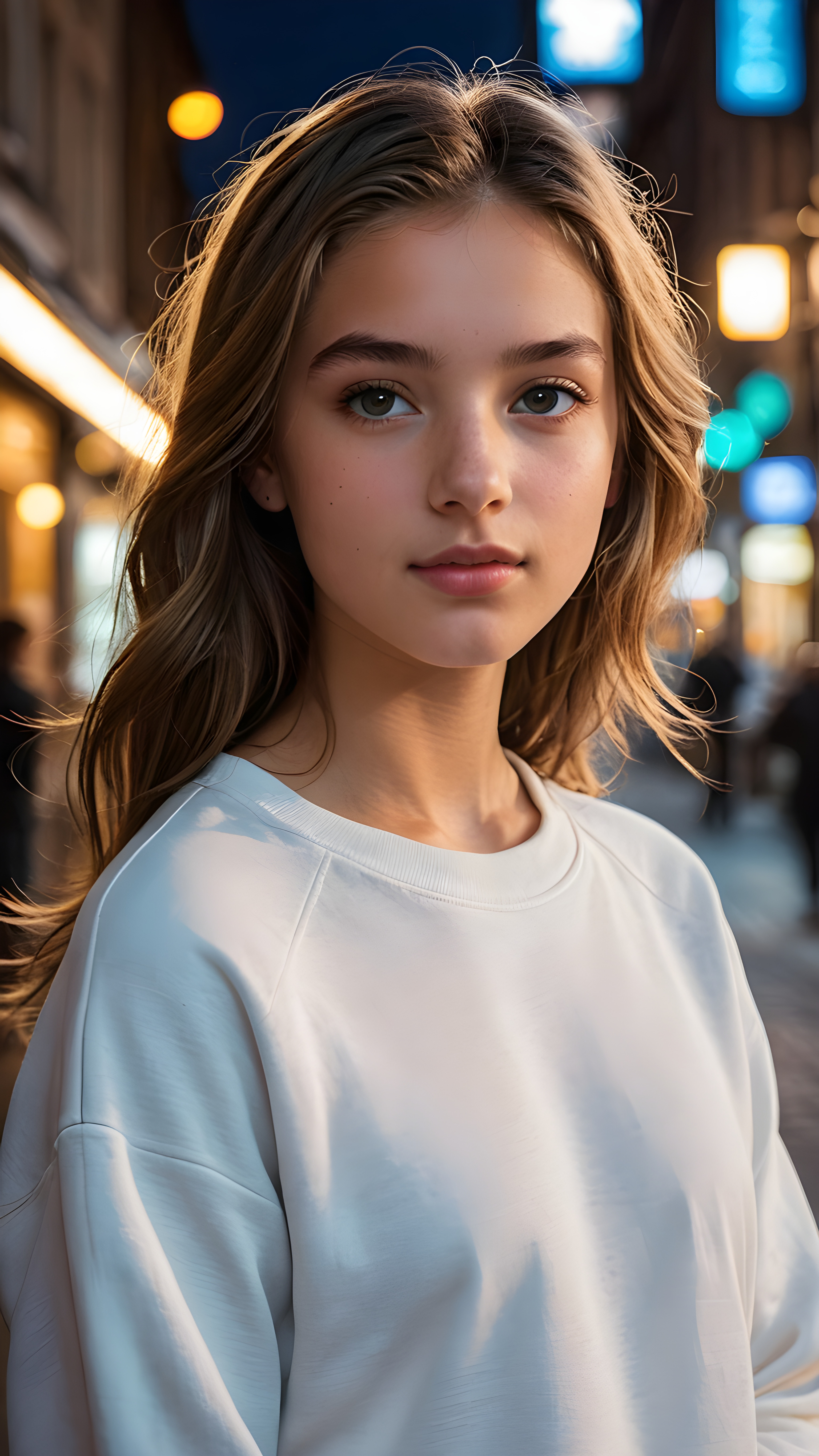 a (((professional ultra high resolution photograph))) capturing a (((beautiful young Europe teen girl, 13 years old))) with a sleek, ((straight, mid-length hair style)) that softly curls around her face, and ((realistic looking eyes)) that give off a (bright, warm glow). She’s clad in a ((sexy plain white sweatshirt)) that perfectly complements her flawless skin. The setting is a (softly backlit) one that focuses on her face, with the light shining out from behind her. The overall atmosphere is both whimsically detailed and highly detailed, evoking an (ultra realistic, cinematic aesthetic) that is both (softly detailed and vividly colorful).