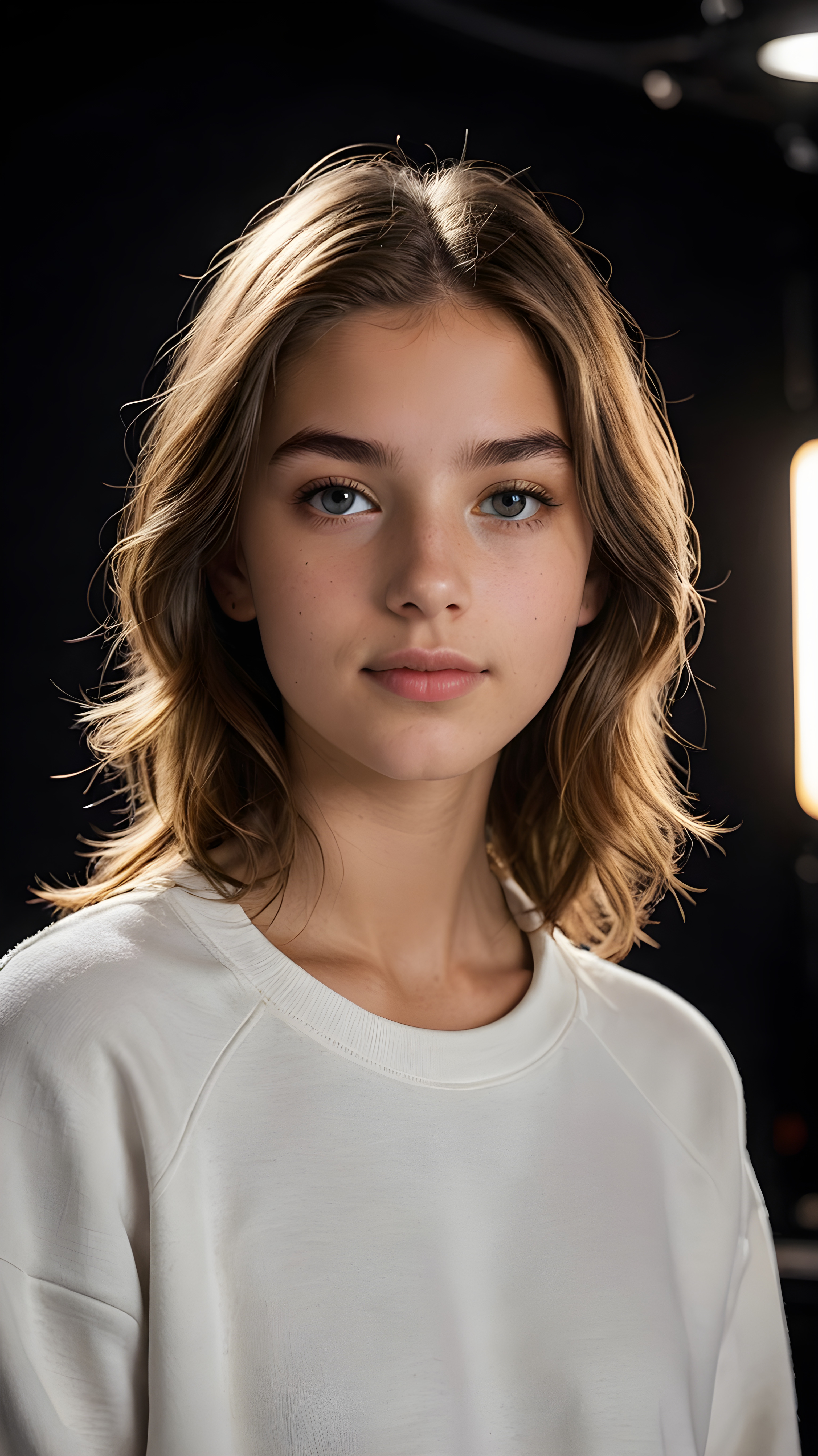 a (((professional ultra high resolution photograph))) capturing a (((beautiful young Europe teen girl, 13 years old))) with a sleek, ((straight, mid-length hair style)) that softly curls around her face, and ((realistic looking eyes)) that give off a (bright, warm glow). She’s clad in a ((sexy plain white sweatshirt)) that perfectly complements her flawless skin. The setting is a (softly backlit) one that focuses on her face, with the light shining out from behind her. The overall atmosphere is both whimsically detailed and highly detailed, evoking an (ultra realistic, cinematic aesthetic) that is both (softly detailed and vividly colorful), ((black backdrop))