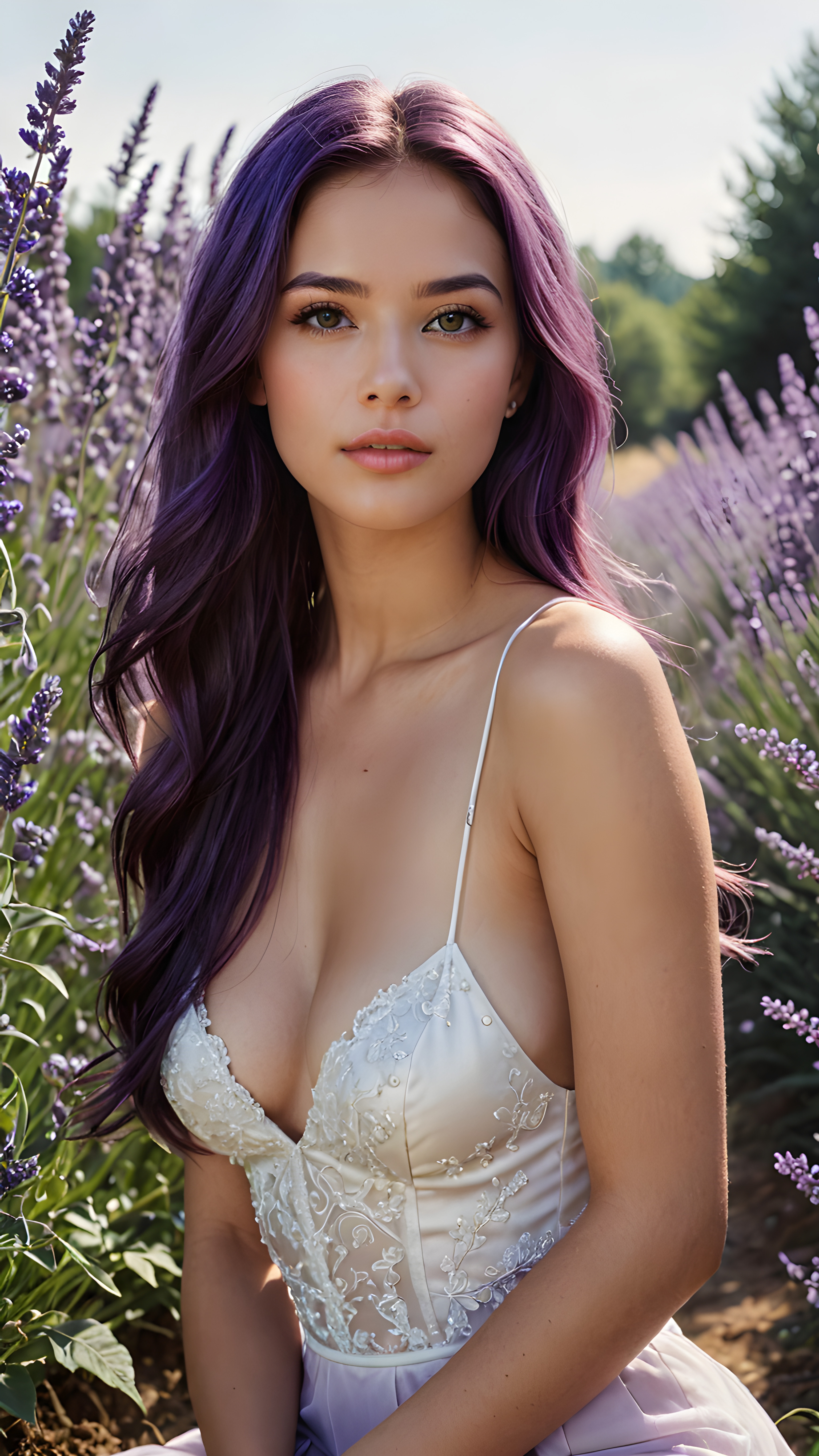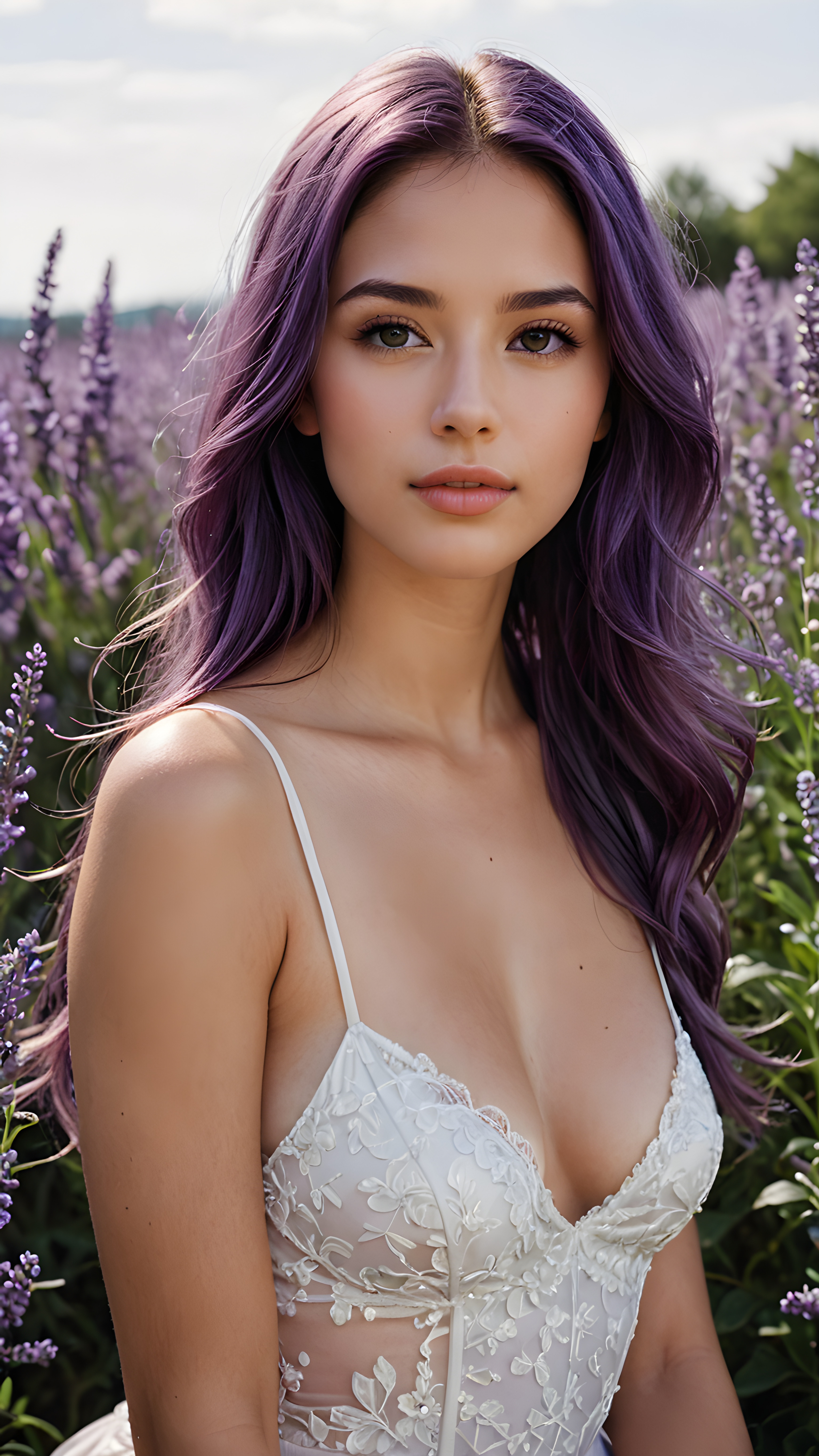 detailed and super realistic photo from a young, beautiful well busty girl with ((long, straight jet soft purple hair)) and delicate, (natural looking) light makeup, contrasted against a background of (lavender flowers and petals). The image exudes an elegant and noble aesthetic, reminiscent of a scene from a fantasy romance film, where the character’s face and dress are perfectly captured, with (accurate anatomy) and (hyper-detailed features) that convey a sense of natural beauty and sophistication, she has beautiful deep black eyes and perfectly smooth flawless skin. She has full, plump kissable lips and a slightly open mouth with white teeth. She wears a tight, white plain tank top, which emphasizes her perfectly shaped body