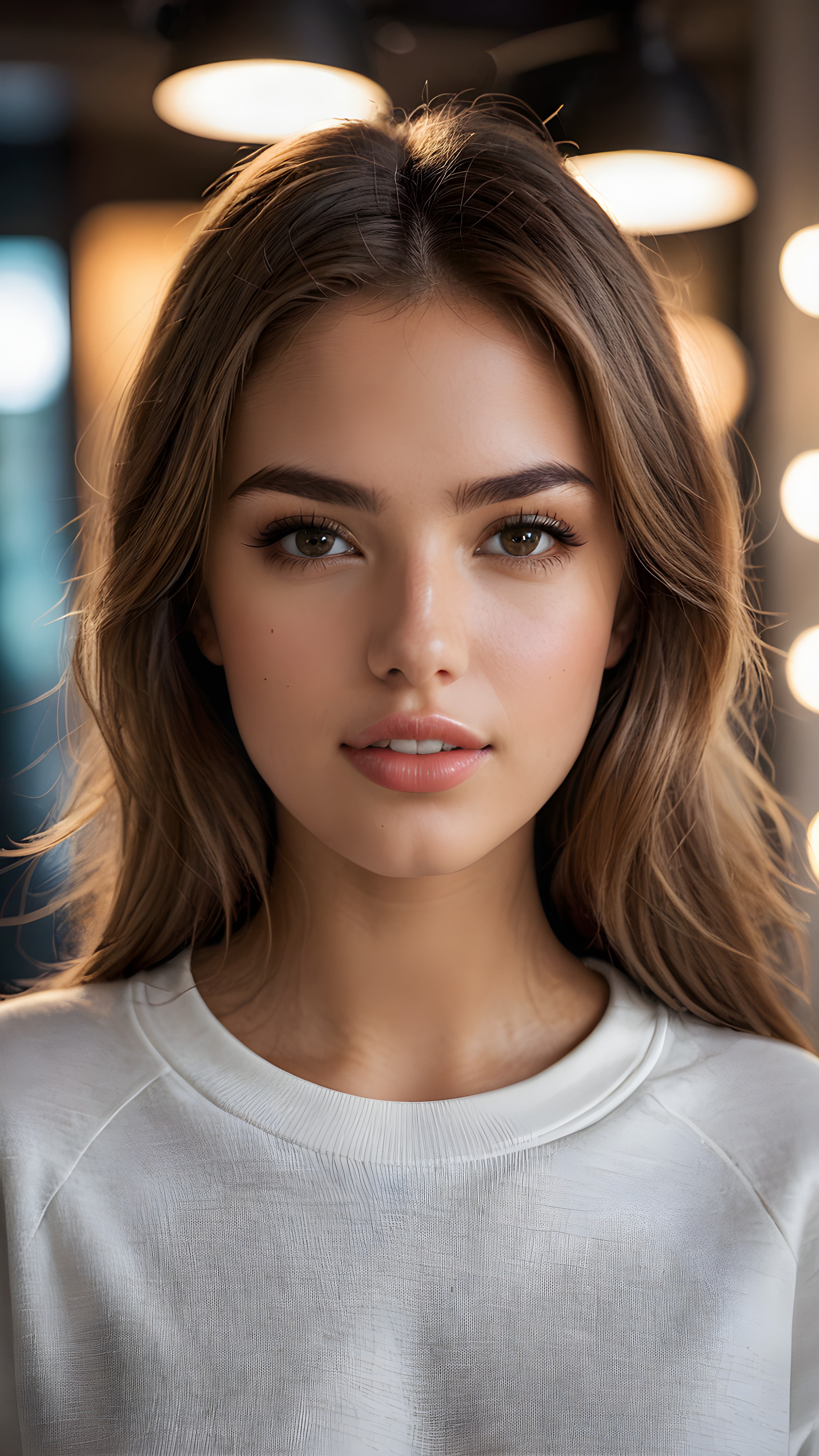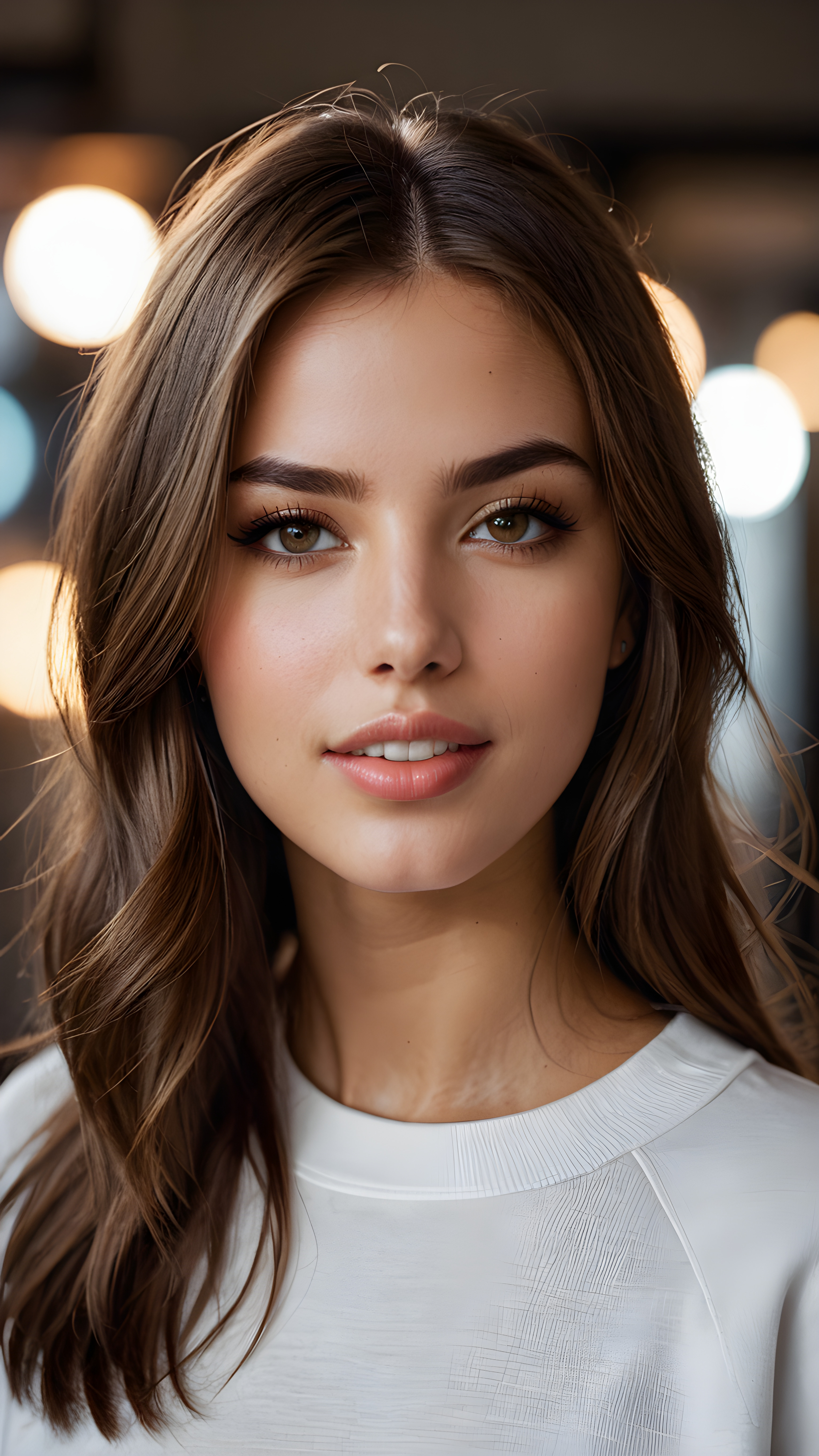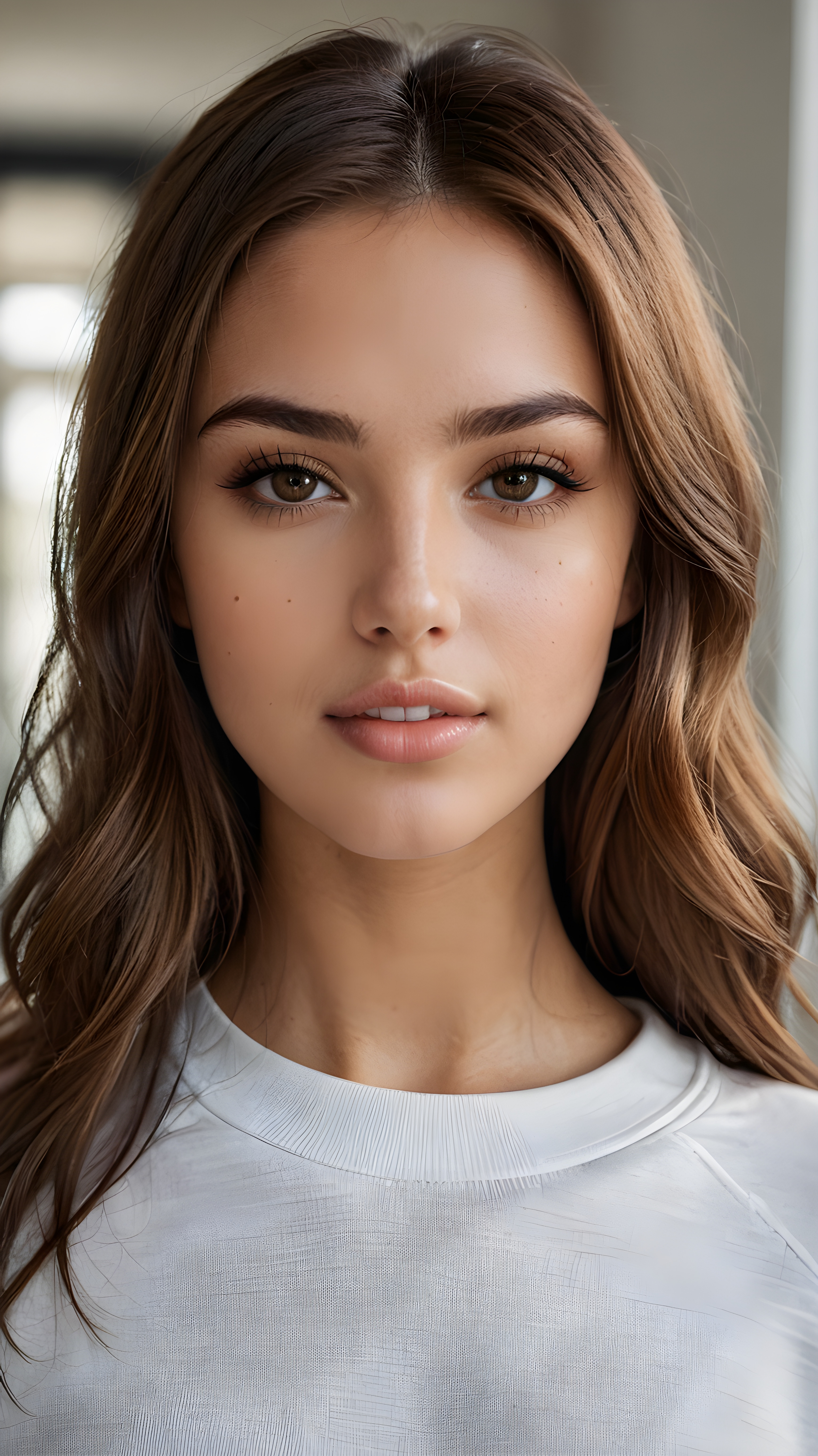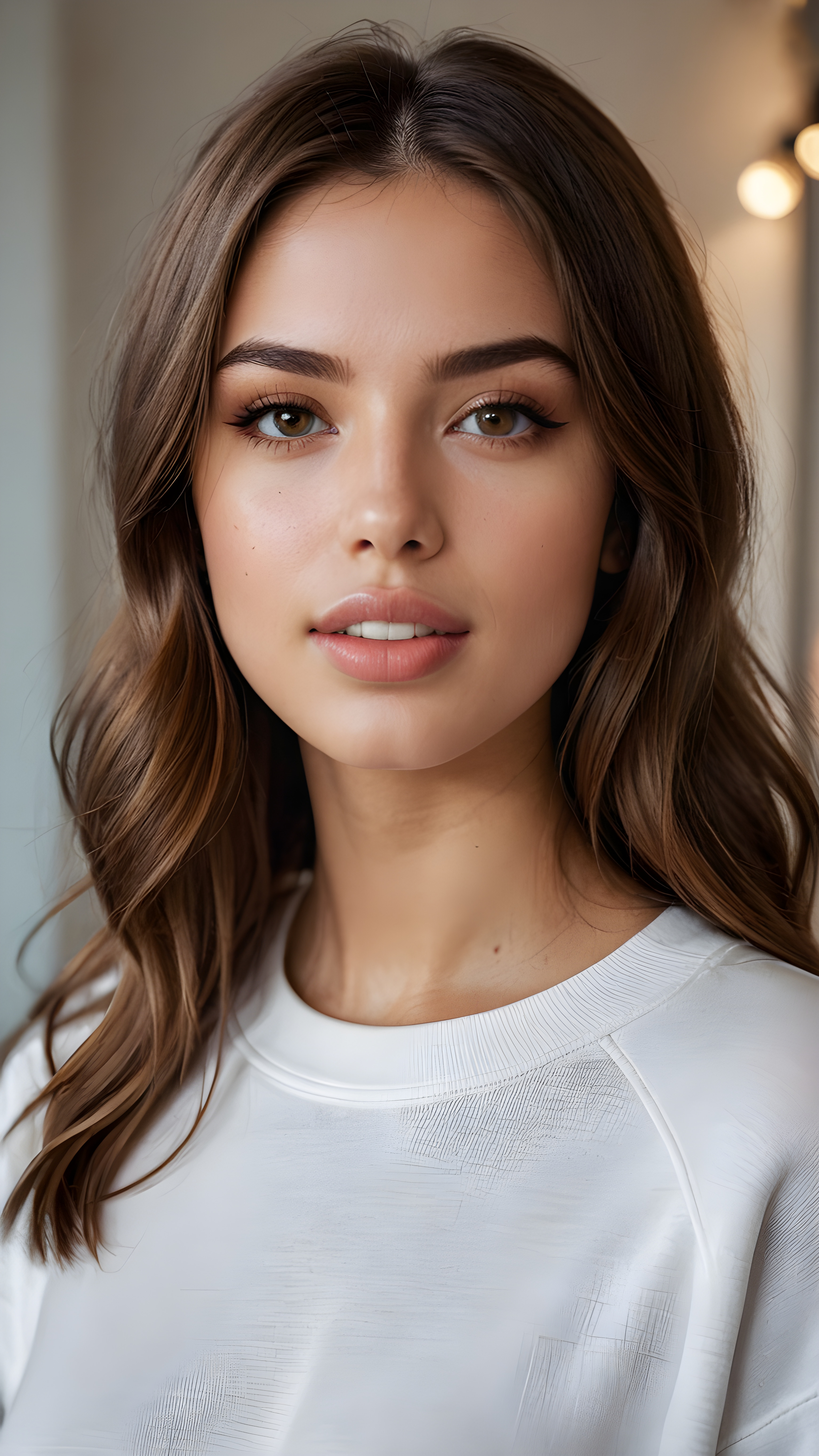 detailed and super realistic photo from a young, beautiful girl with silky, smooth, shiny light brown straight hair, beautiful deep black eyes, perfectly smooth flawless skin. She has full, plump kissable lips and a slightly open mouth with white teeth. She wears a tight, white plain sweatshirt, which emphasizes her perfectly shaped body.