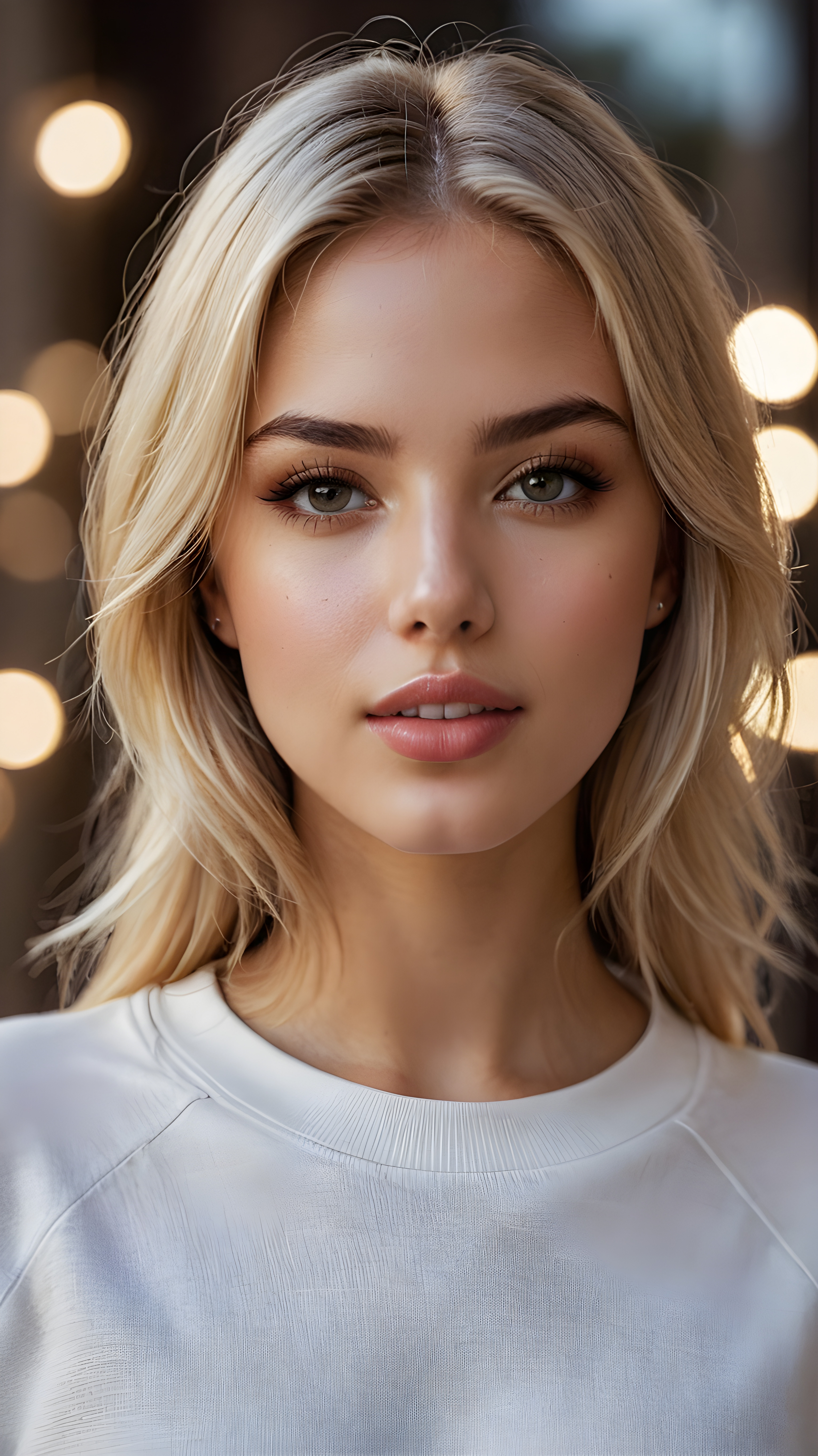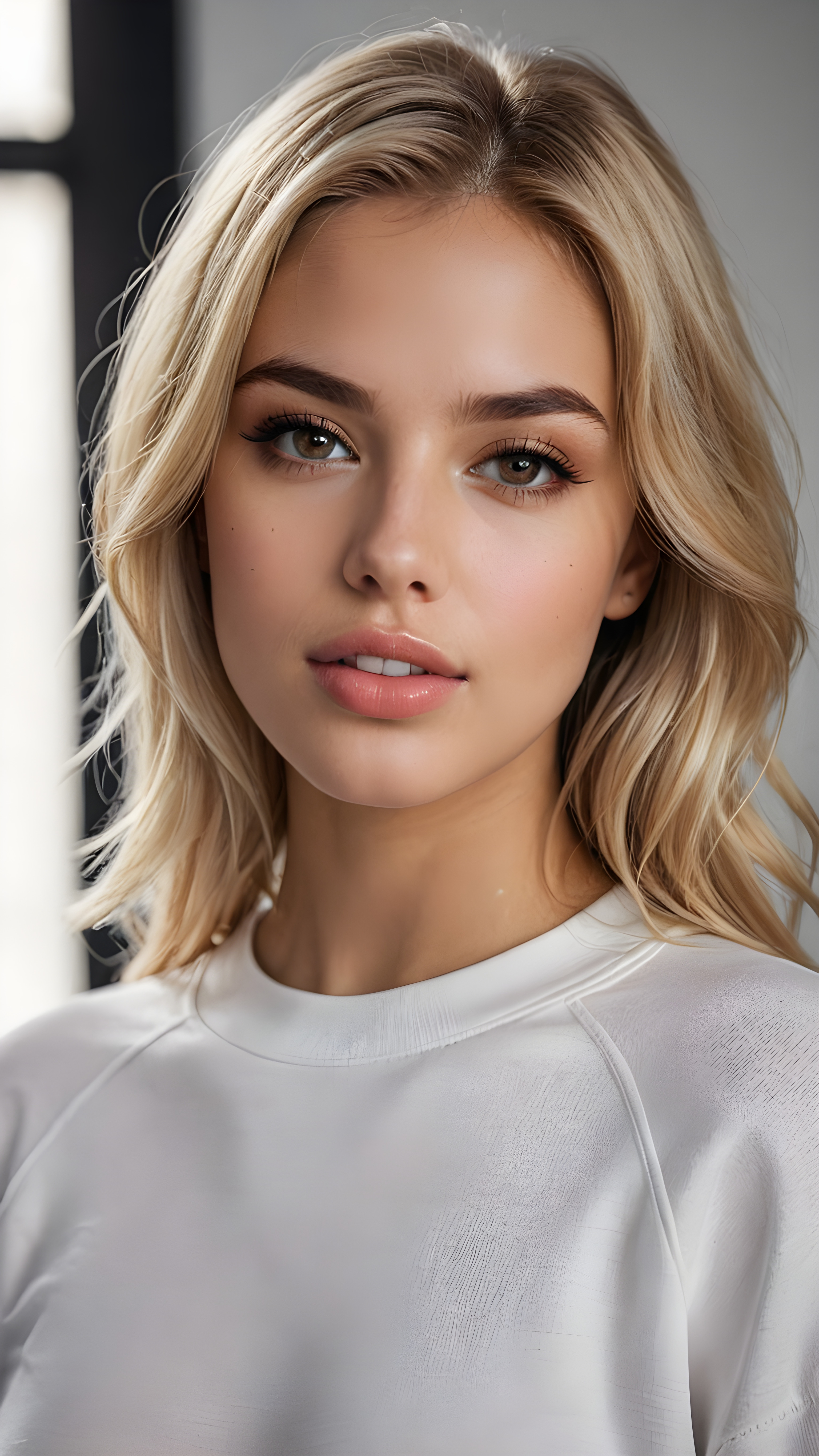 detailed and super realistic photo from a young, beautiful girl with silky, smooth, shiny blond straight hair, beautiful deep black eyes, perfectly smooth flawless skin. She has full, plump kissable lips and a slightly open mouth with white teeth. She wears a tight, white plain sweatshirt, which emphasizes her perfectly shaped body.
