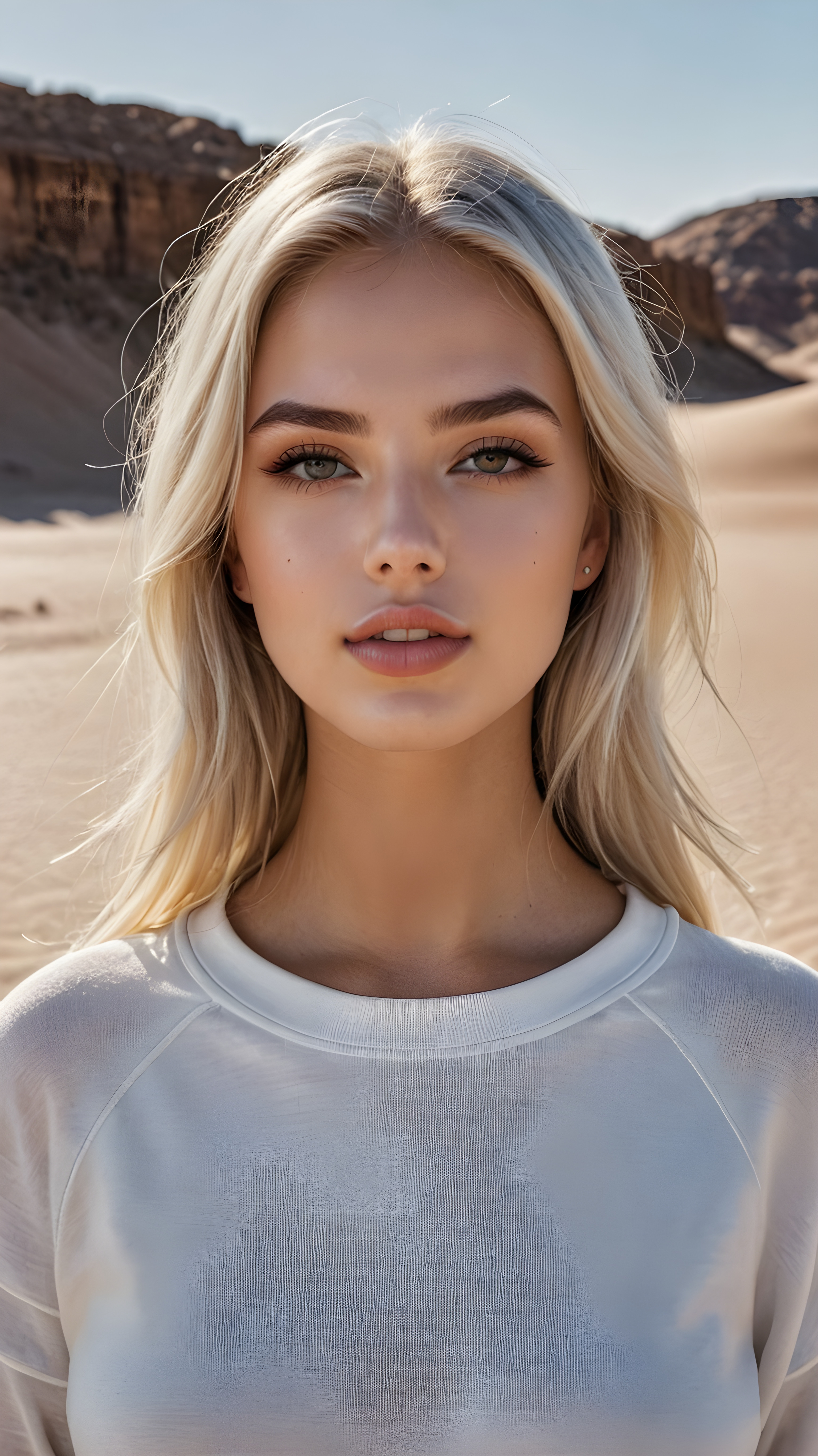 detailed and super realistic photo from a young, beautiful young model girl with silky, smooth, shiny platinum blond straight hair, beautiful deep black eyes, perfectly smooth flawless skin. She has full, plump kissable lips and a slightly open mouth with white teeth. She wears a tight, white plain sweatshirt, which emphasizes her perfectly shaped body, against a desert in backdrop