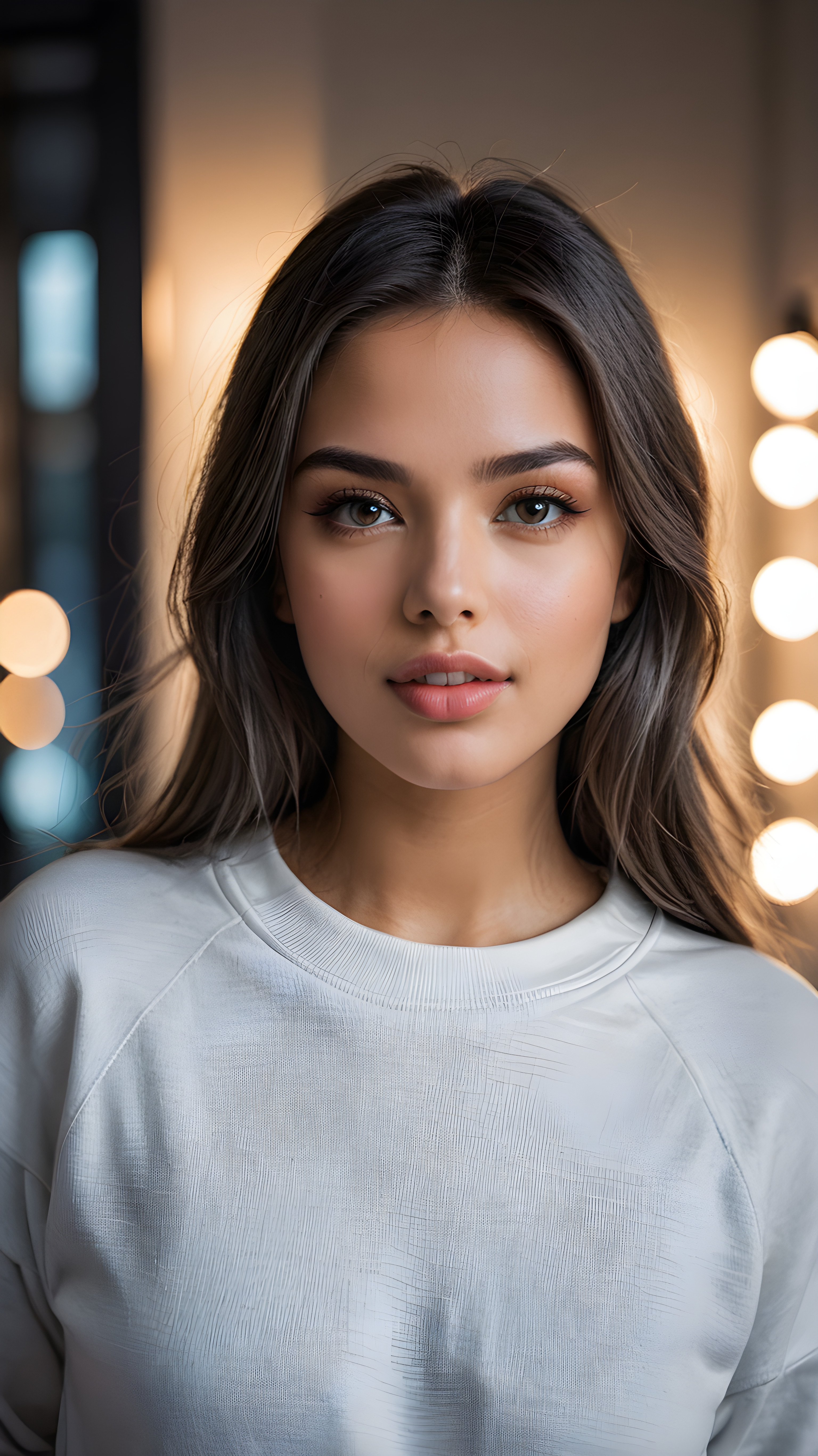 detailed and super realistic photo from a young, beautiful girl with silky, smooth, shiny hazelnut straight hair, beautiful deep black eyes, perfectly smooth flawless skin. She has full, plump kissable lips and a slightly open mouth with white teeth. She wears a tight, white plain sweatshirt, which emphasizes her perfectly shaped body.