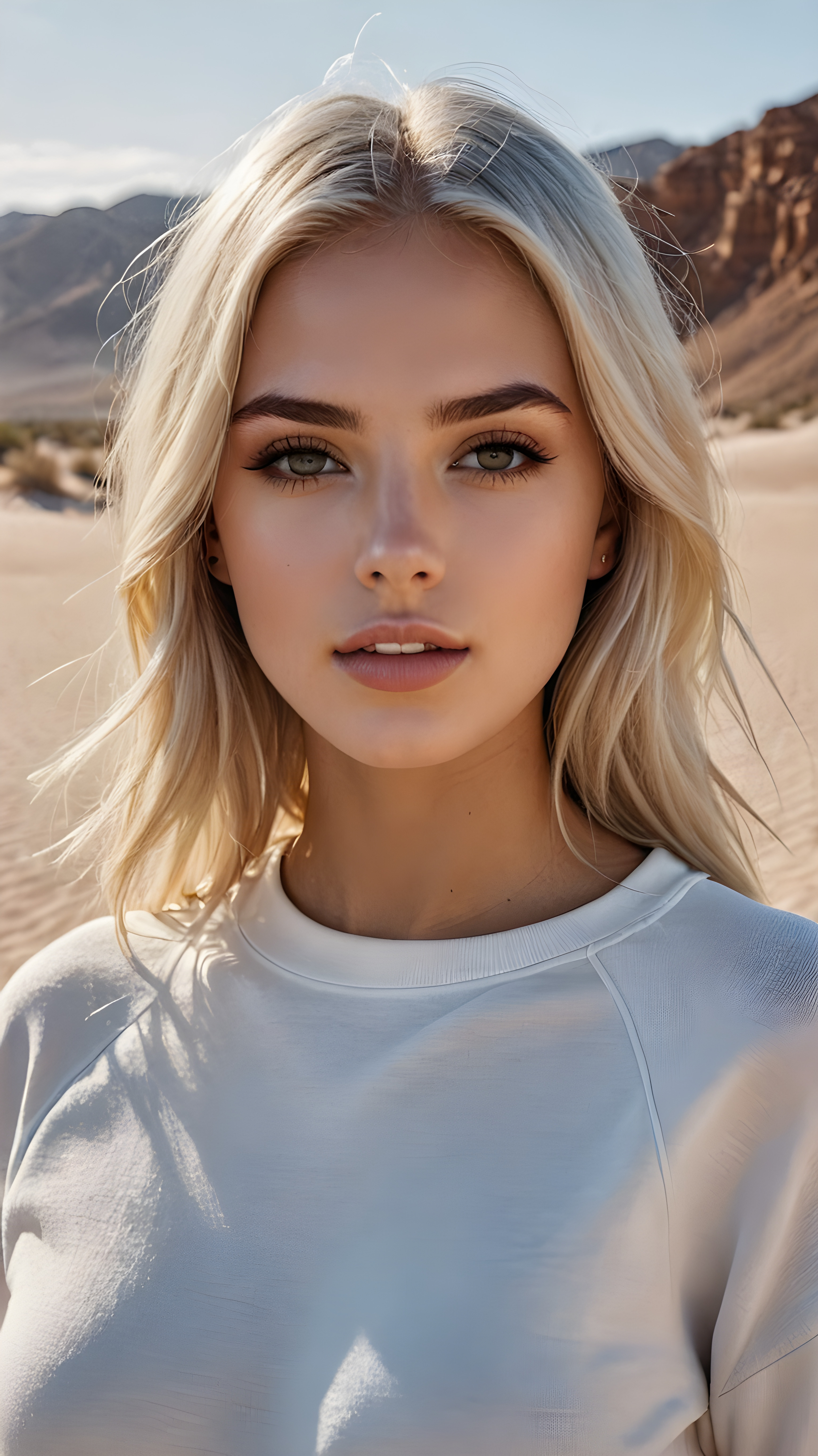 a (((super realistic full length photograph))), captured in 8K, showcasing a (((beautiful young model girl))) with luxuriously long, silky straight platinum blond hair and a sleekly poised body, dressed in a plain white sweatshirt that complements her flawless complexion. She stands confidently in the desert, her lips perfectly shaped and painted in a soft, natural hue, contrasting brilliantly against the arid backdrop