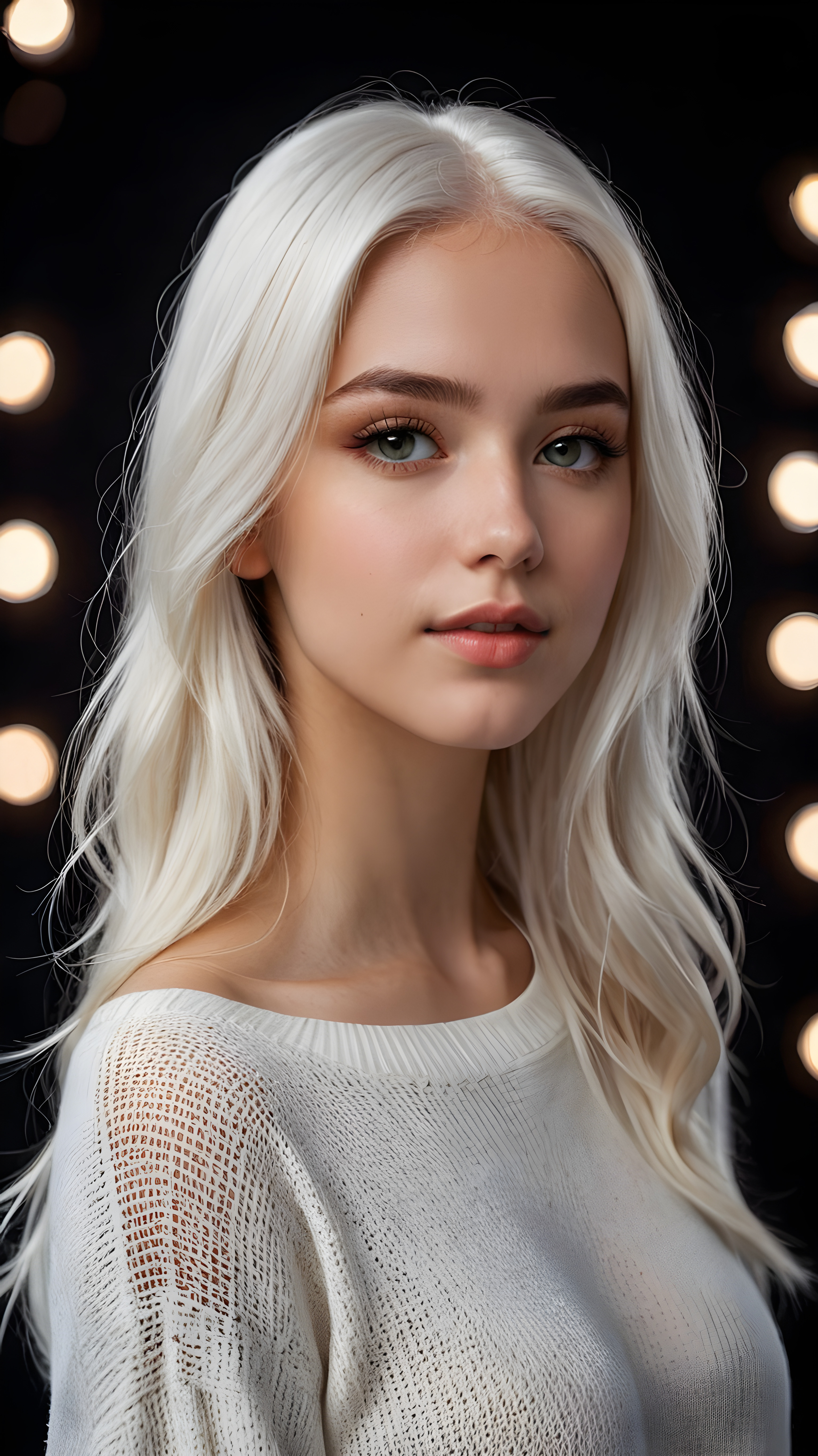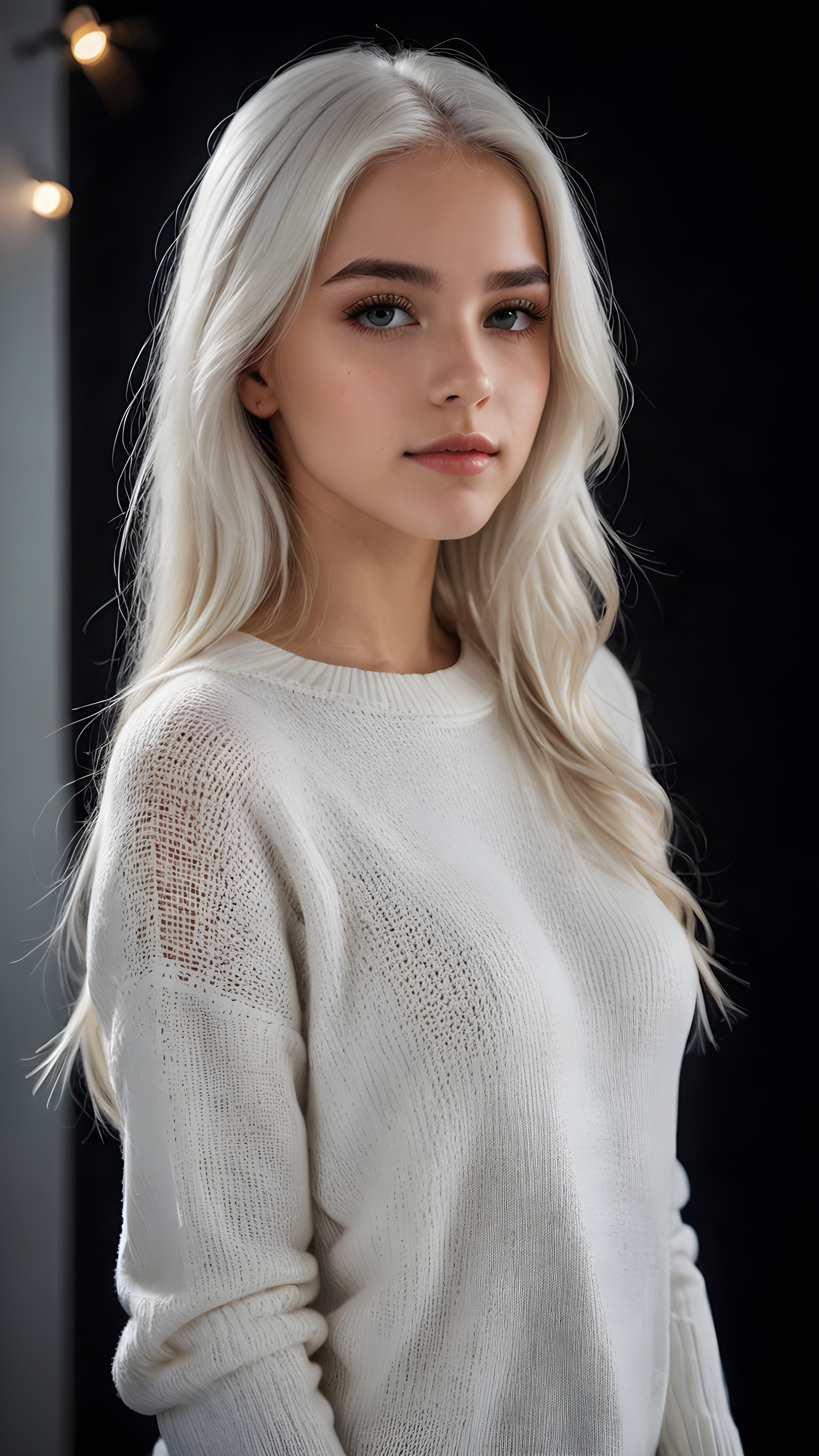 ((stunning)) ((gorgeous)) a beautiful realistic teen girl, perfect portrait, perfect curved body, long straight platinum white hair, wears a white sweater, white silhouette, black background