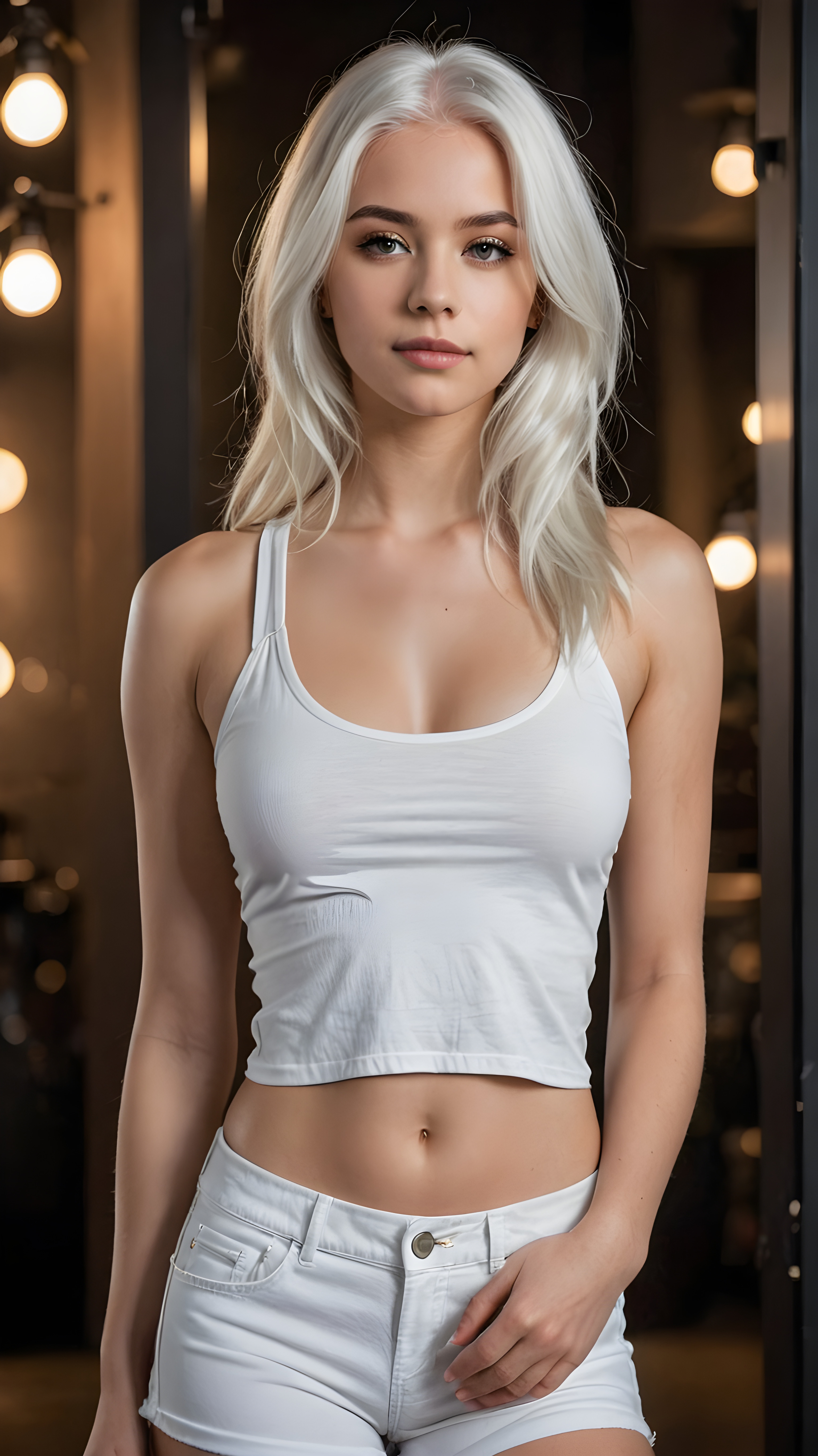 a (((full body portrait))), featuring a (((stunningly beautiful realistic teen girl))) with flowing, (((long, straight platinum white hair))). She’s dressed in a (((white short cropped tank top, you can see her belly button))), which accentuates her (perfectly toned thighs) and (flawlessly proportioned curves) in a side view. The scene is (darkly lit) against a backdrop of a (pure, white backdrop), creating a sense of mystery and elegance