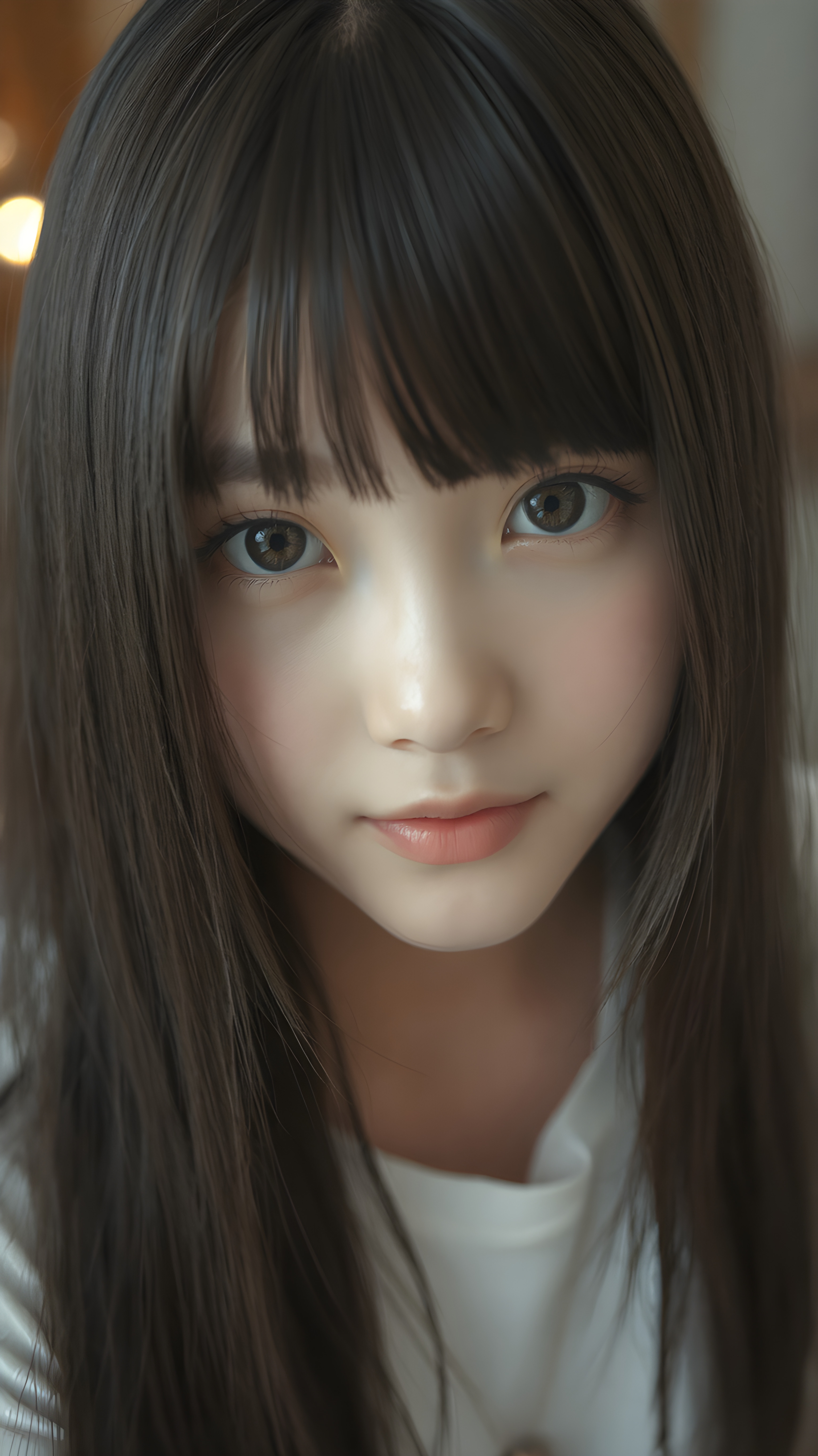 a (((super realistic full body photo))), captured from a (((young stunning and gorgeous well-busted Japanese teen girl)) with long straight obsidian hair, bangs cut, full lips, hyper-realistic eyes with perfectly matching pupils and white irises, a small flawless nose, and perfectly aligned and symmetrical front teeth, dressed in a (short tight white t-shirt with a deep v-neck)
