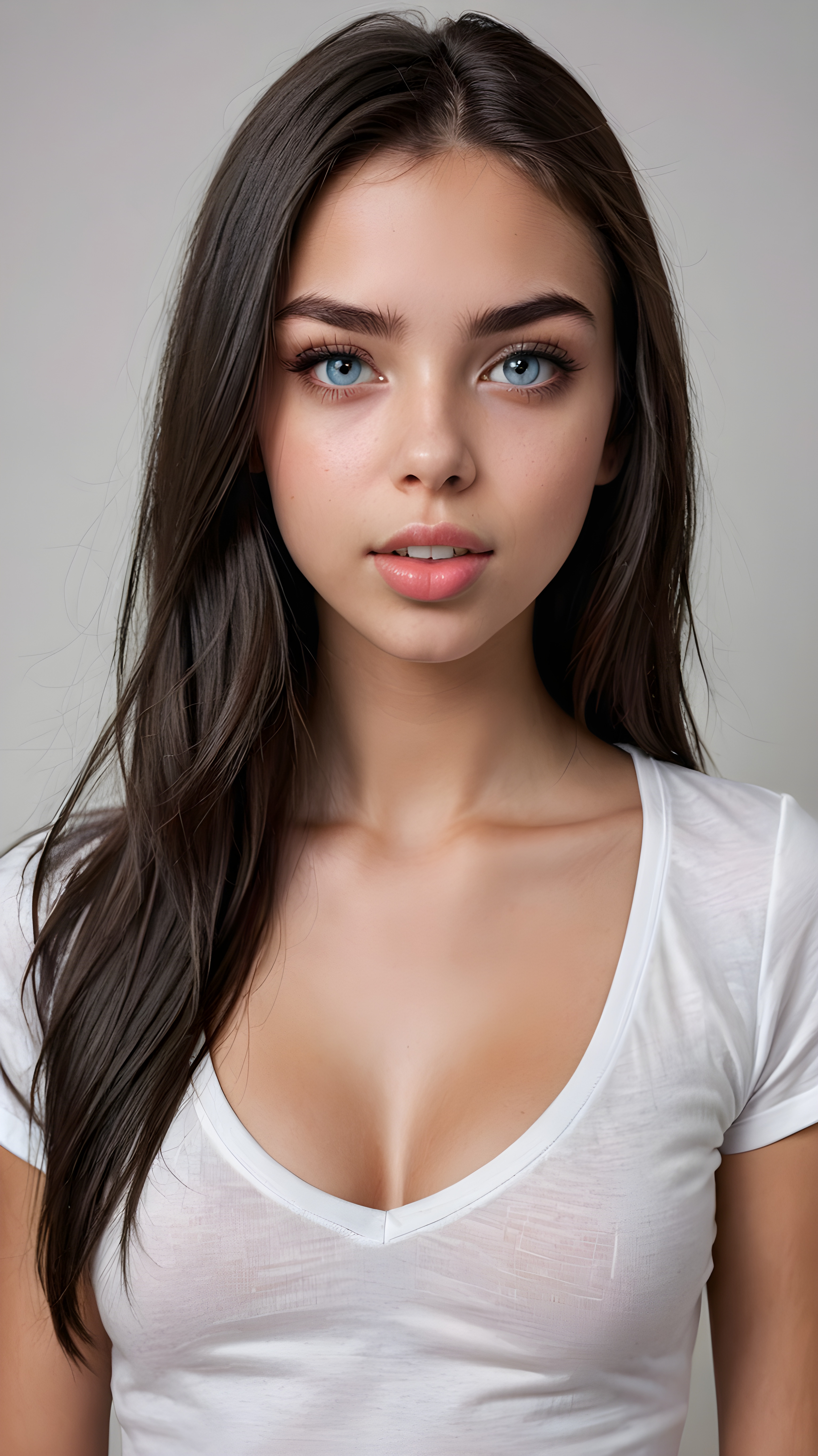 super realistic photo from a young stunning and gorgeous well busty teen girl with long, straight black hair, full lips, detailed eyes, smile, she wears a form-fitting thin white t-shirt with deep v-neck, perfect curved body
