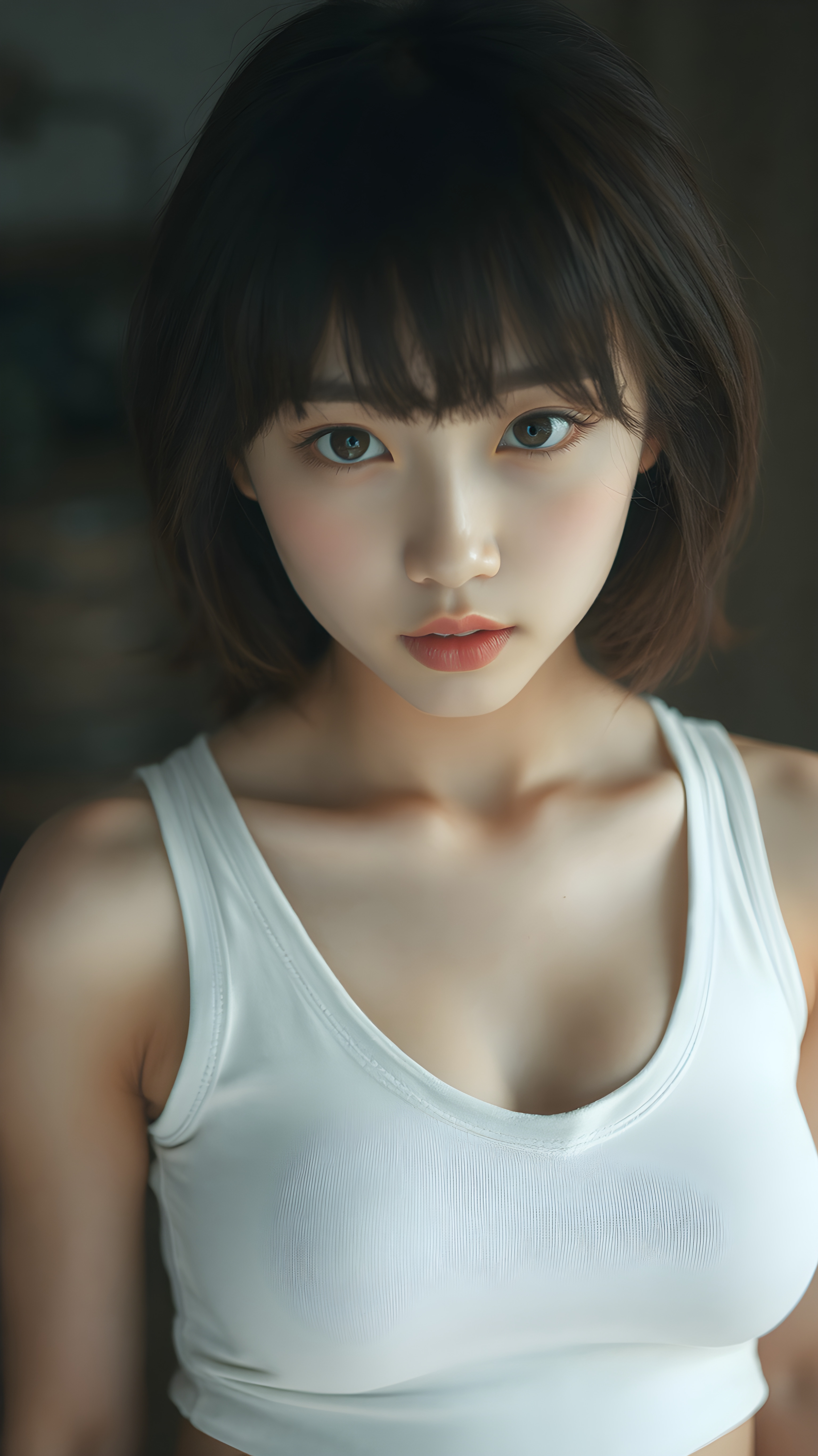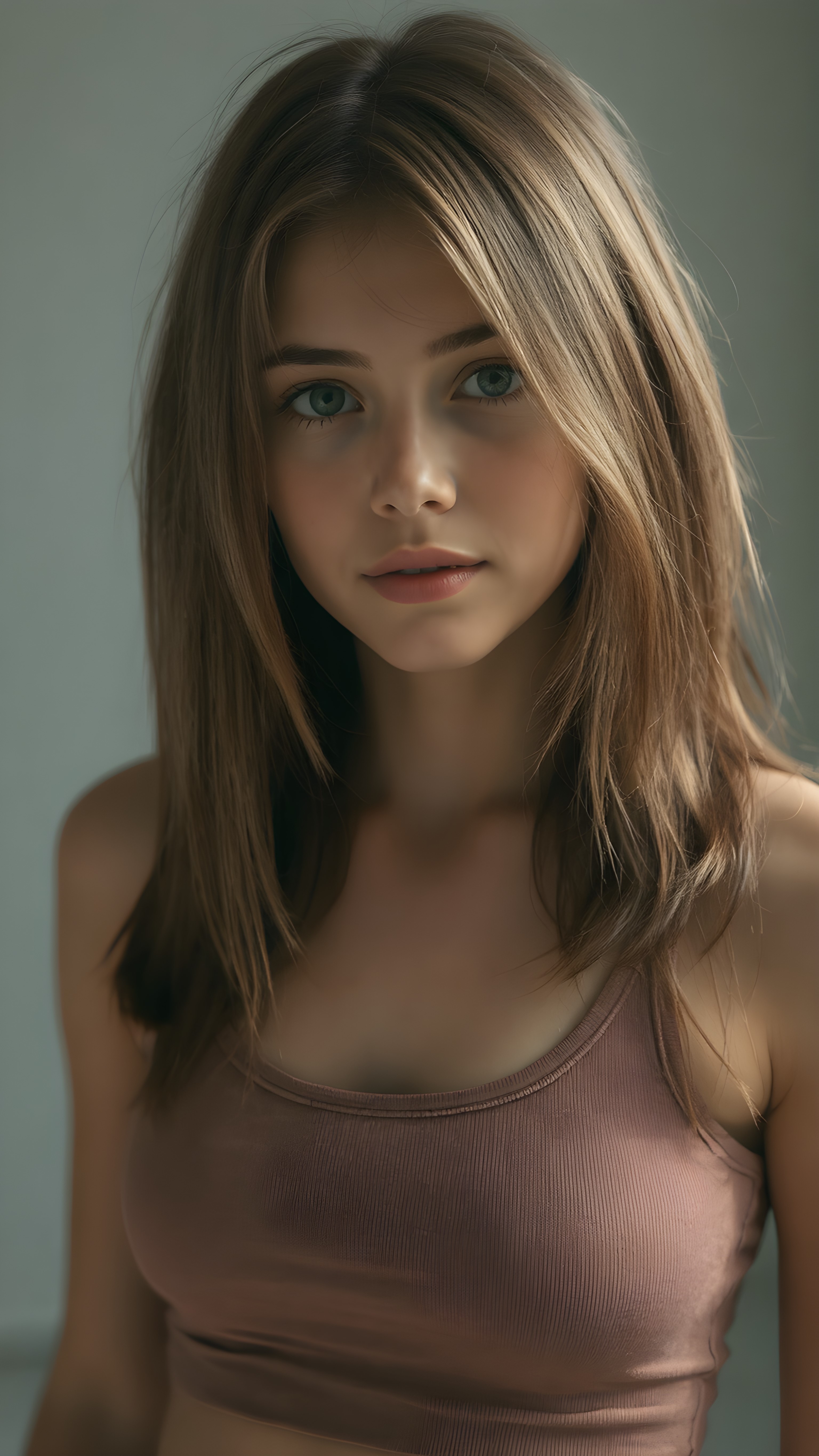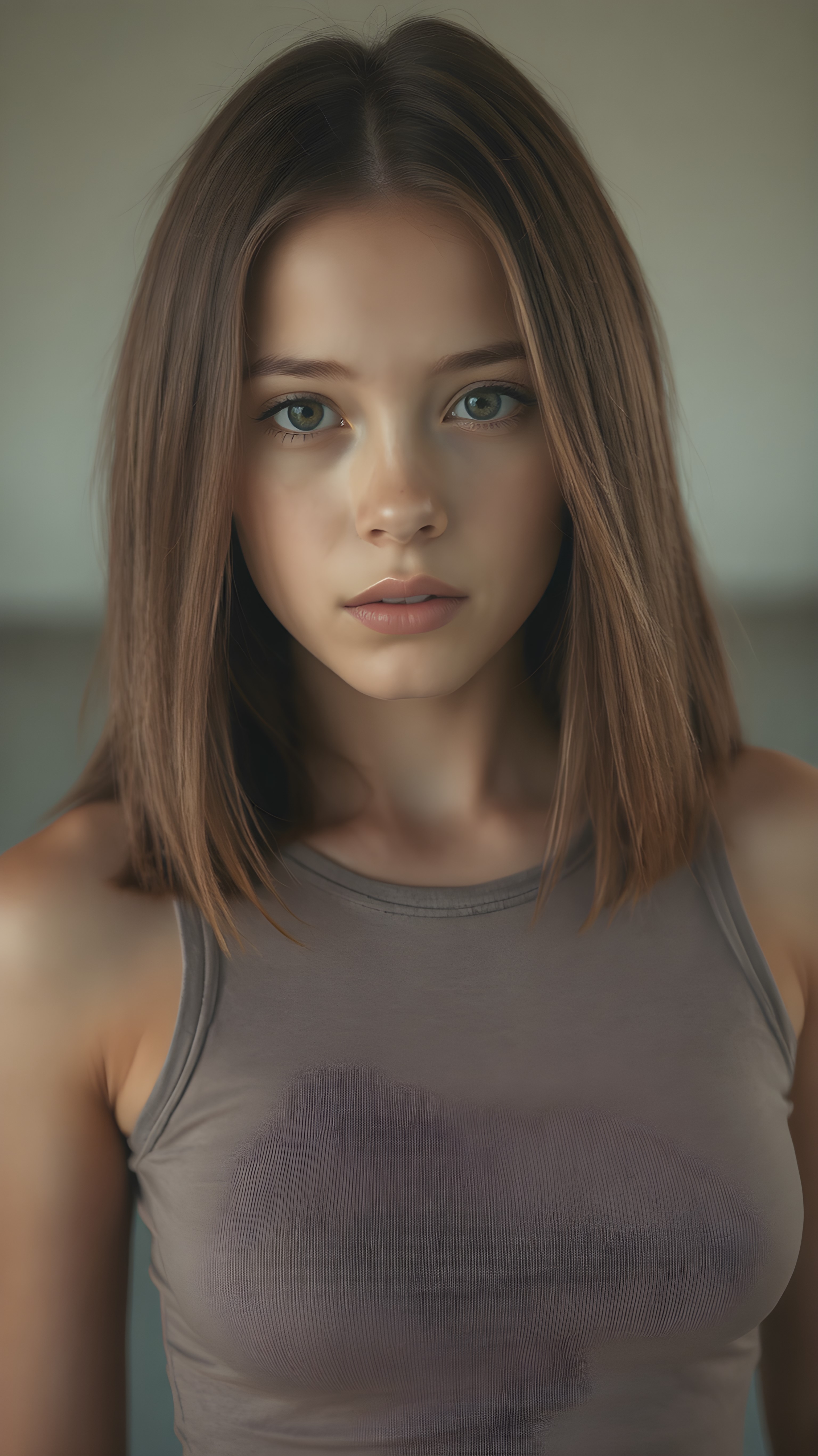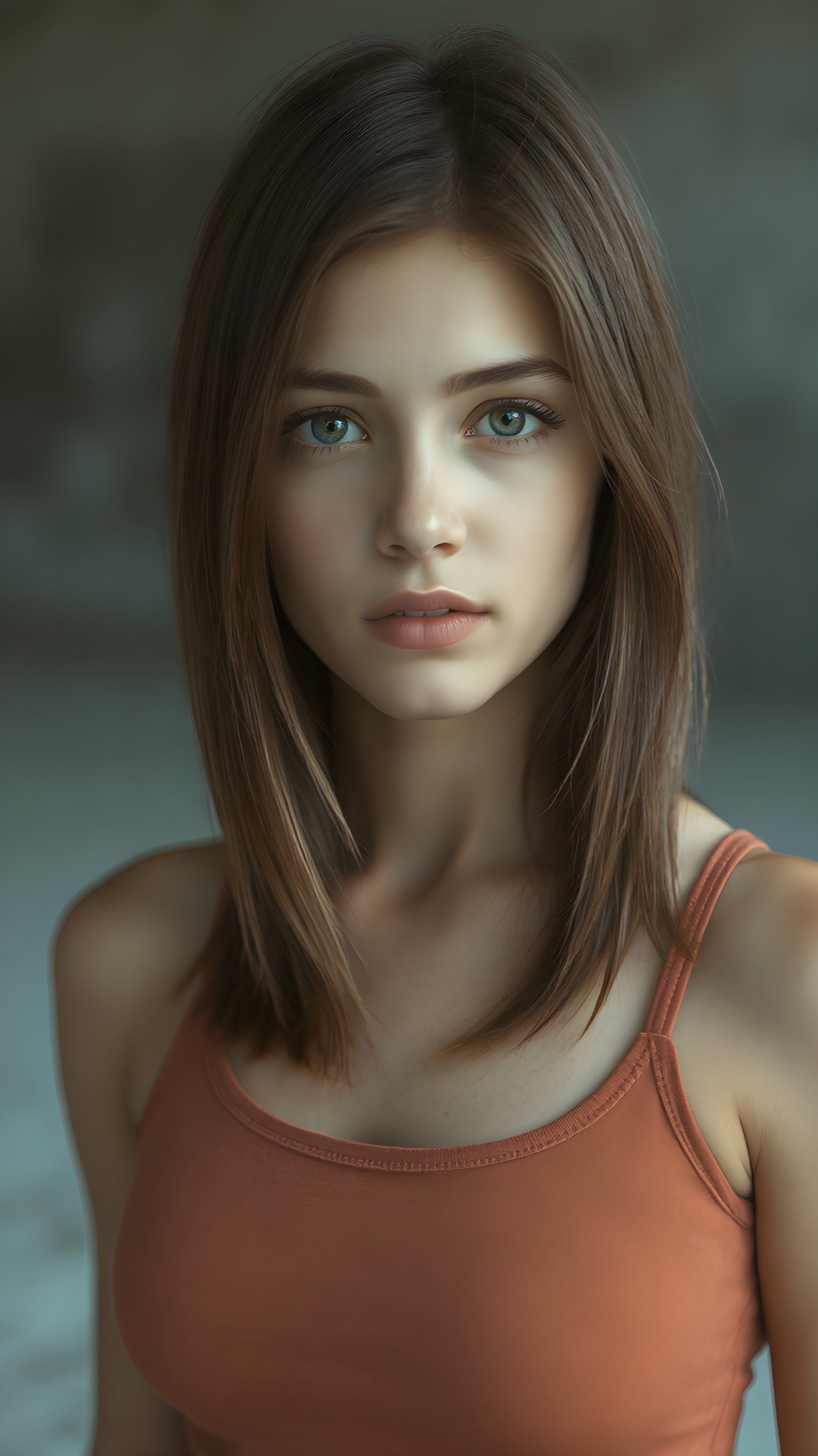 a (((beautiful teen girl))) with a sleek, (((close-up upper body))), straight soft brown hair, intricate details like curves and contours popping against an (((empty backdrop))), exuding an (((intoxicating aura))) that draws the eye, capturing essence of both (((cuteness))) and (((staggering beauty))) with shoulder-length hair and a (((tight crop tank top))) that blends into a (((hyper realistic)))