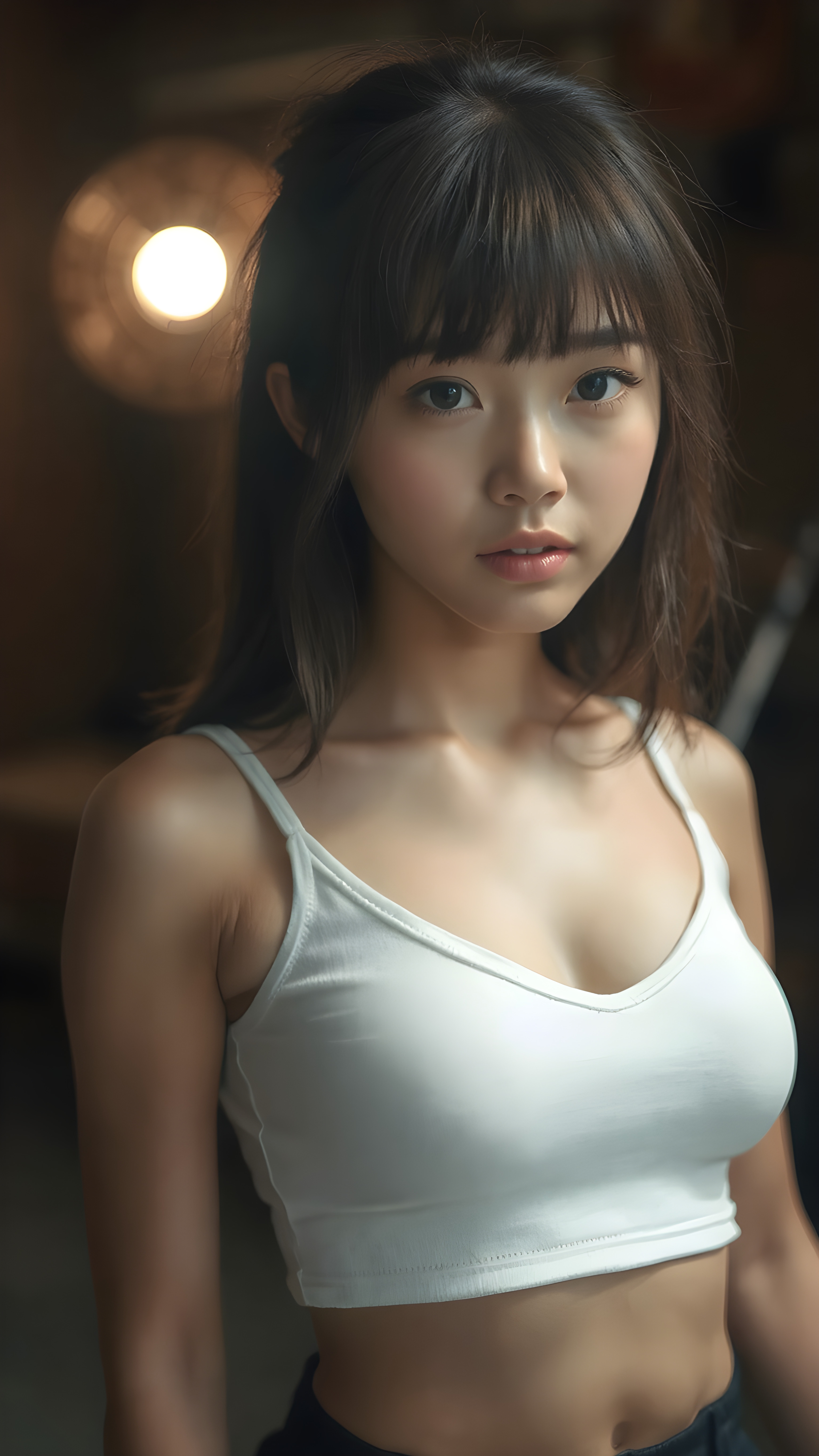 a beautifully captured (((super realistic full body photo))), featuring a (((young Japanese teen girl))) with hyper-realistic detailed skin textures and glossy lipstick-adorned lips, dressed in a (short tight white cropped tank top with a low v-neck, round short mini skirt) that perfectly complements her toned physique. Her striking ((bangs)) are artfully cut to frame her face perfectly, captured in a (professional studio photo shoot)