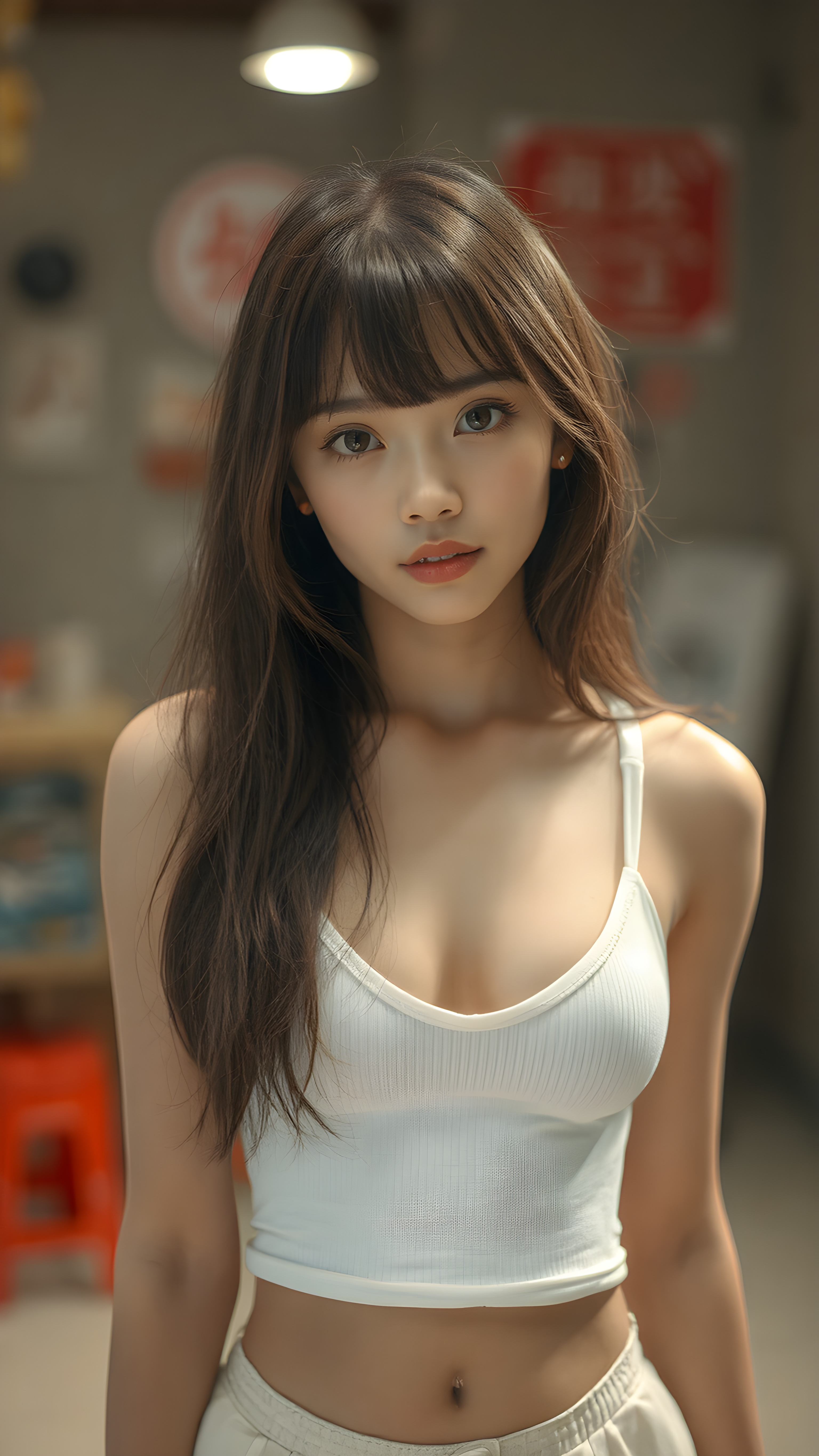 a beautifully captured (((super realistic full body photo))), featuring a (((young Asian teen girl))) with hyper-realistic detailed skin textures and glossy lipstick-adorned lips, dressed in a (short tight white cropped tank top with a low v-neck, round short mini skirt) that perfectly complements her toned physique. Her striking ((bangs)) are artfully cut to frame her face perfectly, captured in a (professional studio photo shoot)
