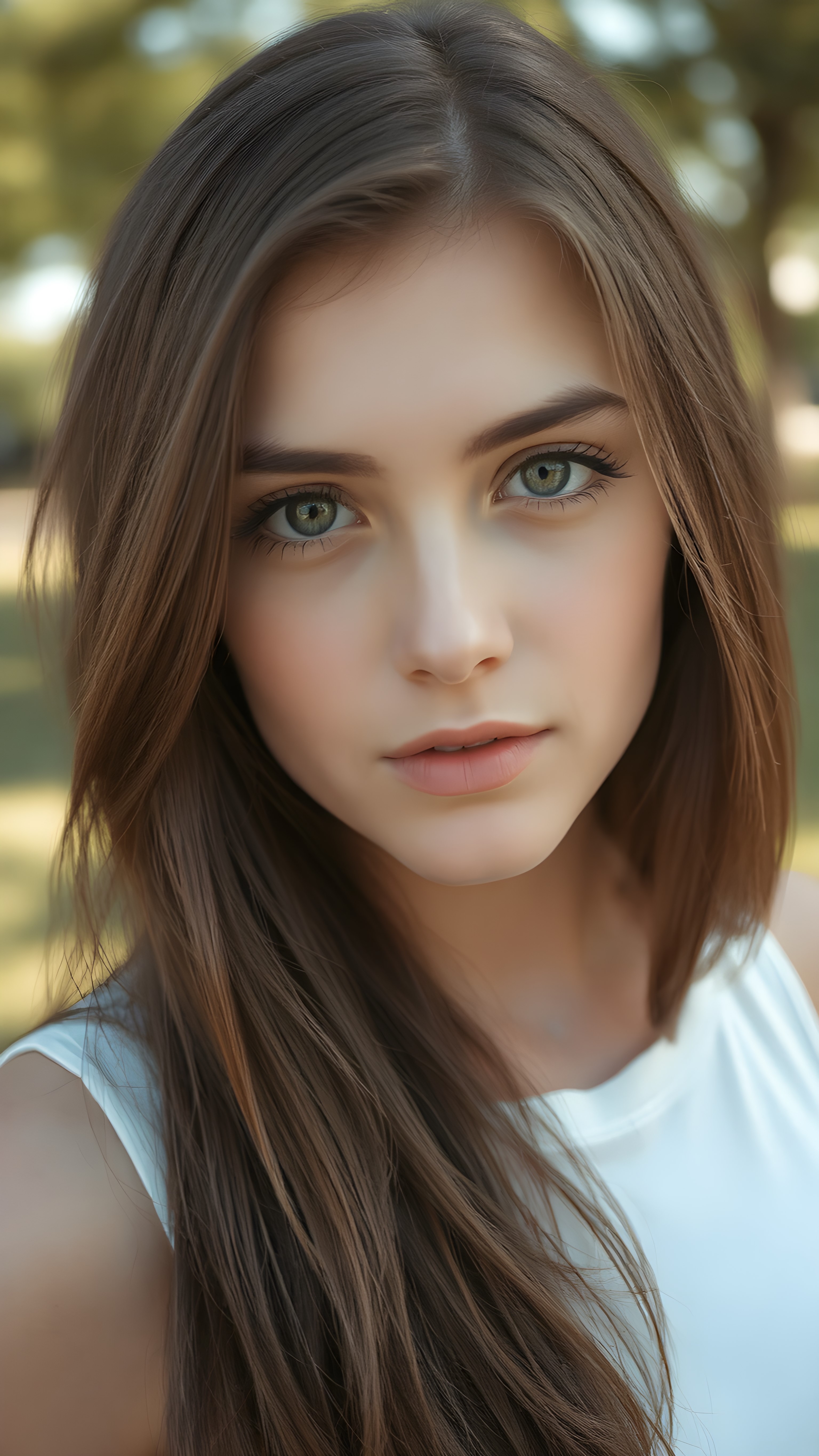 detailed and realistic close-up portrait ((1:3)) from a (((beautiful teen girl with (straight brown hair with soft layers) and brown eyes))), dressed in a (((white crop tank top))), perfect curved body, (sunny park in backdrop)
