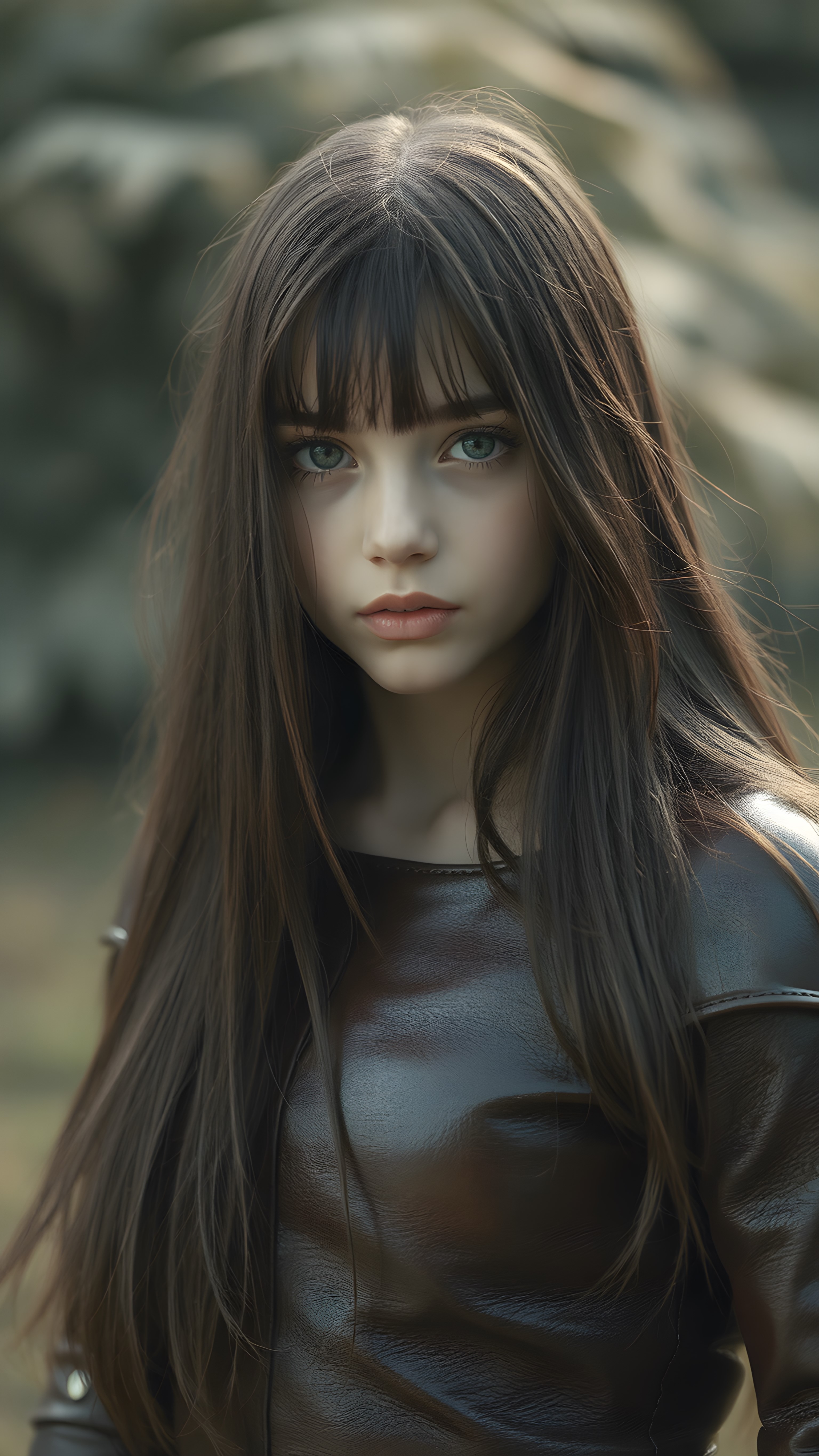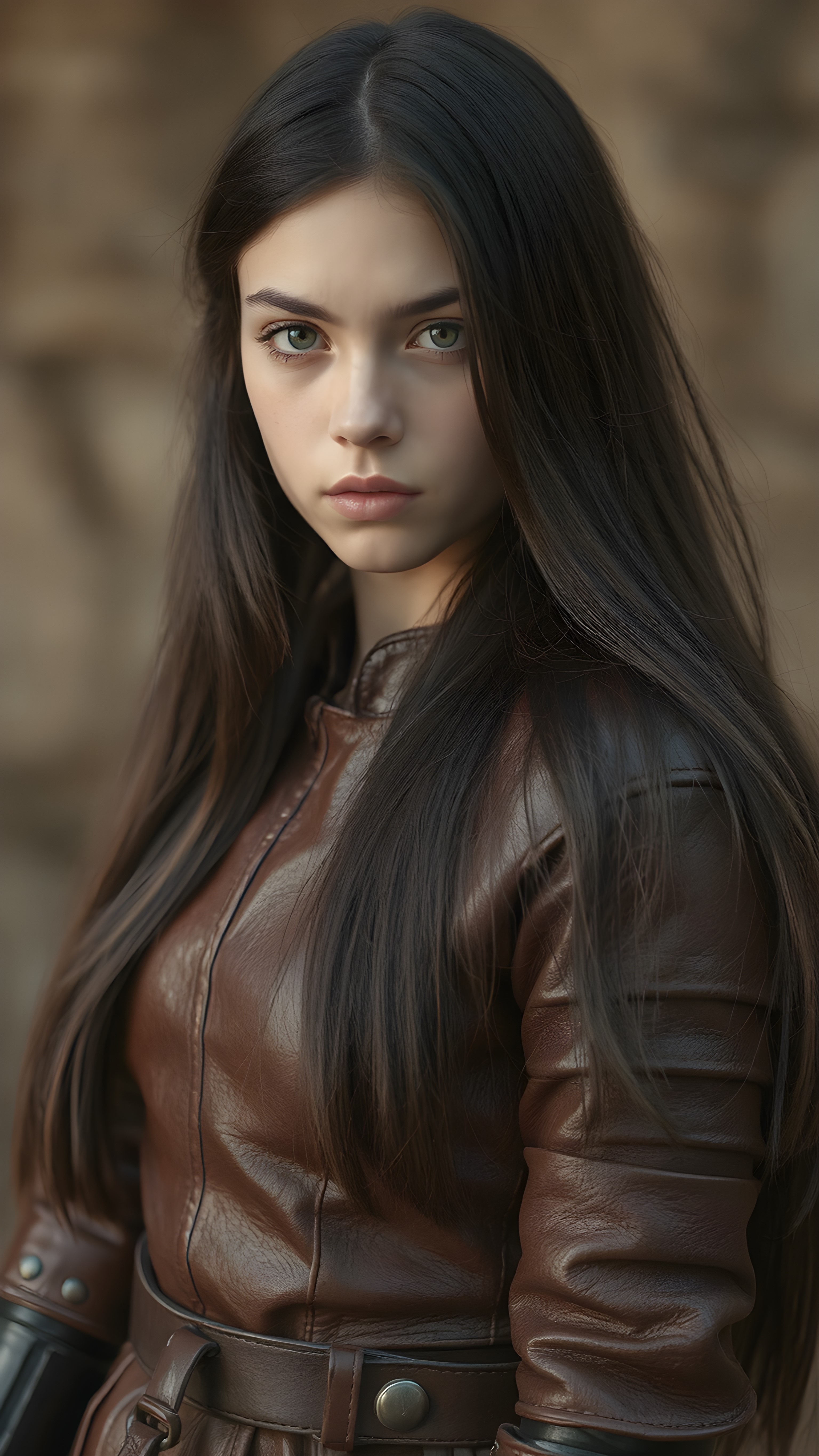 visualize a portrait: (((young girl with long, soft straight dark hair))), clad in flowing ((thin leather armor that reflect her (stunningly gorgeous figure)))