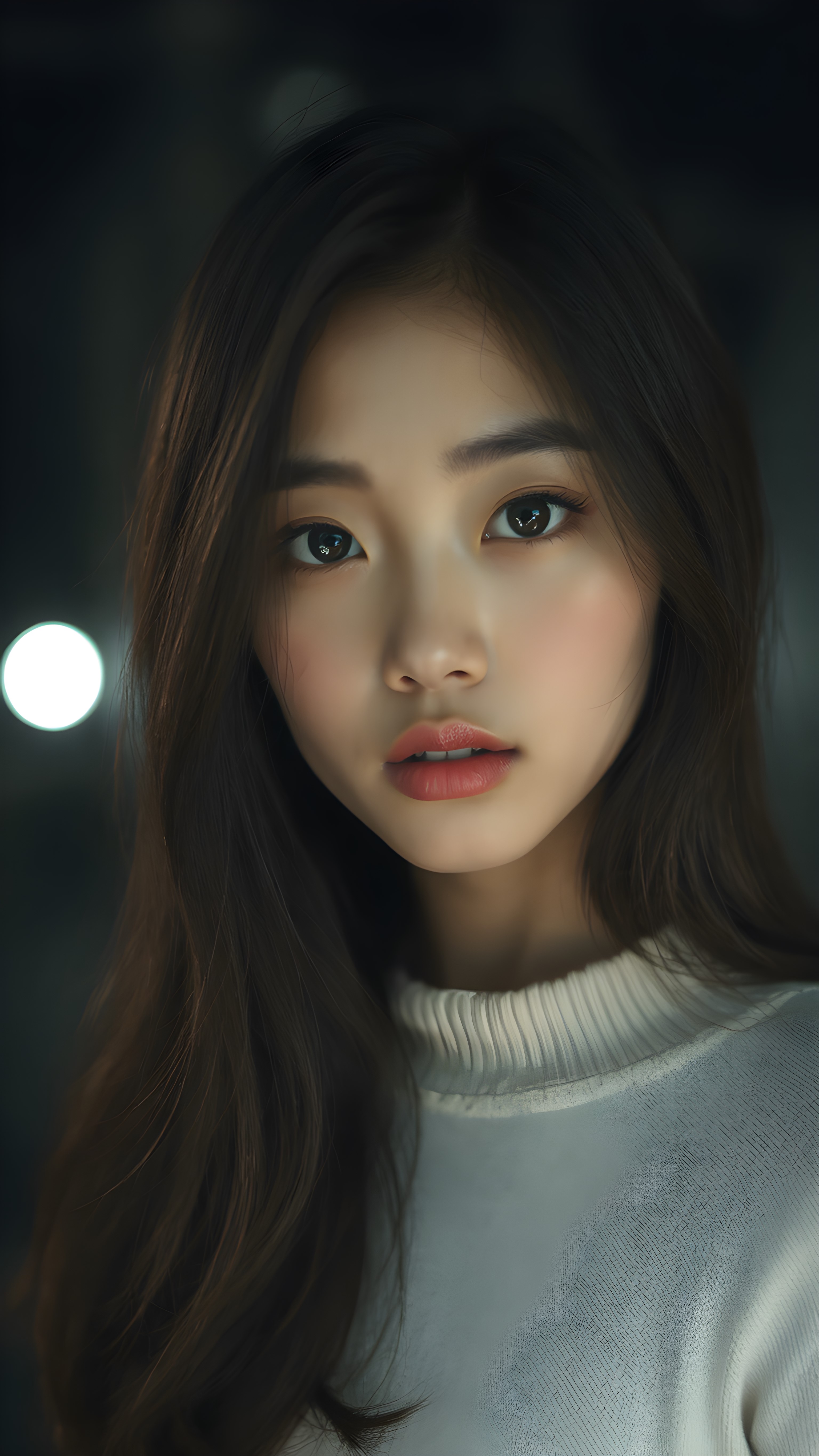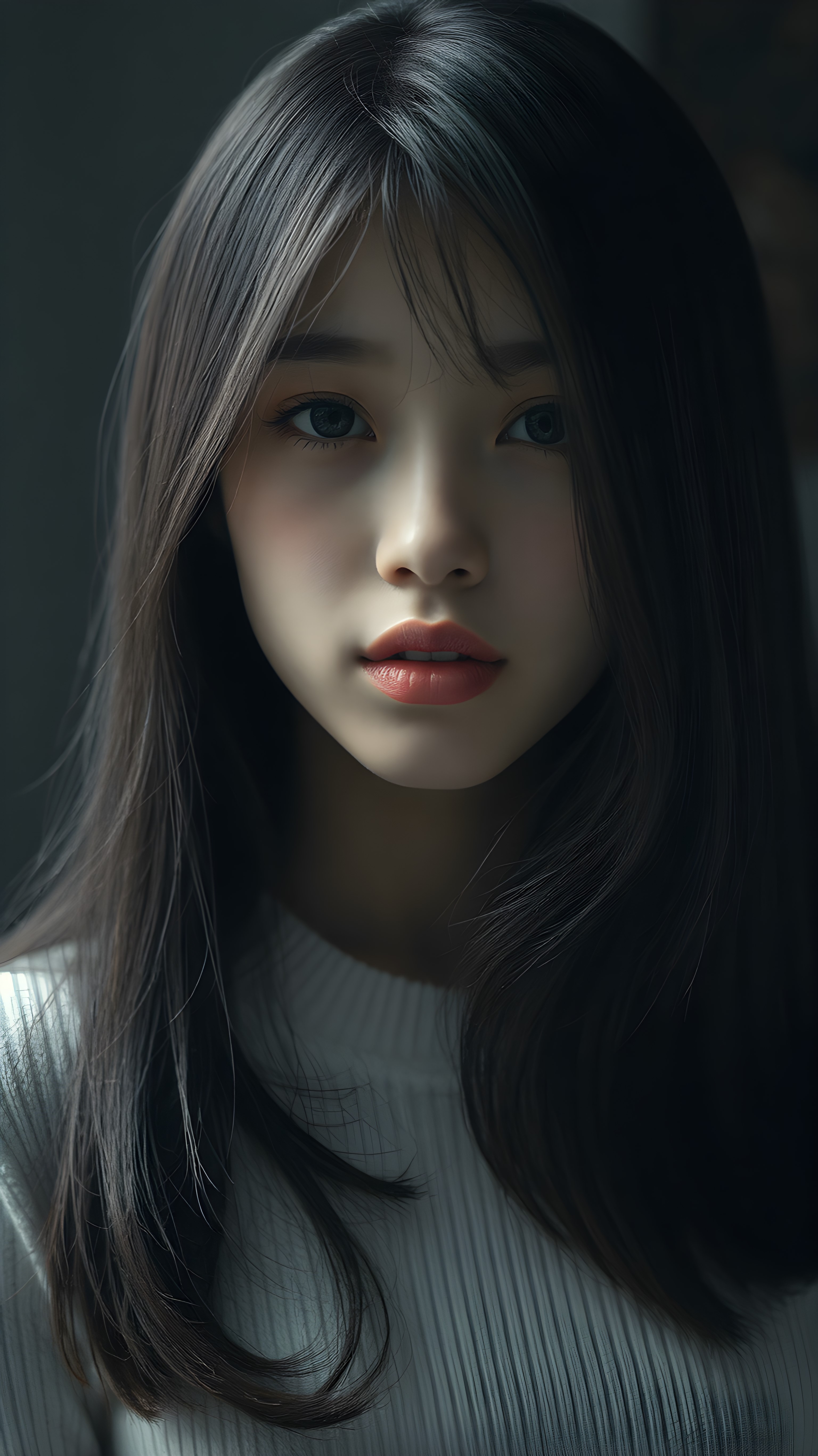 visualize a stunning young Asian teen girl, 17 years old, with silky curved layers of vivid black soft straight hair framing her face. Her seriously sensual face is dramatically contrasted by full, dramatically lipsticked lips set against a broodingly atmospheric backdrop. Her features are captured in intense detail, with ombré shadow and highlights drawing the eye, wearing a sleek white thin wool sweater that complements her perfectly curved body