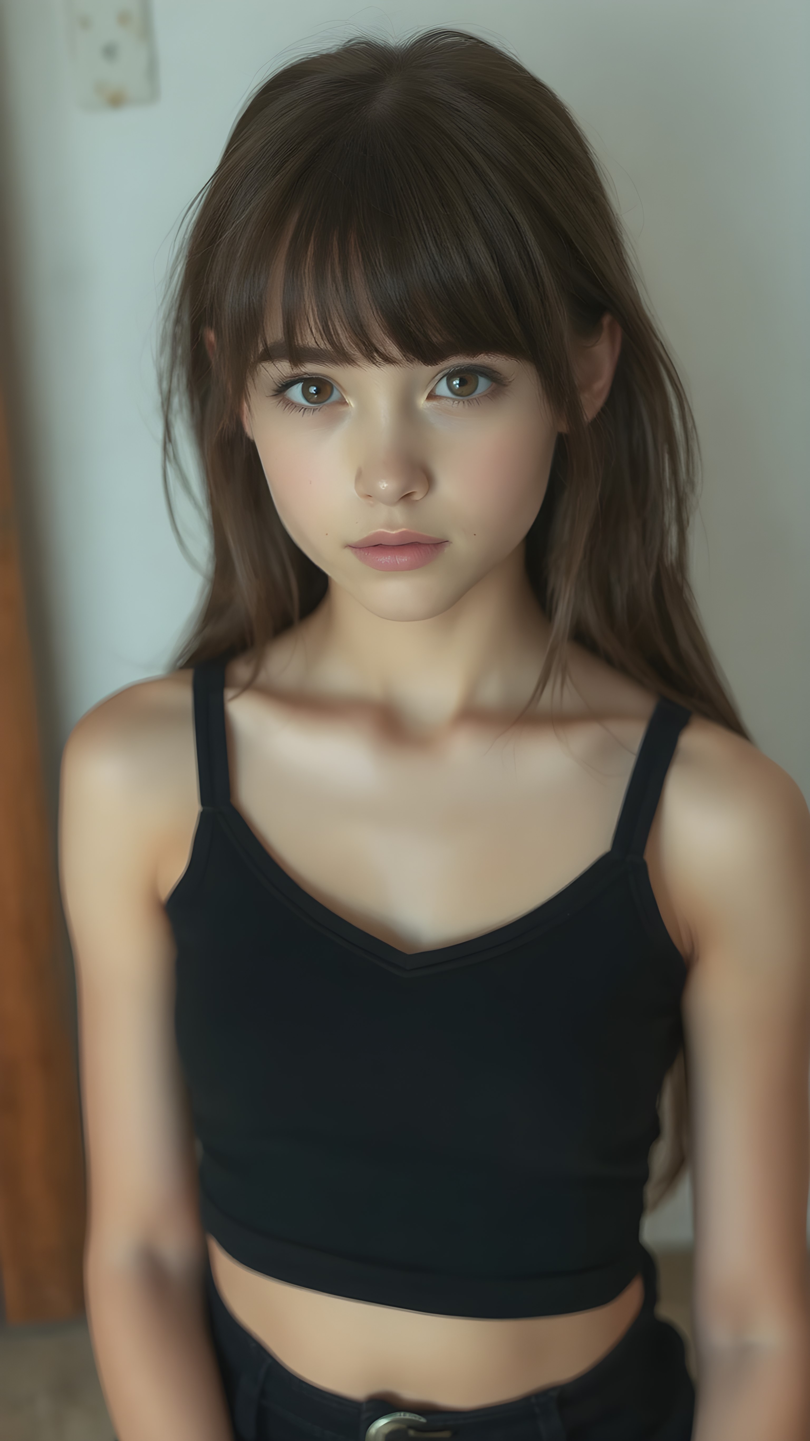 a beautifully captured (((super realistic full body photo))), featuring a (((young teen girl))) with hyper-realistic detailed skin, dressed in a (short tight black cropped tank top with a low v-neck that perfectly complements her toned physique, long soft detailed dark hair in bangs cut frame her round face