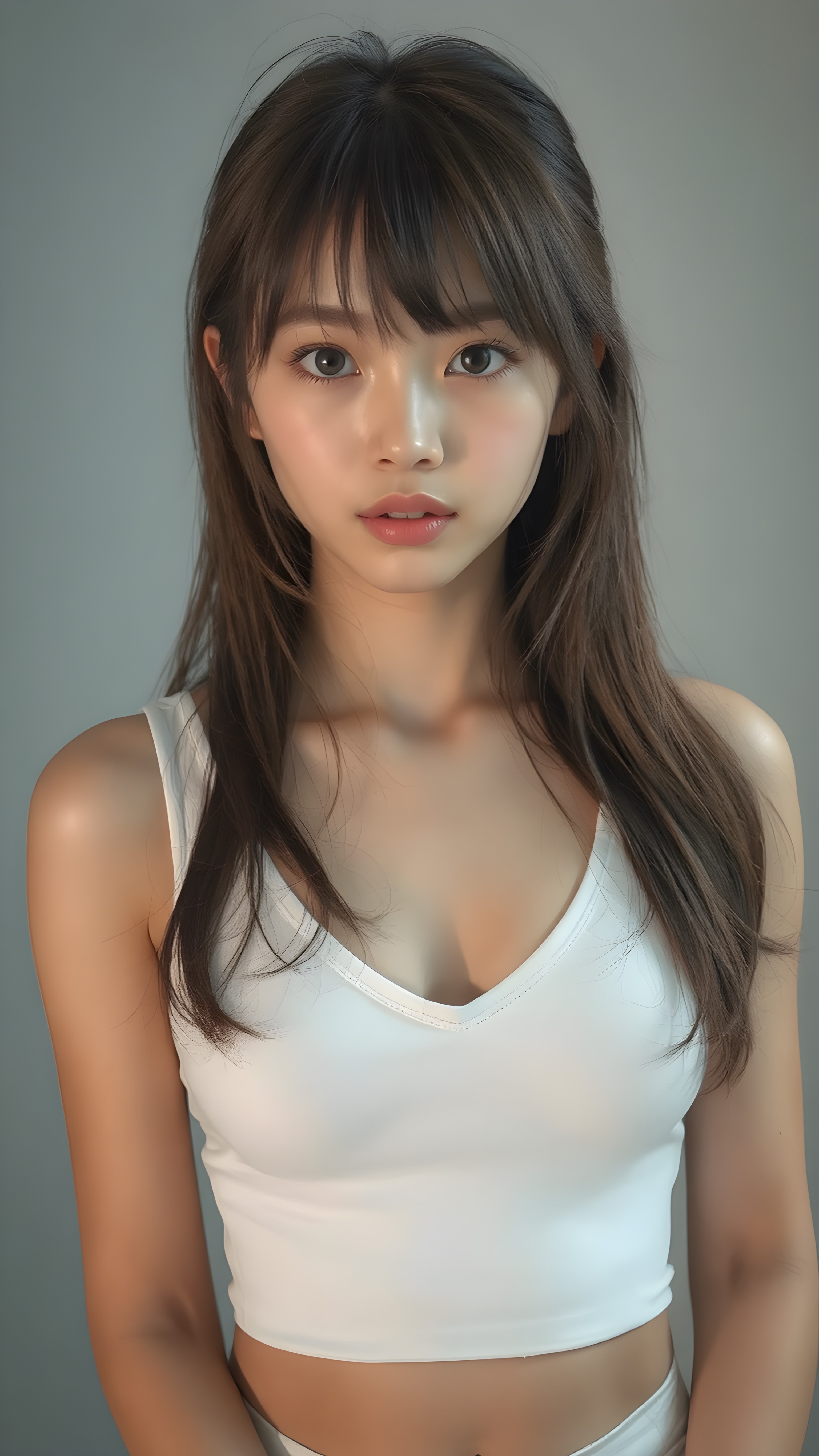 a beautifully captured (((super realistic full body photo))), featuring a (((young Japanese teen girl))) with hyper-realistic detailed skin textures and glossy lipstick-adorned lips, dressed in a (short tight white cropped tank top with a low v-neck, round short mini skirt) that perfectly complements her toned physique. Her striking ((bangs)) are artfully cut to frame her face perfectly, captured in a (professional studio photo shoot)