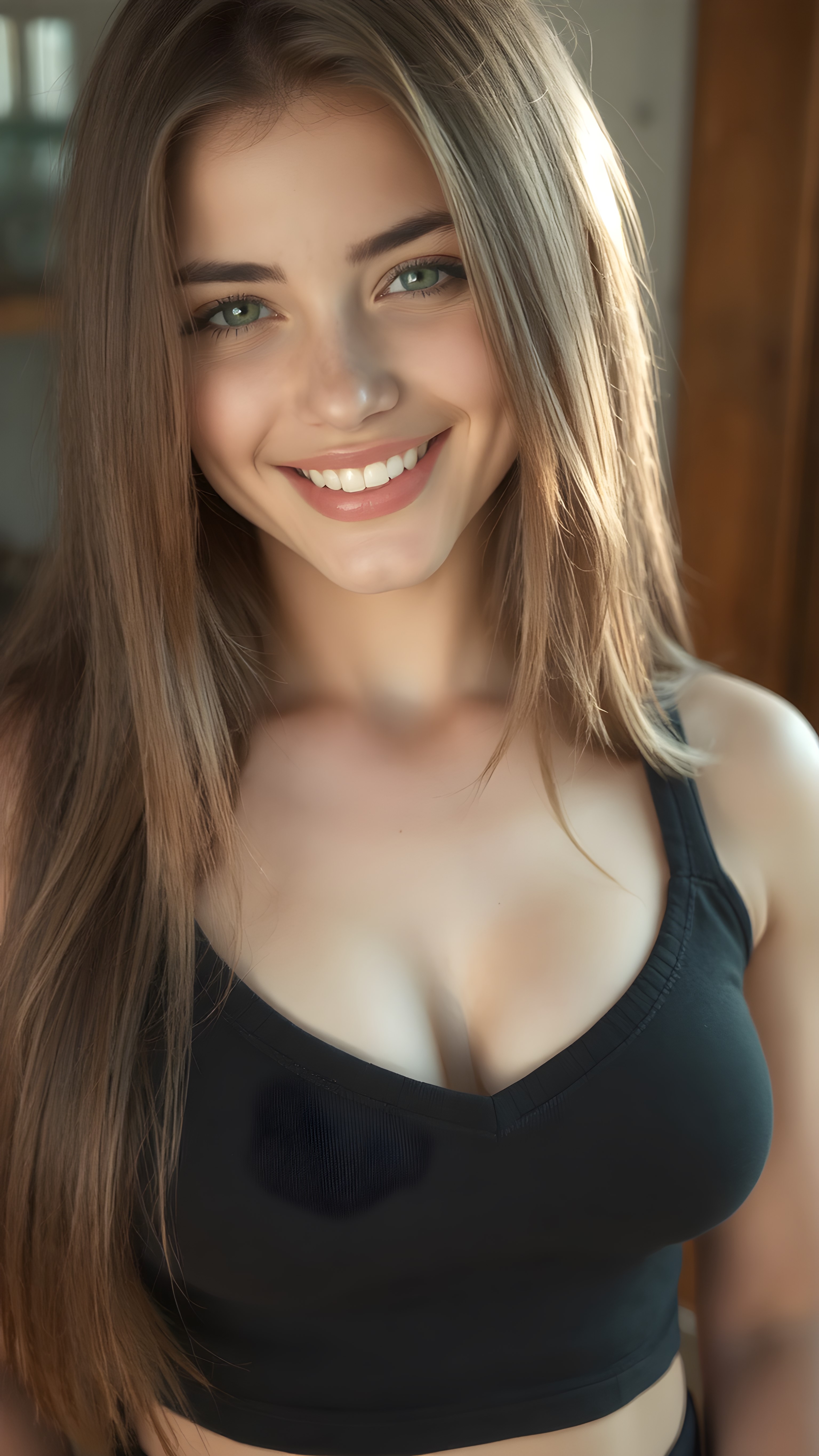 a (((super realistic full length photo))), capturing a (((beautifully proportioned young well busty teen girl))) with luxurious, long straight brown soft hair, complemented by (perfectly white teeth) and a (tiny, yet incredibly defined v-neck on her short, tight tank top. The photo exudes a sense of (extreme clarity and detail), highlighting every aspect of her features. Her face is seen in a full-body shot, against a (sunny backdrop that perfectly complements her features). She is seen from a side shot, emphasizing her (striking beauty) and perfect proportions. The photo is seen in a (high-resolution, ultra-realistic detail), capturing the essence of a (super realistic moment).
