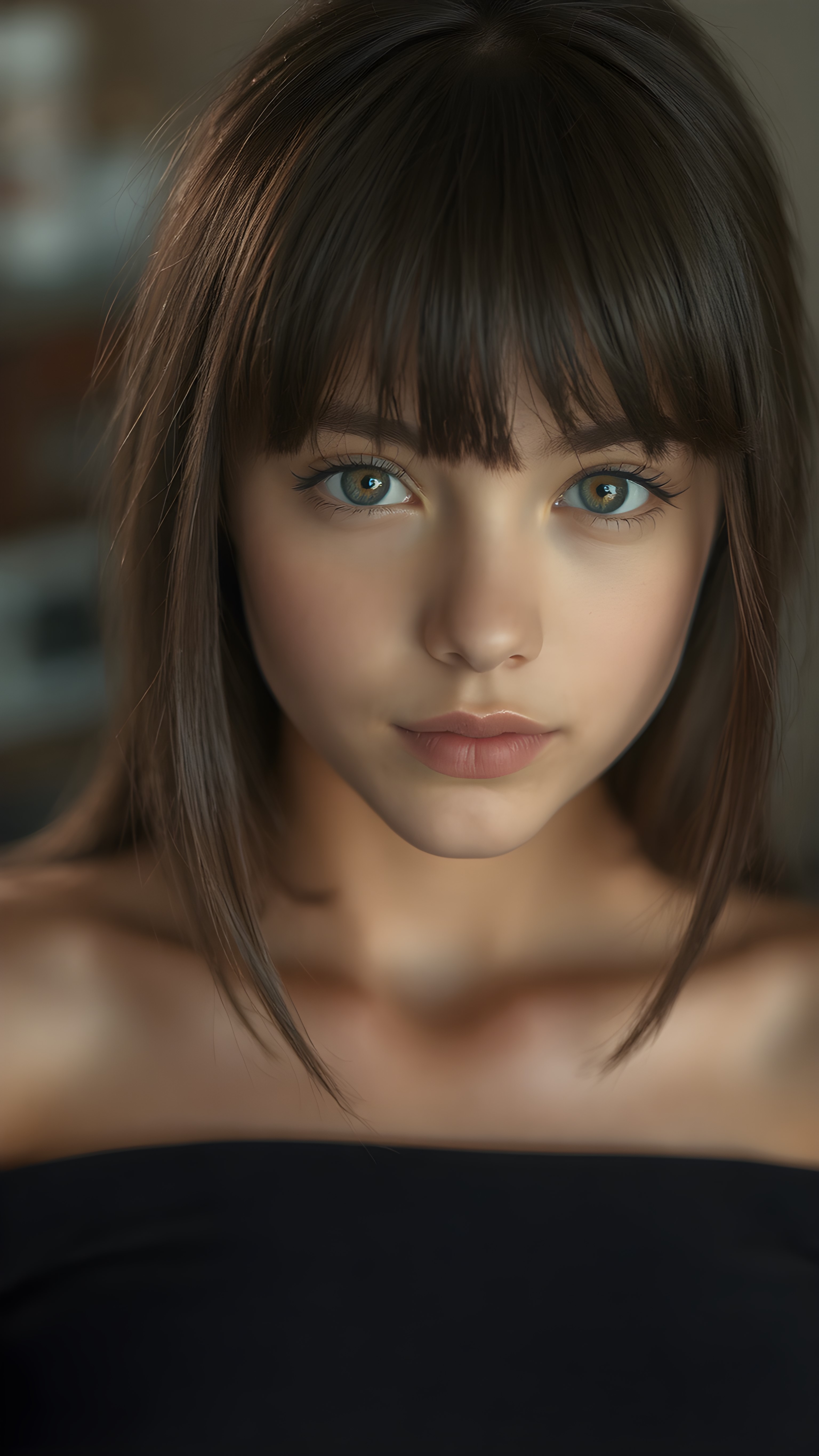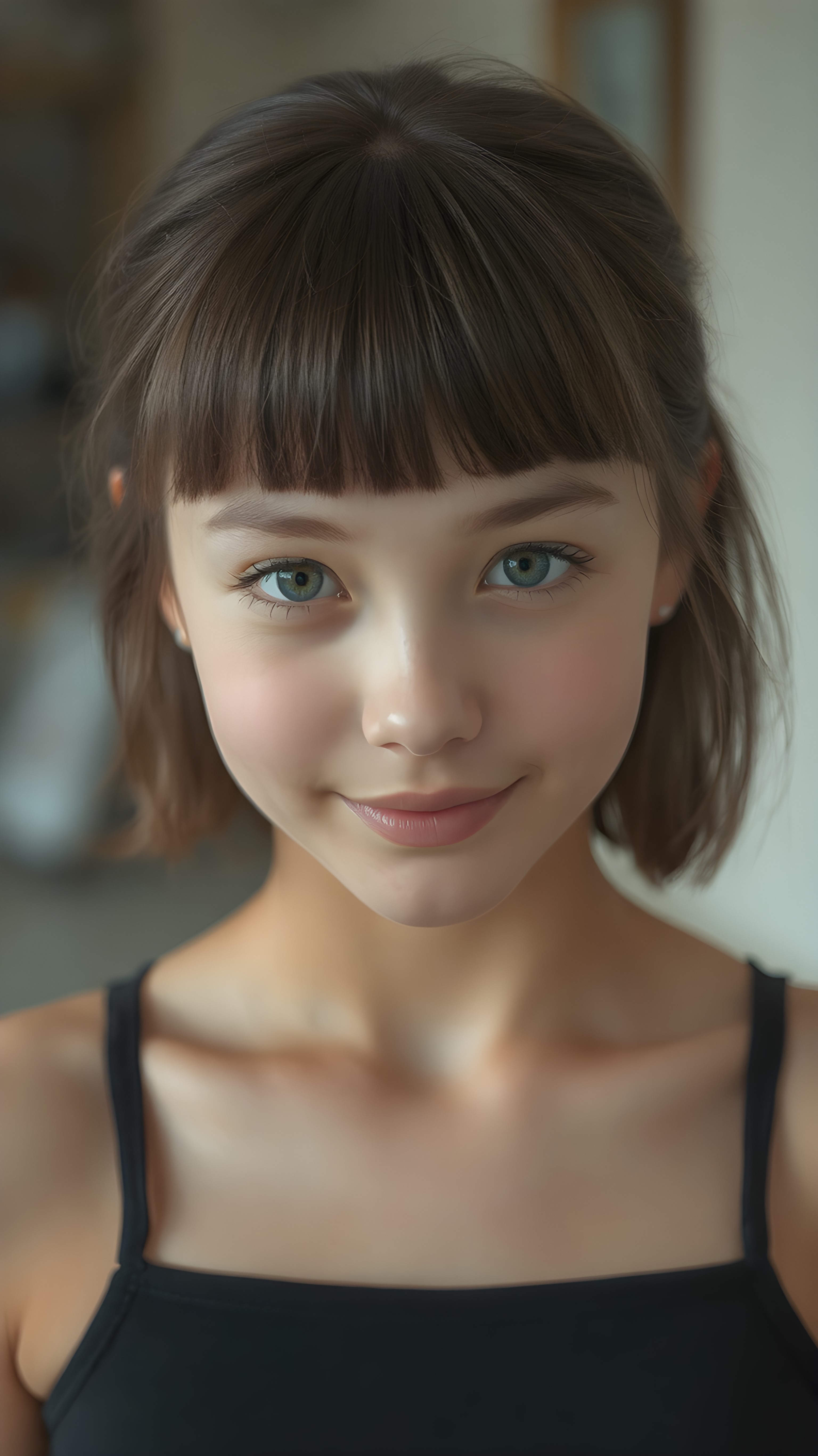 a (((super realistic full body photo))), showcasing a (((beautiful young teen girl))) who exudes the essence of a (professional model), with sleek, exceptionally well-crafted bangs that frame her face perfectly. Her skin is exceptionally clear and detailed, with a (short tight black crop top) that complements her toned, athletic figure, and (perfectly symmetrical round pupils) that make eye contact with the camera. Her smile is both natural and extremely well-crafted, embodying an (ultimate realism). (((The focus on her face and eyes ensures that every detail is highly advanced and ultra-realistic, from the texture of her skin to the quality of her light.)))