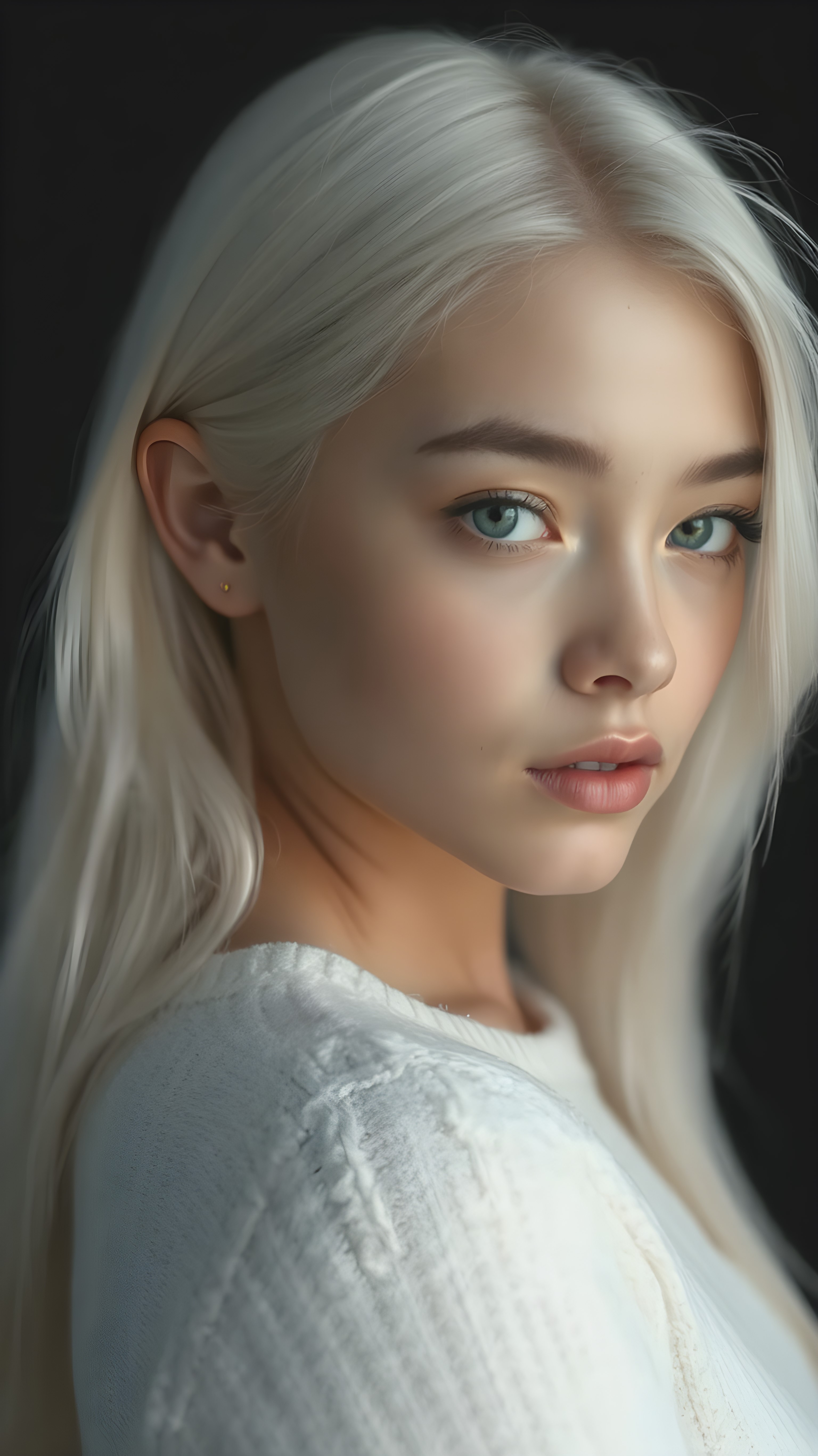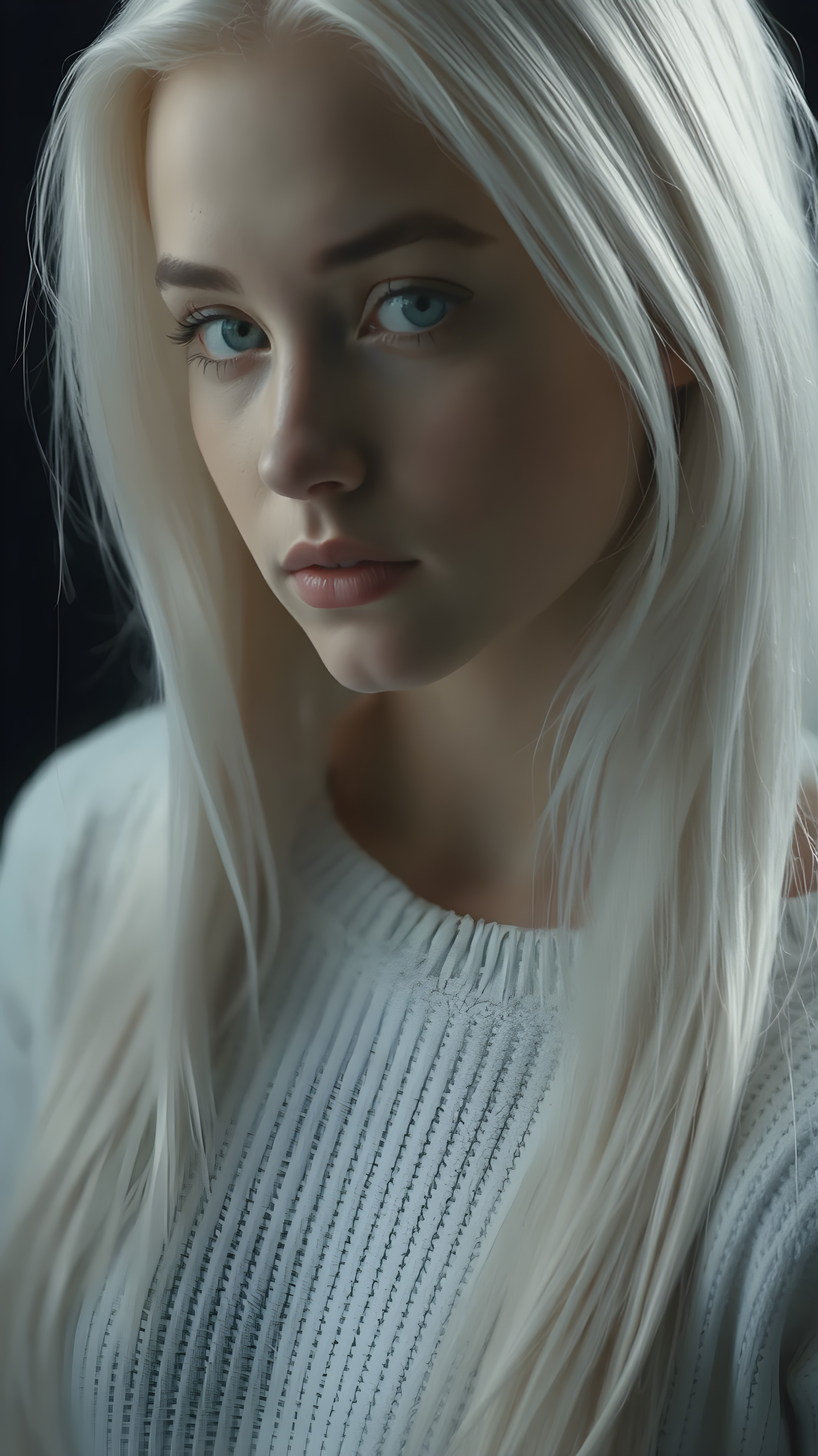 ((stunning)) ((gorgeous)) a beautiful realistic teen girl, perfect portrait, perfect curved body, long straight platinum white hair, wears a white sweater, white silhouette, black background