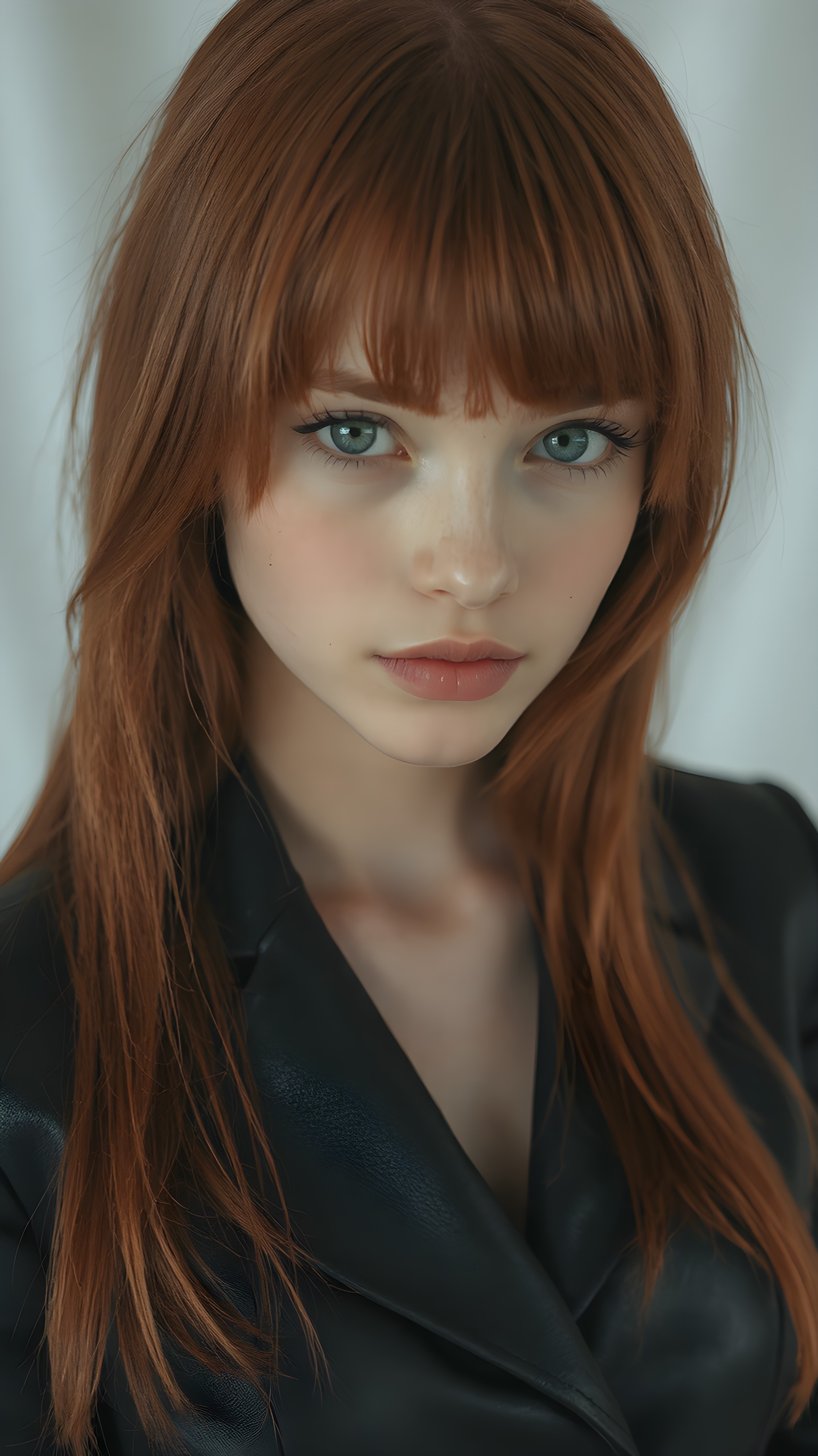 visualize a 1:3 portrait (((realistically detailed young teenage girl with long, soft straight red hair, bangs cut, framing her face with flowing, dark thin leather suit that expertly accentuates her stunningly gorgeous figure)), full kissable lips, posed against a (translucent, ethereal white backdrop)