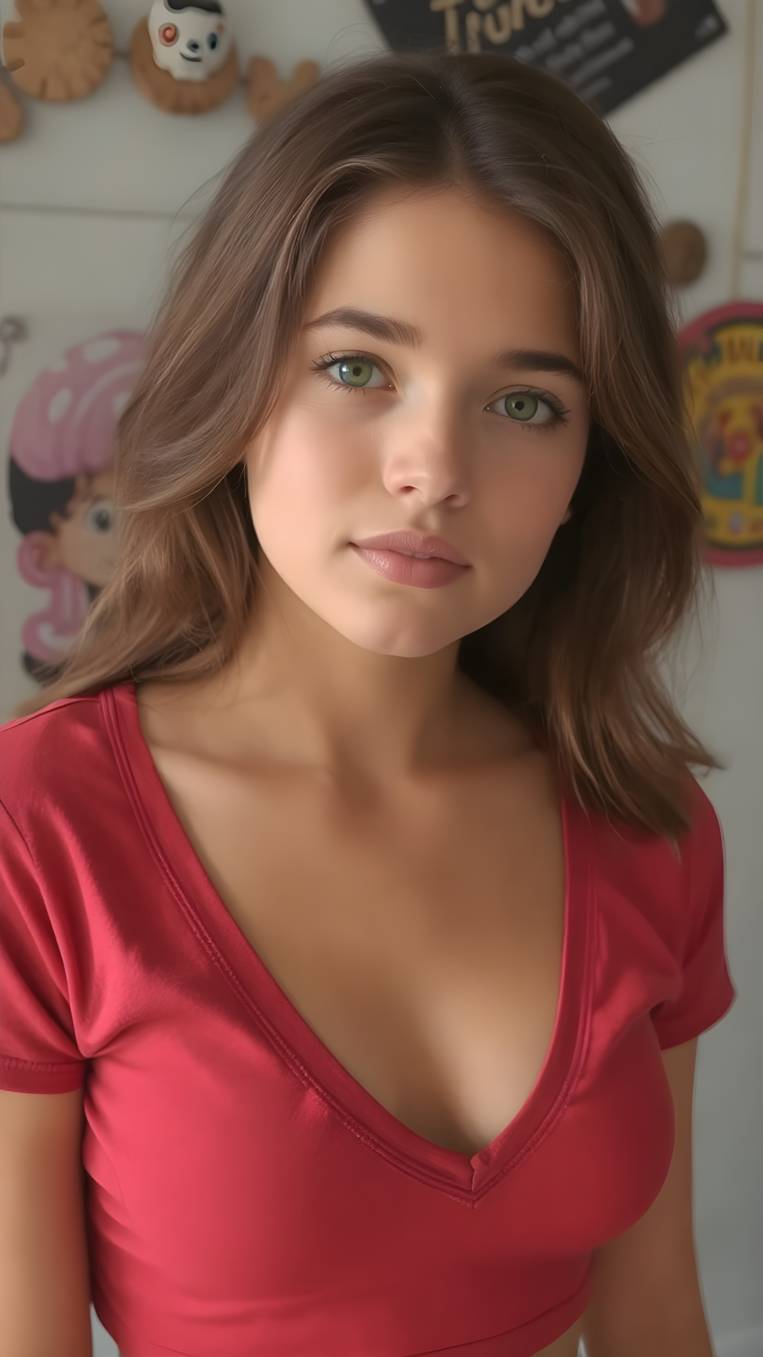 a realistic photo from a cute young teen girl, age 16, round face, and a sexy, womanly curves, she wears a short cropped t-shirt, deep v-neck, open front
