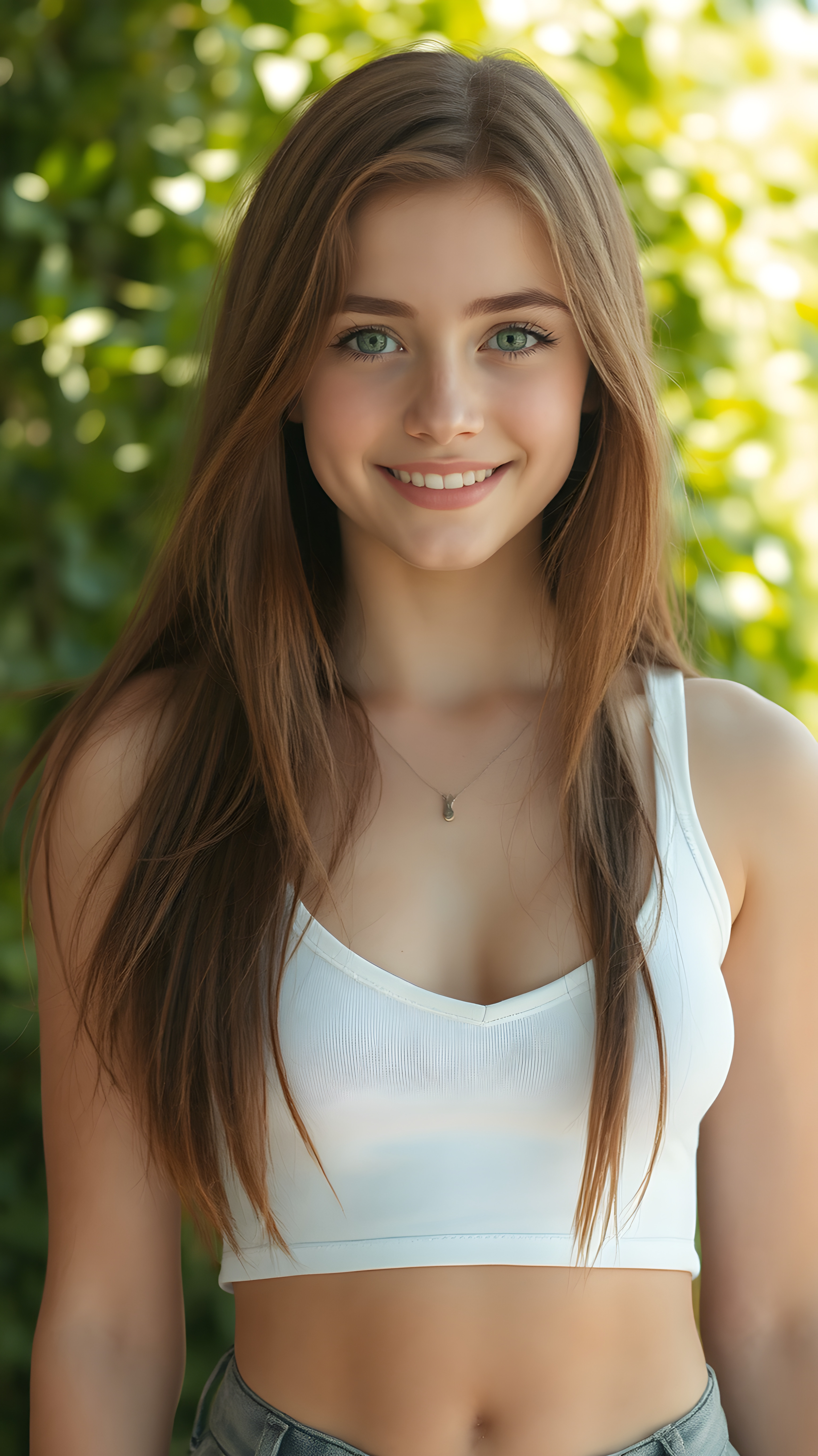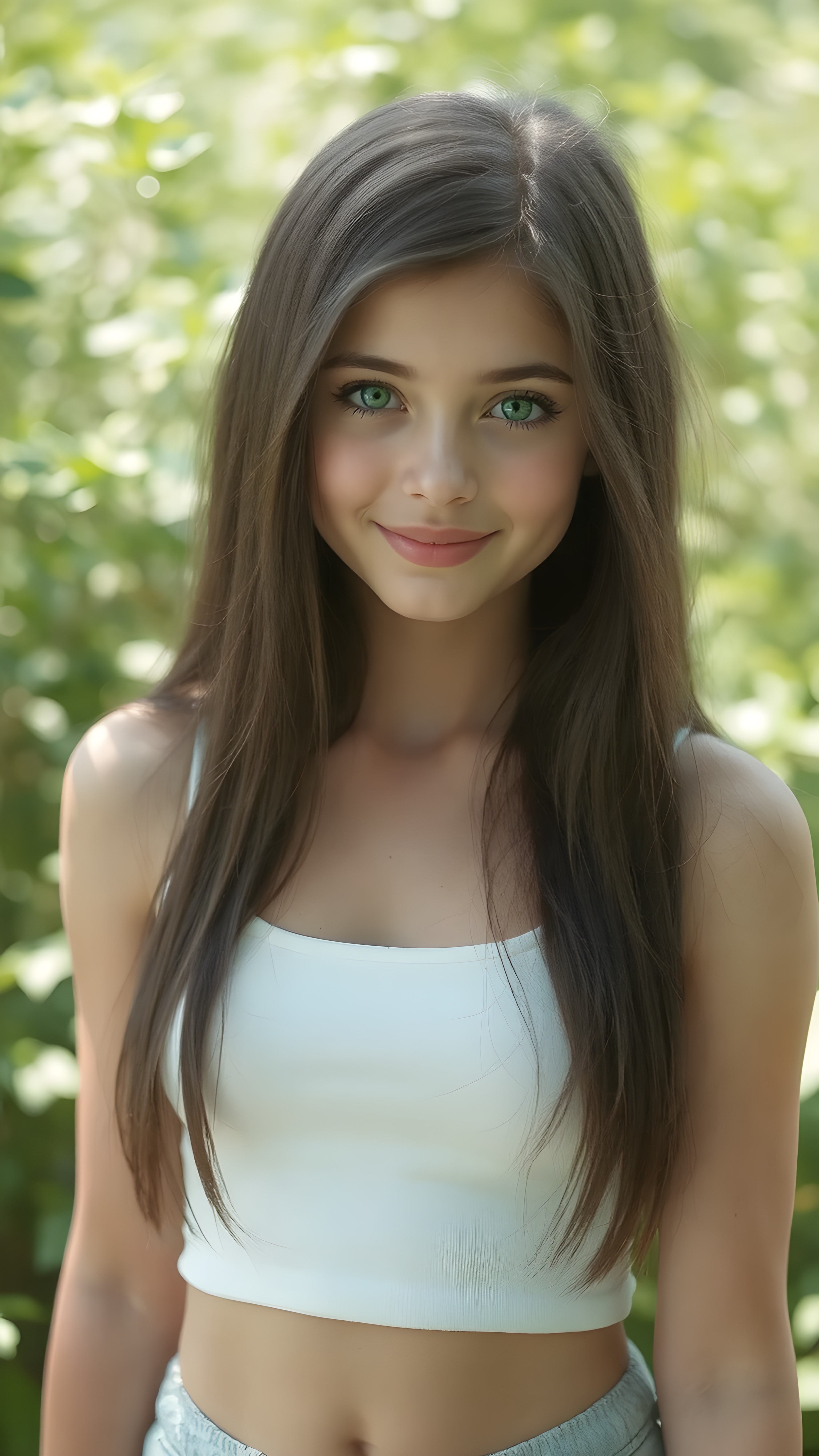a (((super realistic full body portrait))) featuring a (((beautifully proportioned young teen girl, 13 years old))), round face, full lips, with luxurious ((long, straight jet soft auburn hair)) and ((bright green eyes)), dressed in a (((super short, tight white crop top tank top with deep v-neck))), show her belly button, which perfectly complements her sleek, with a (sunny green backdrop) that gives off a (fantastical, whimsical vibe). Her smile is both friendly and sophisticated