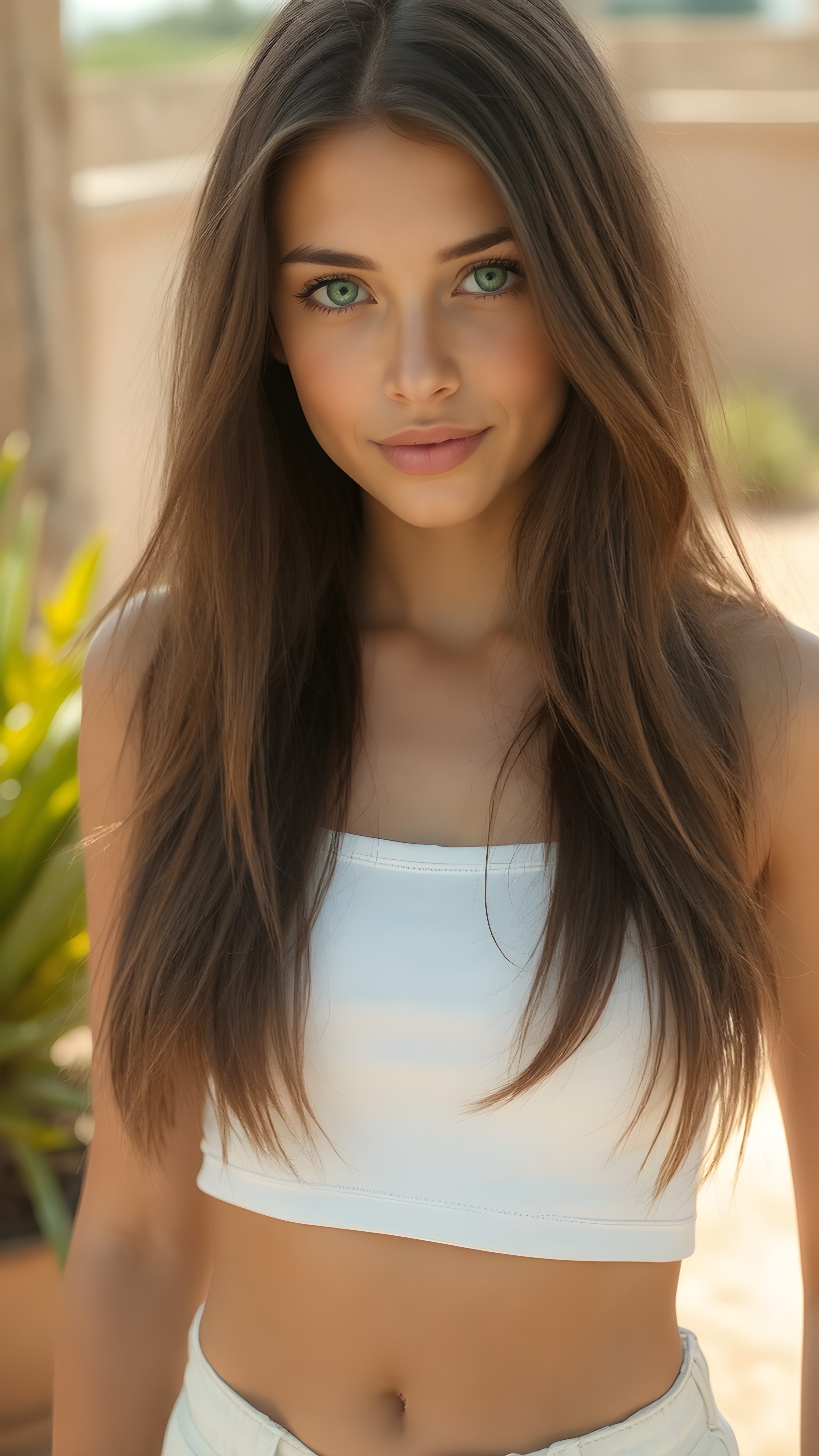 a (((super realistic full body photo))) featuring a (((beautifully stunning and gorgeous young teen girl))) with luxurious ((long, straight jet hair)) and ((bright green eyes)), dressed in a (((super short, tight white crop top tank top))), show her belly button, against a sunny backdrop