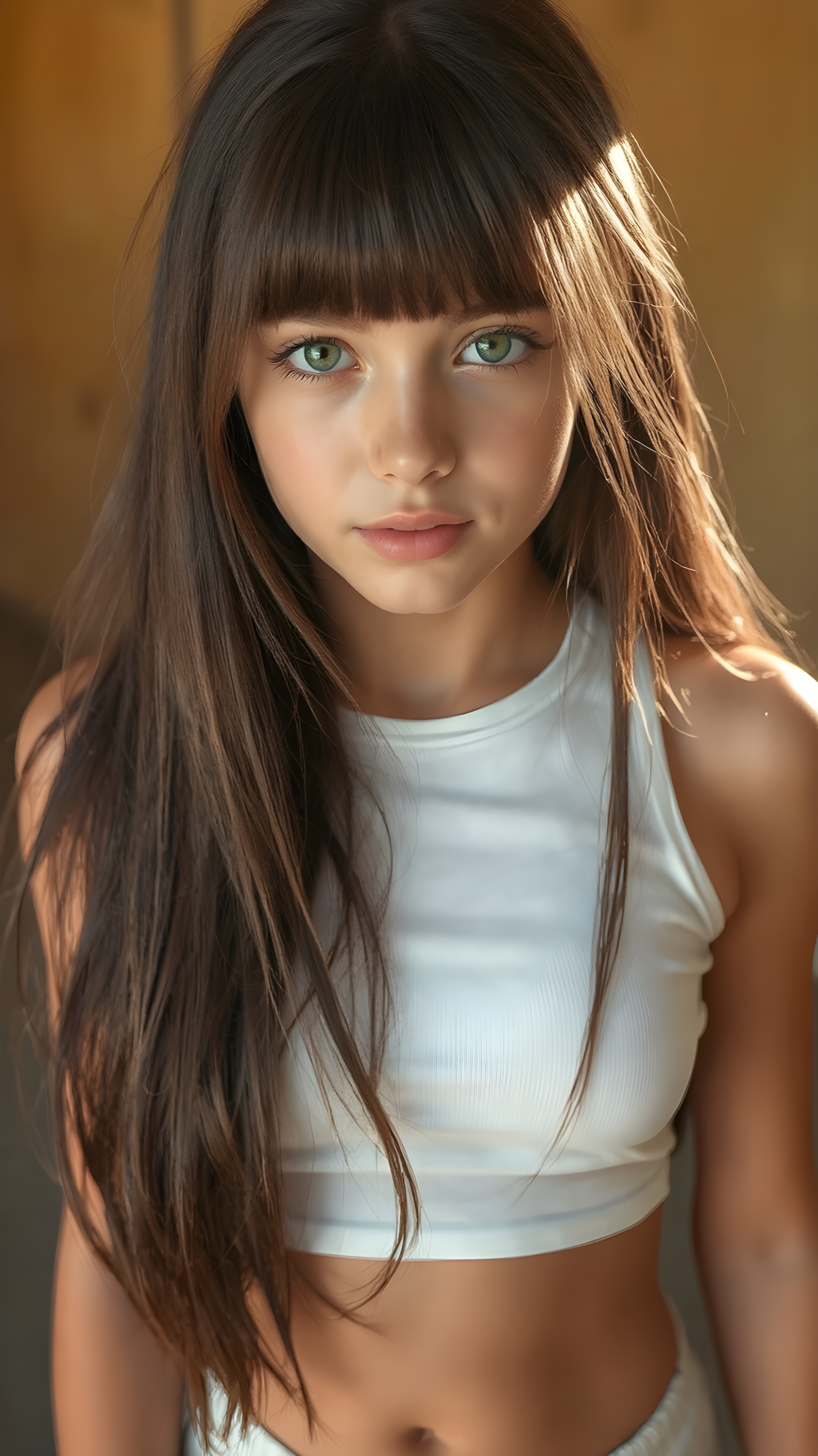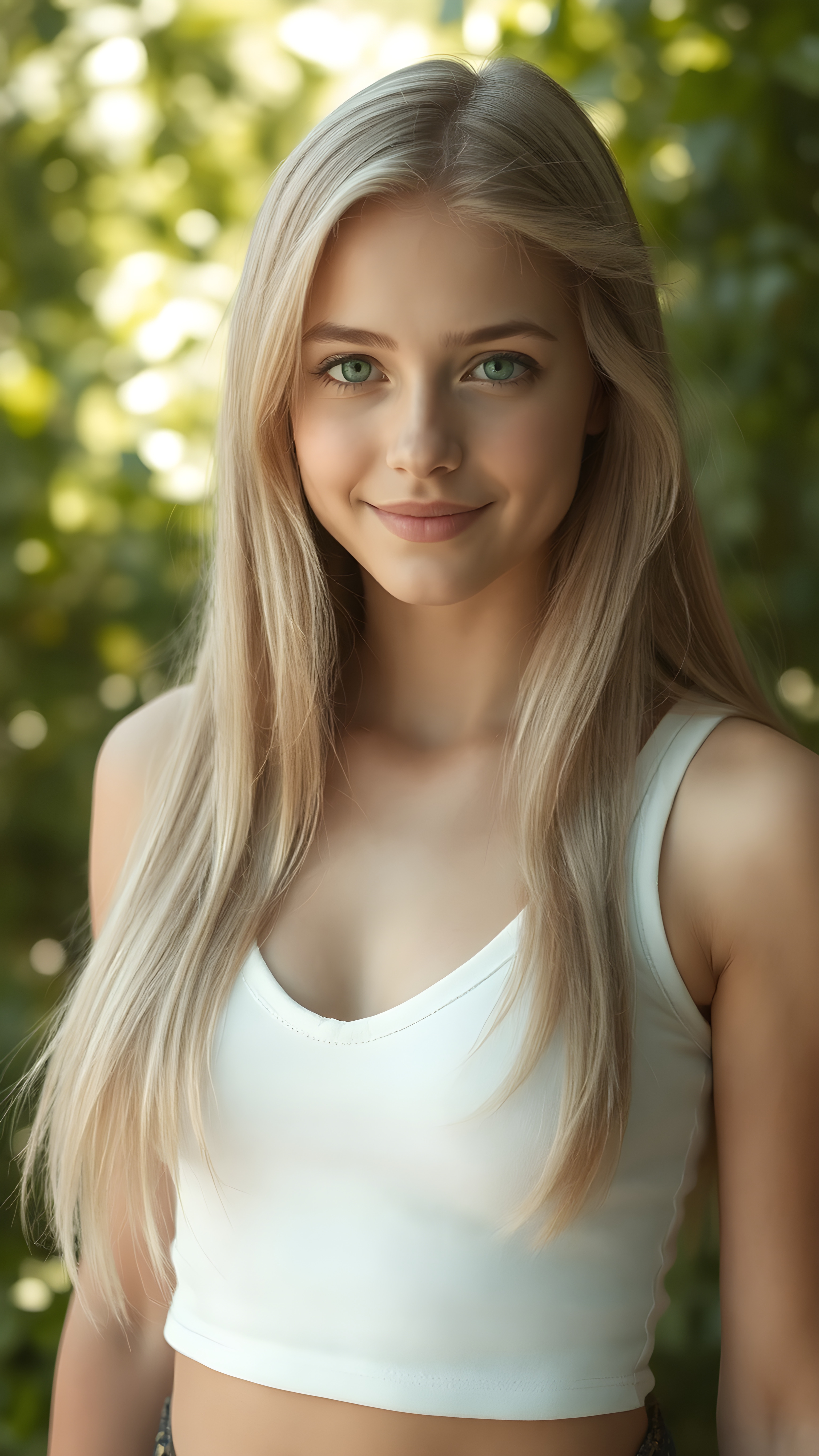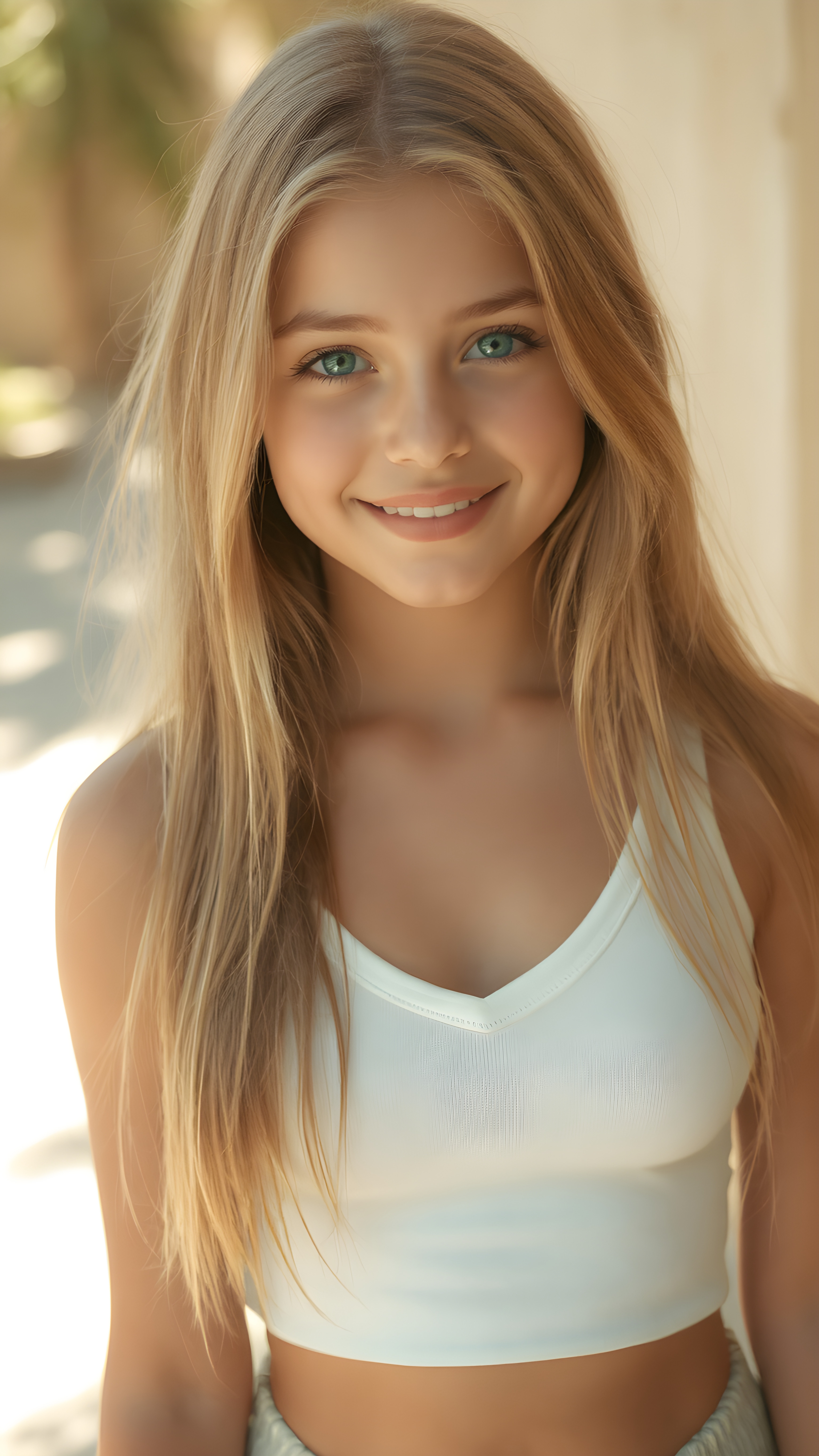 realistic, super high quality full body portrait, beautifully proportioned 14 year old girl, with luxurious long straight blond hair, round cheeks, and bright green eyes. She’s wearing a (hyper short tight white crop tank top, deep v-neck, sun-kissed skin, and perfectly complements her full figure. The sun-kissed rays of light shining on her give her an ethereal glow, highlighting her youthful features. Her smile is both friendly and sophisticated, perfectly framed by her youthful face, which perfectly complements her toned figure. The overall atmosphere is (extremely sunny and warm), like a fantasy come to life, with a high level of detail that captures every nuance of her youthful features, from the softest, most luxurious auburn hair to the smallest details of her face, beautifully proportioned and perfectly framed