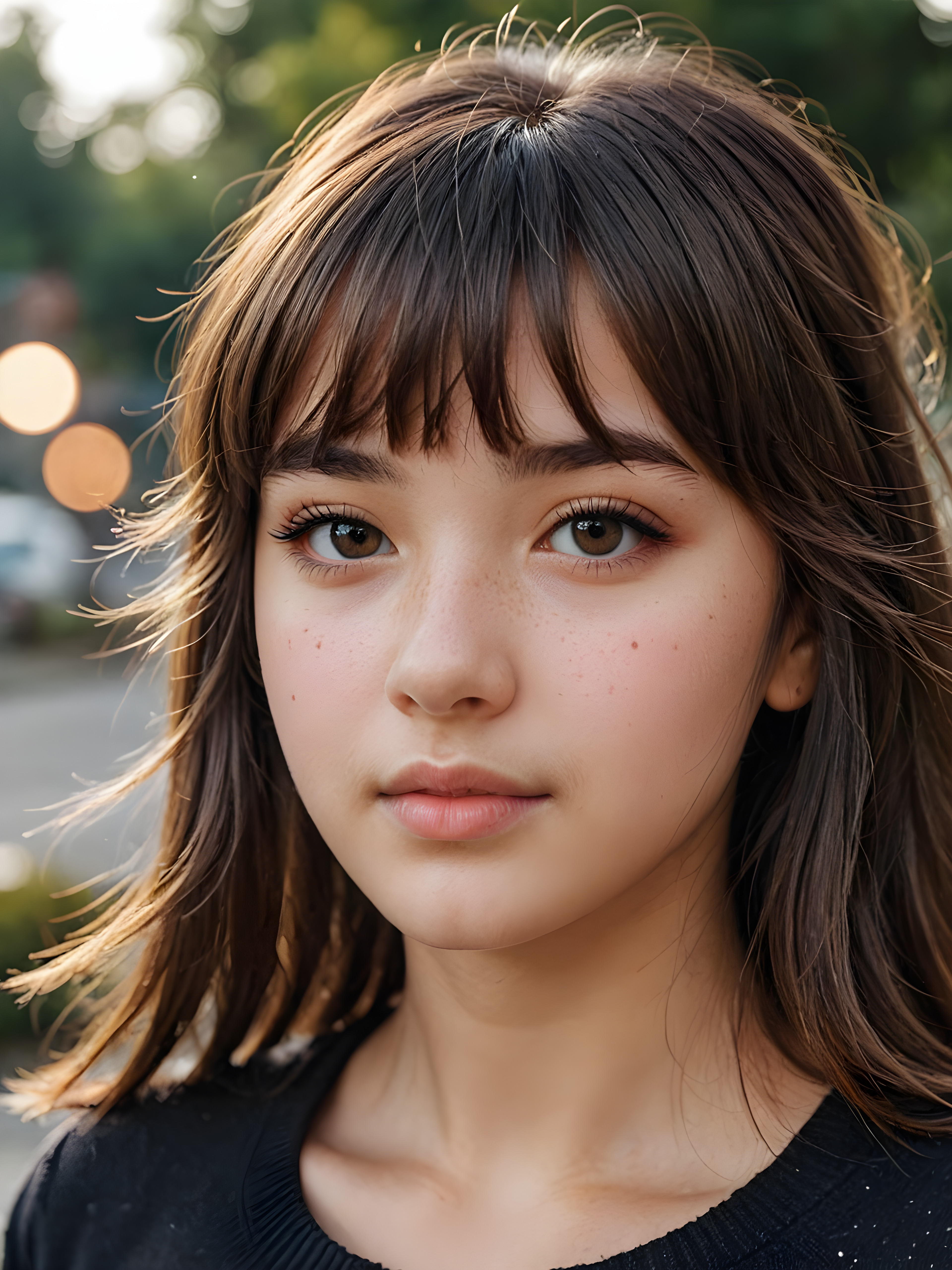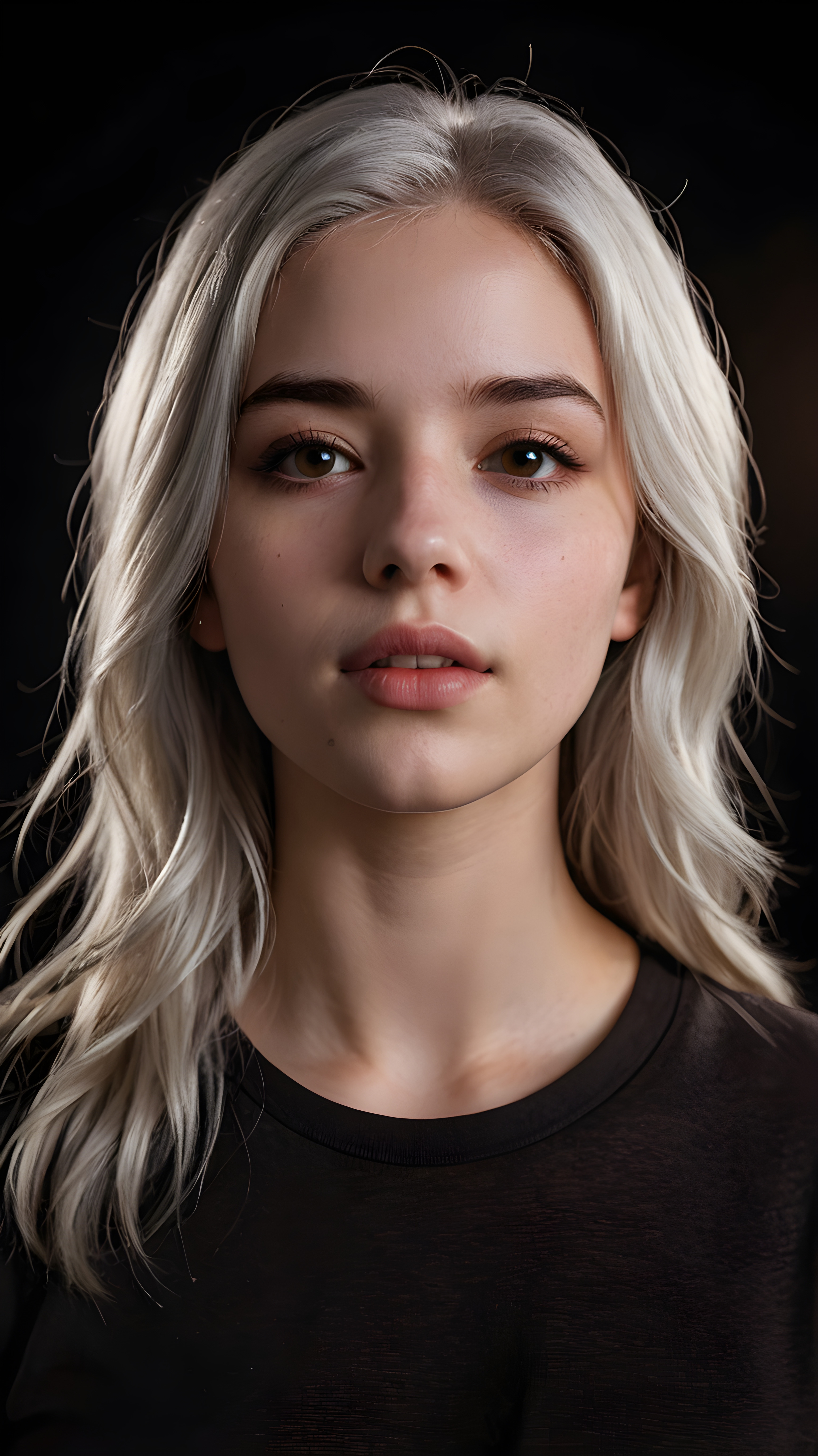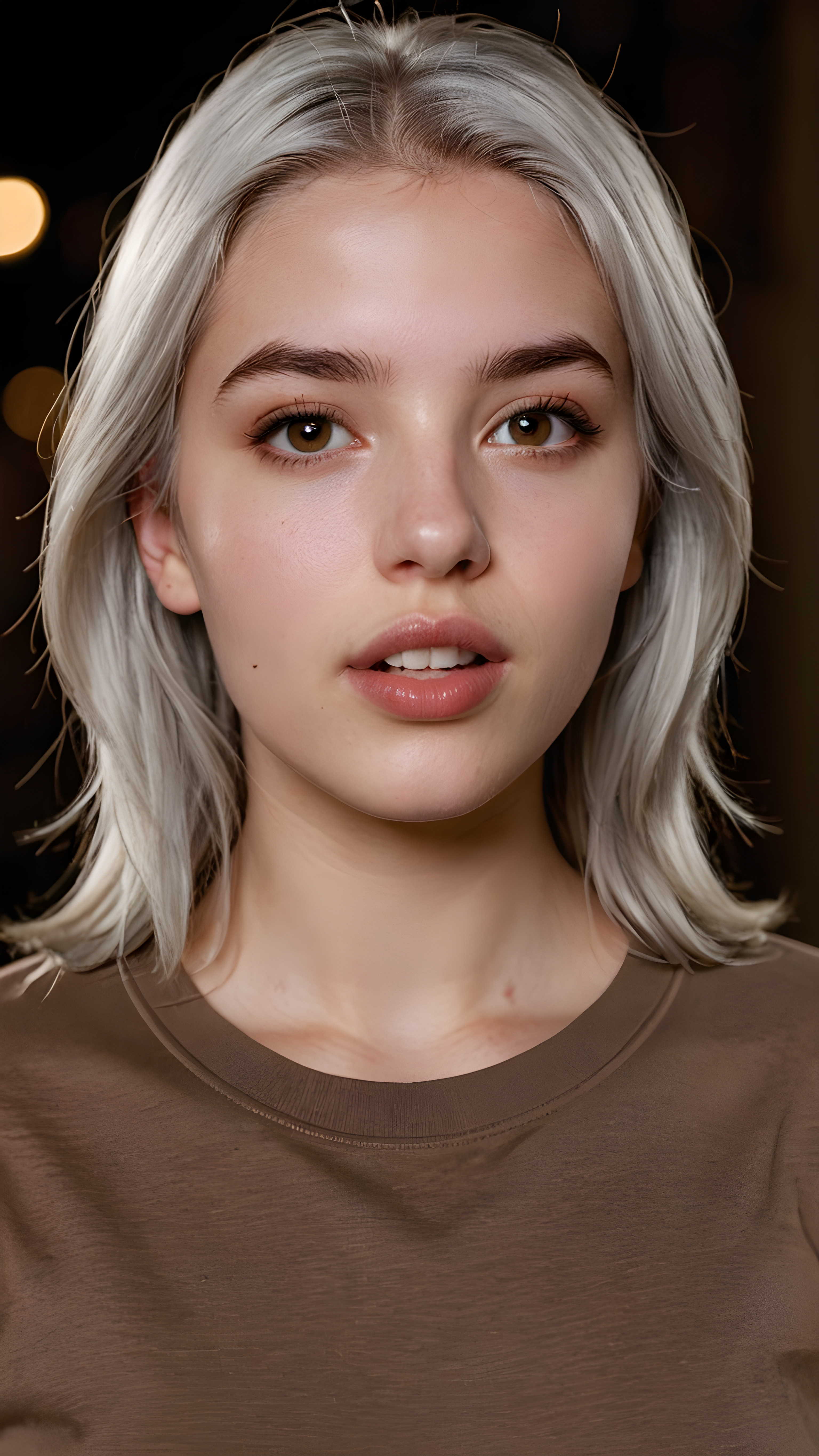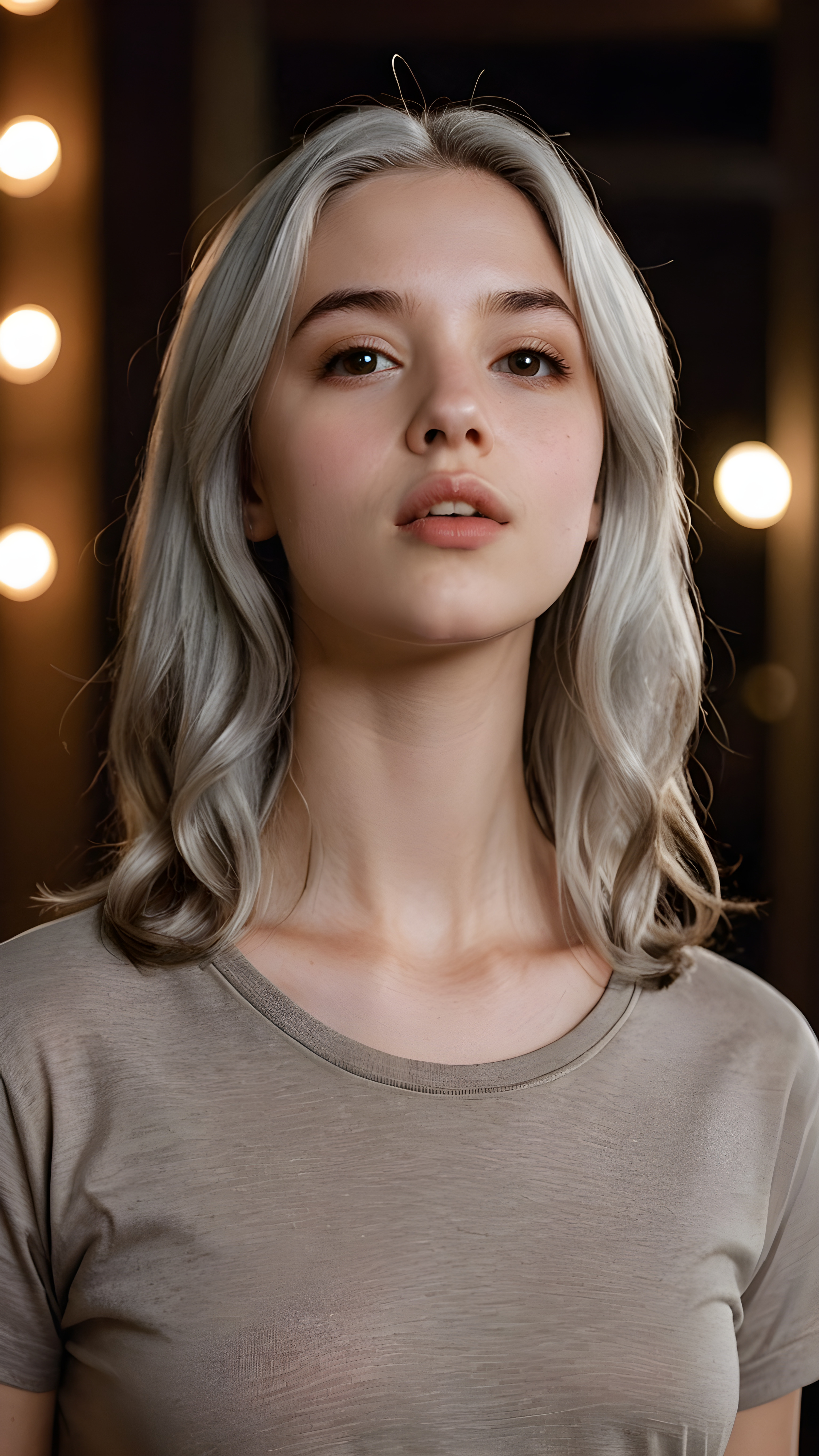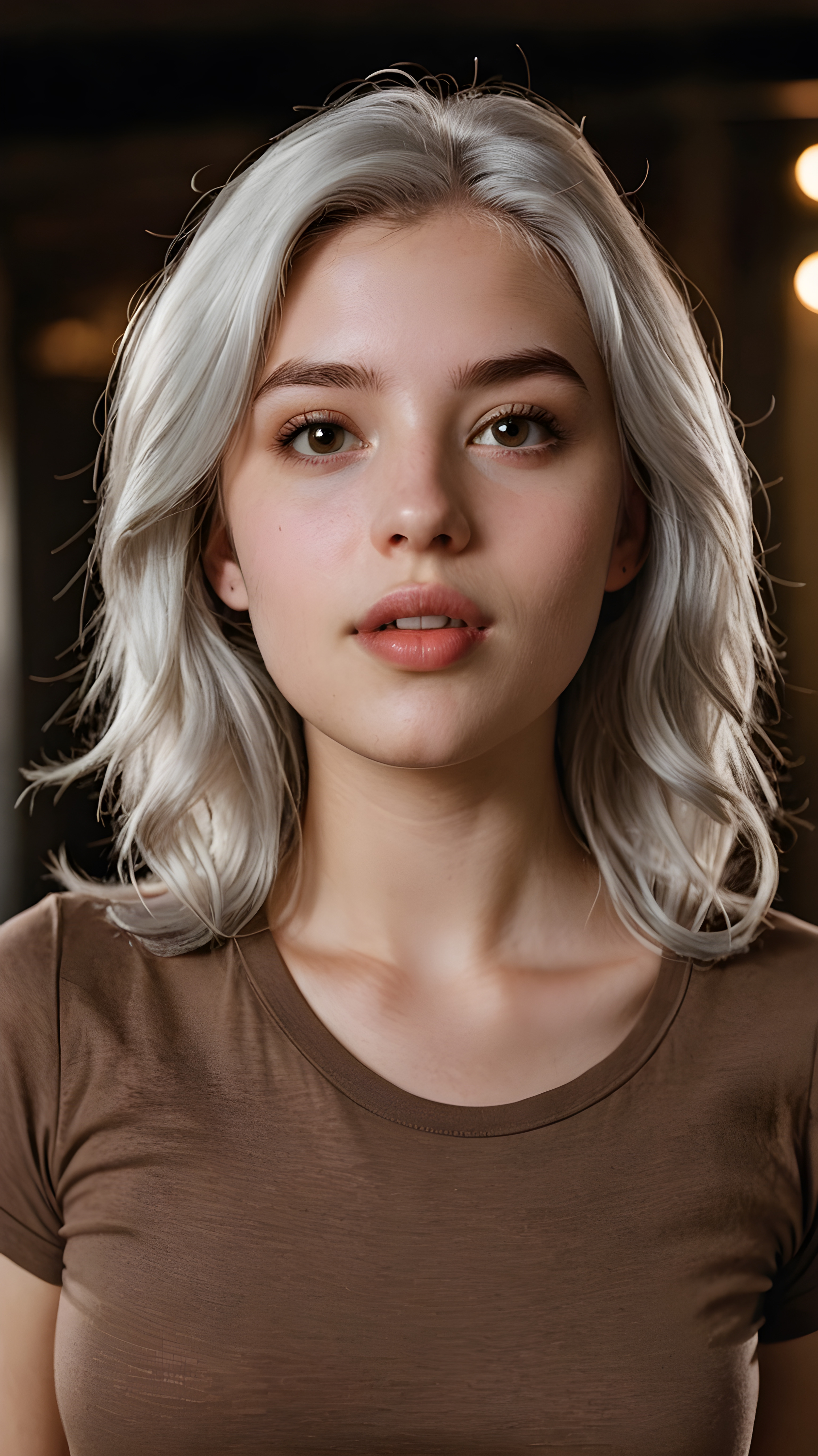 a (((realistic teen girl))), with silky, (((pale grey hair))), wearing a (((simple brown T-shirt))), facing the camera with a half-open mouth and understatedly angelic features, including (((full lips))) and a (((curvaceous figure))) that adds a touch of youthful vulnerability against a (dark, (backdrop))