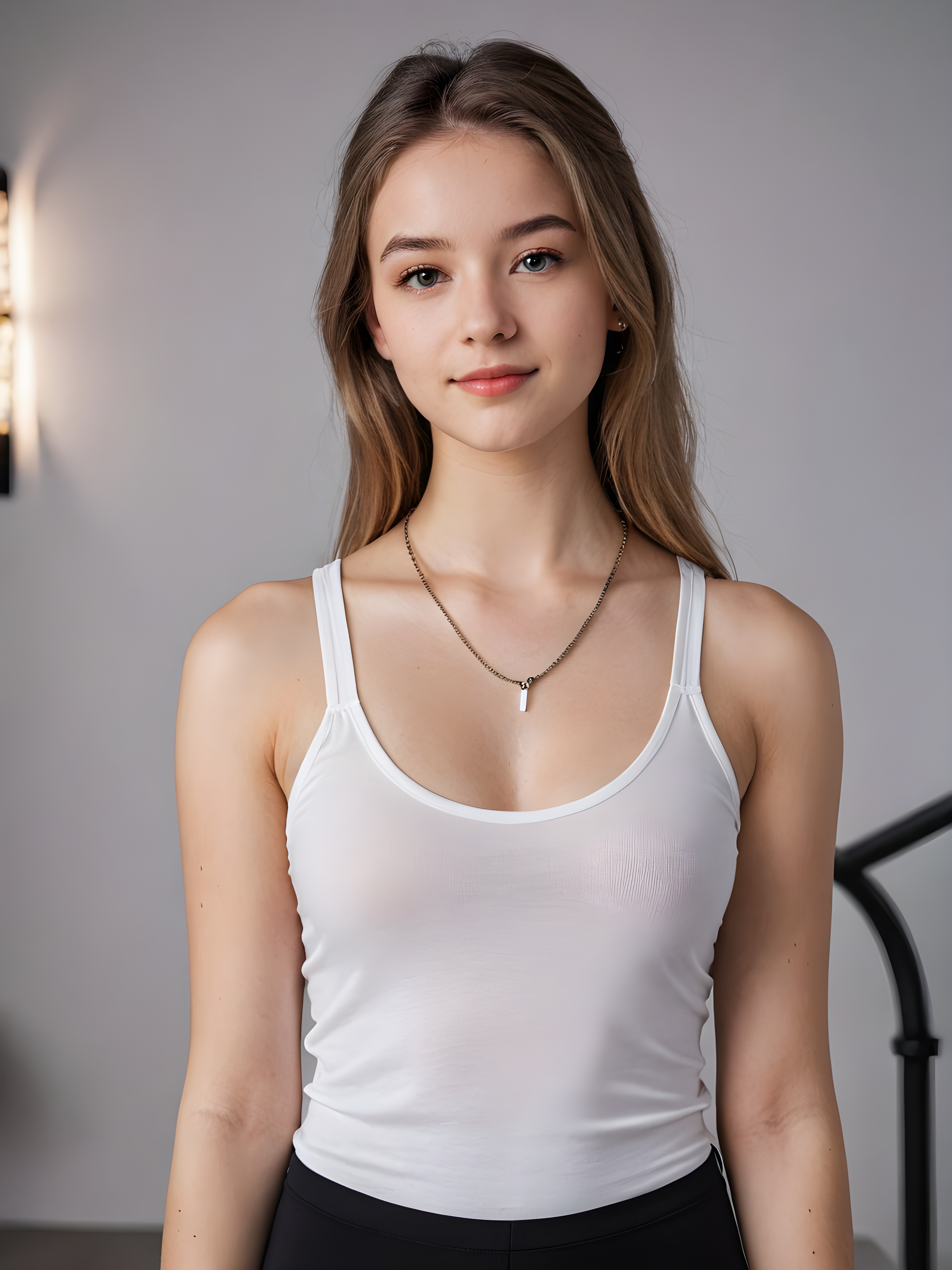A (((teen girl))) dressed in a sleek ((white tank top)) and a delicate ((small chain around her neck)), along with ((black tights)), posing confidently for the camera, exuding (((stunning beauty))) and (((flawless detail))), with a (((perfectly curved body))).