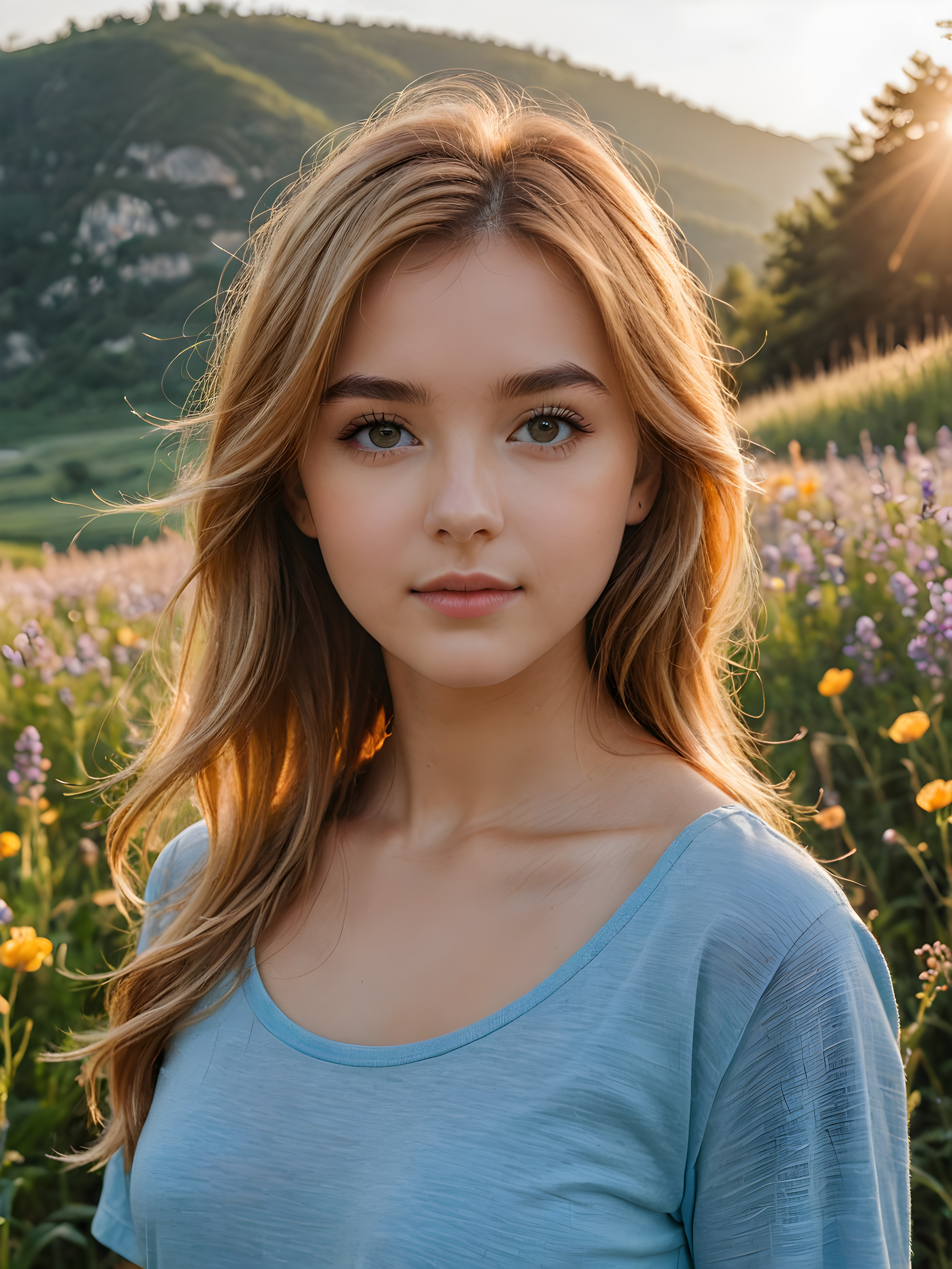 Imagine a breathtaking scene set during the golden hour, where the warm glow of the setting sun kisses the landscape. In the midst of this serene setting stands a stunning copper-blonde young teenage girl, her long soft straight hair with bangs shimmering like spun gold under the soft, amber light. She is dressed in a short cropped light blue thin t-shirt, with a perfect curved body. Her eyes, a captivating shade of blue, reflect the sky’s own hues, radiating kindness and depth. Around her, the natural beauty of a blooming meadow complements her presence, with wildflowers adding splashes of color to the scene. She exudes an aura of elegance and tranquility, perfectly in harmony with the enchanting surroundings. This image captures the essence of timeless beauty, blending the allure of a breathtaking girl with the natural splendor of the golden hour