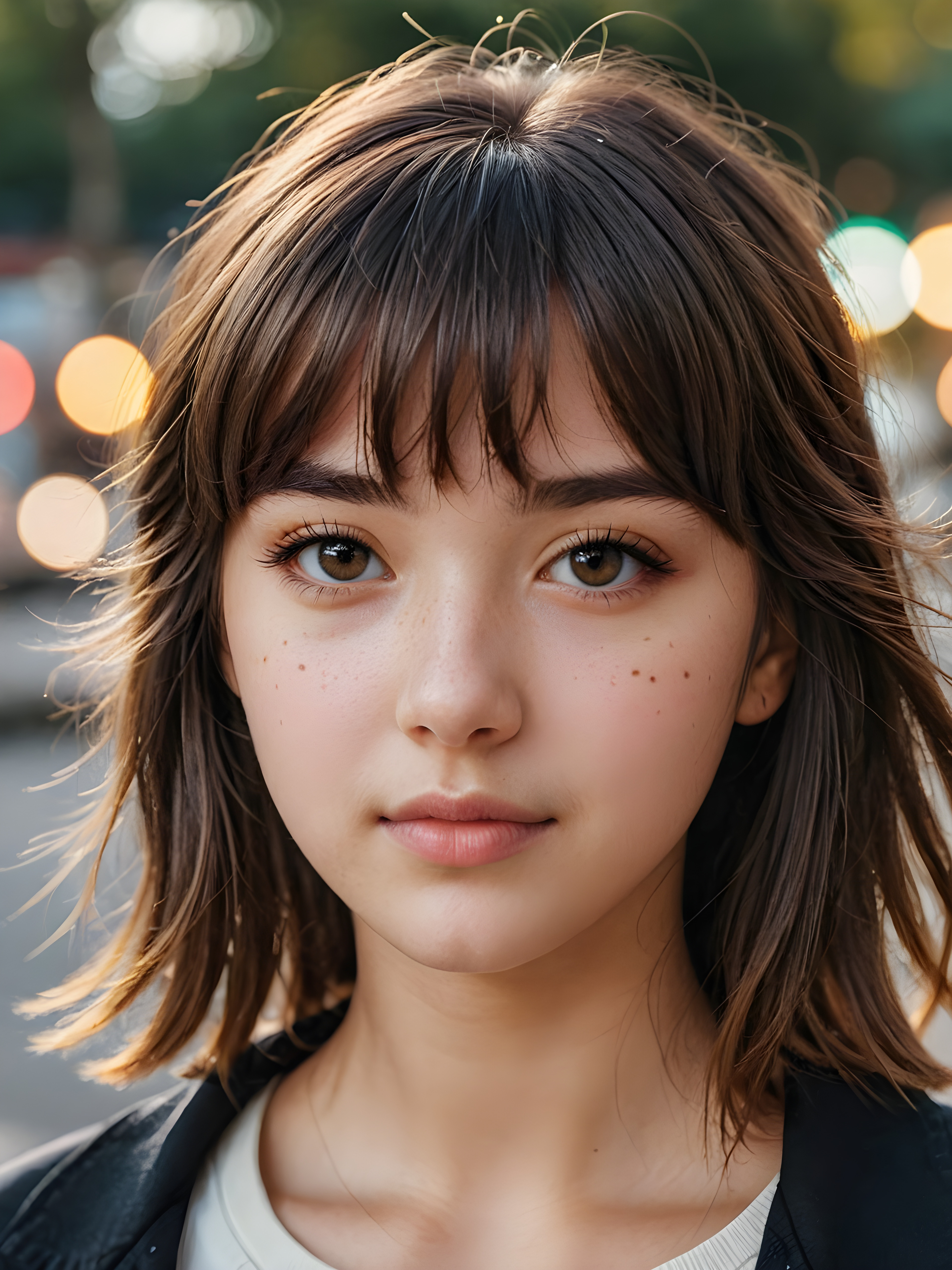 a beautifully drawn (((teen girl with bangs))), whose hair gracefully falls just past her shoulder, showcasing a (((distinctive mole))) on her left cheek