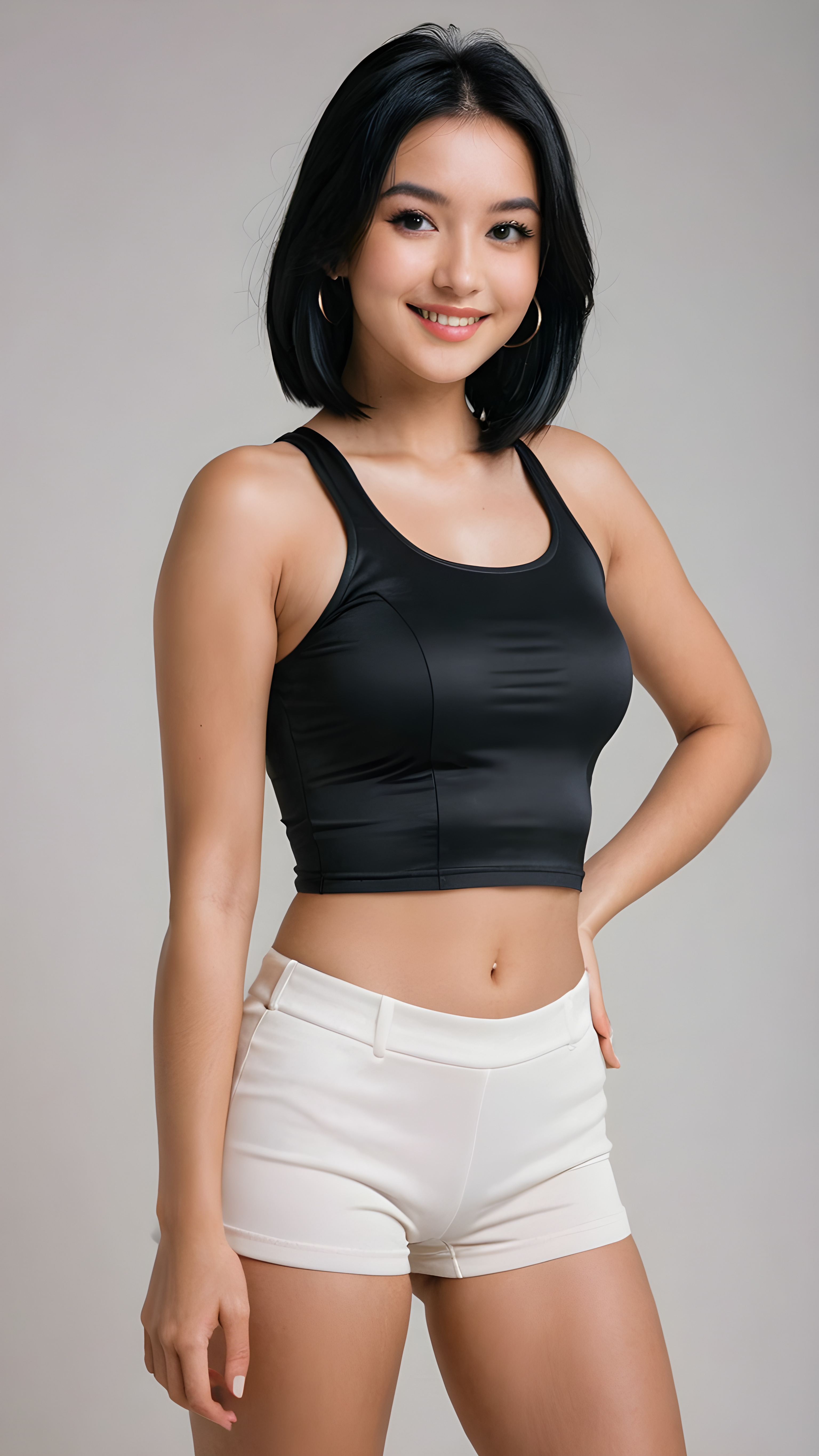 a (((young, beautiful girl))), with luxuriously shiny (((black hair))), dressed in a sleek, ((tight crop top, short pants)) that showcases her flawless figure and contours, exuding confidence and a playful grin towards the camera, against a (distinctly empty) backdrop