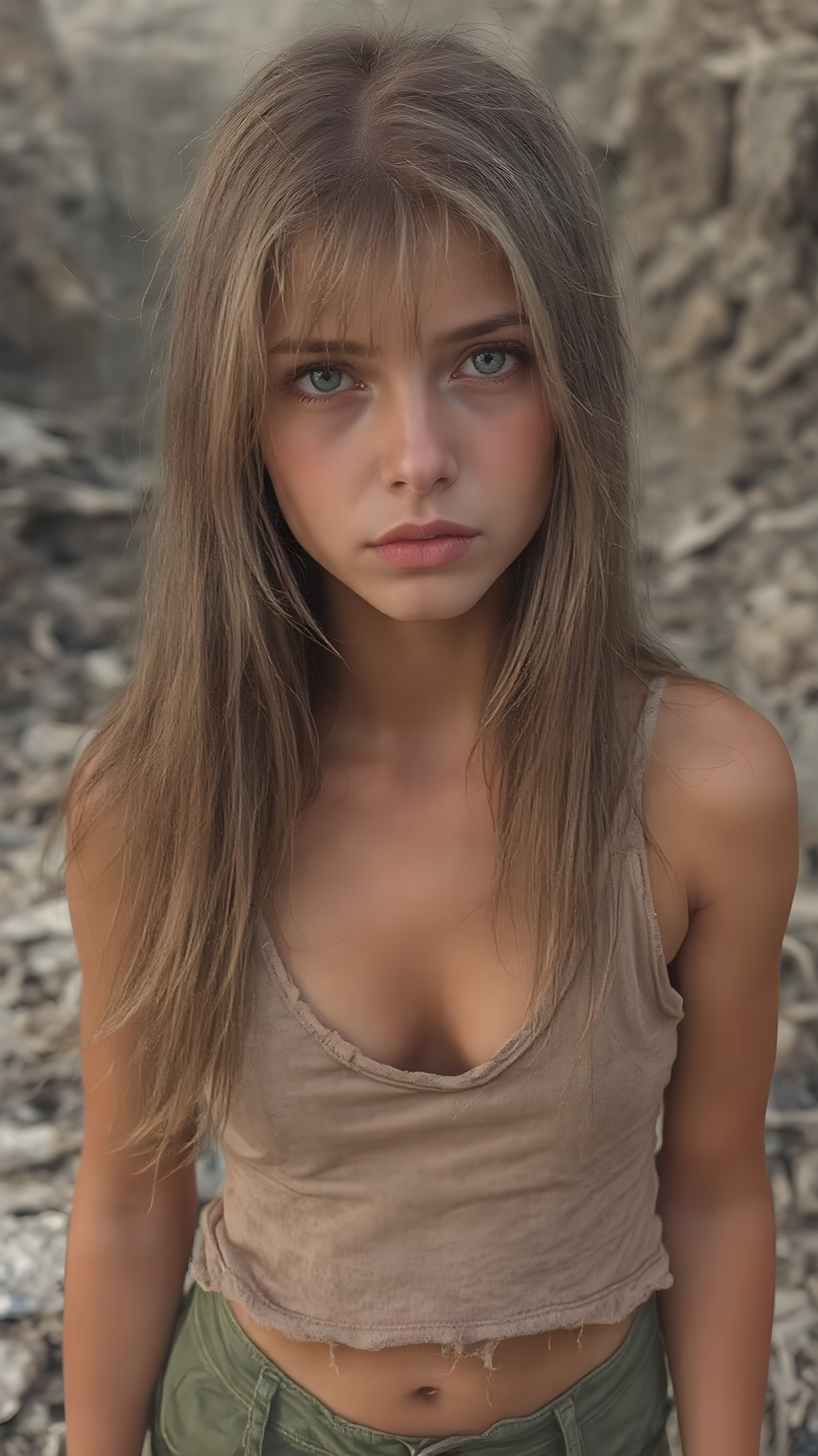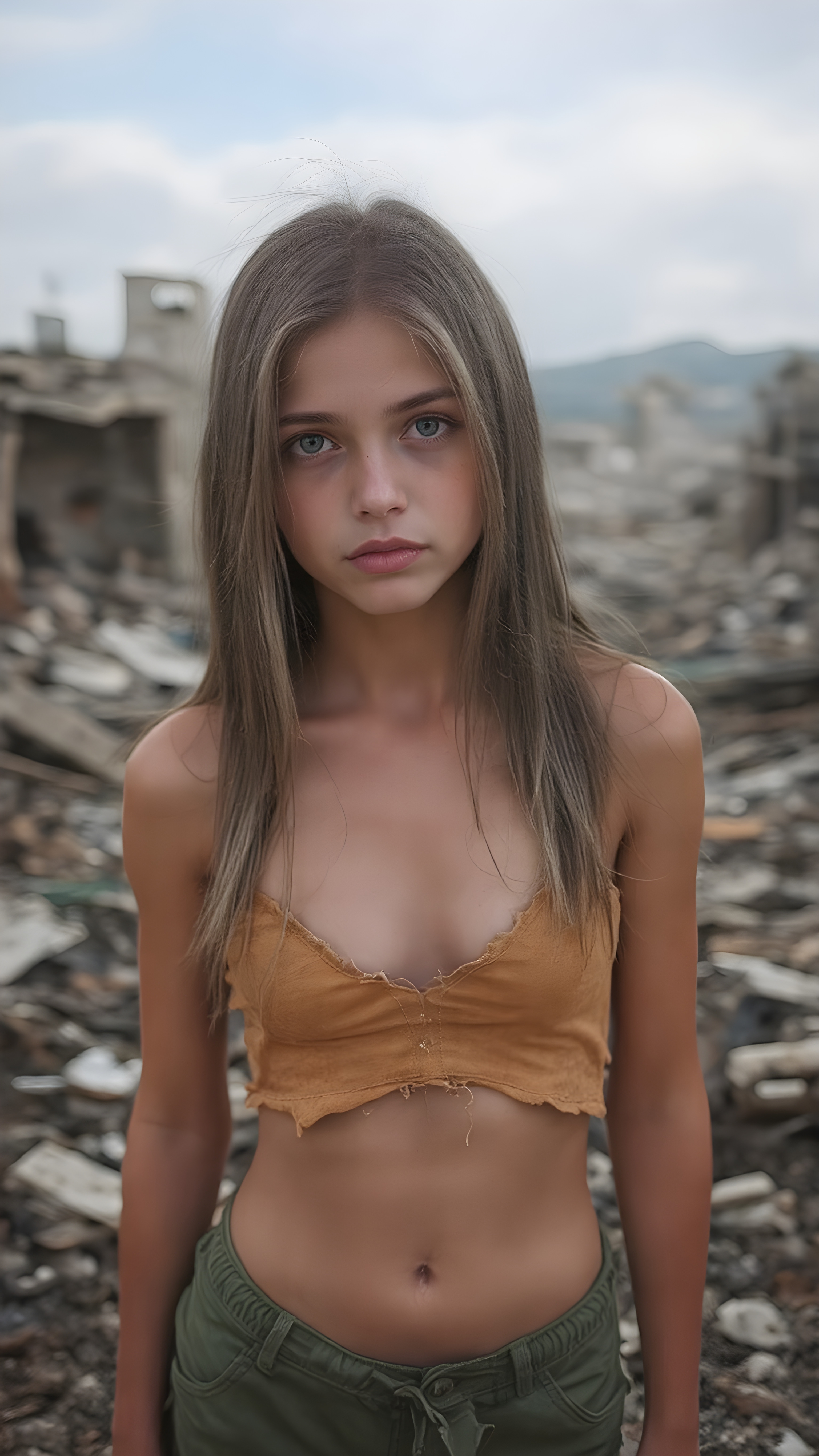 a fantastic, imaginative, young tanned teenage girl with long straight fine hair, she is poor dressed in a cropped tattered tank top, deep v-neck and green pants, she has a perfect curved body, perfect belly button, she stands in a destroyed and devastated city and looks very sad at the camera