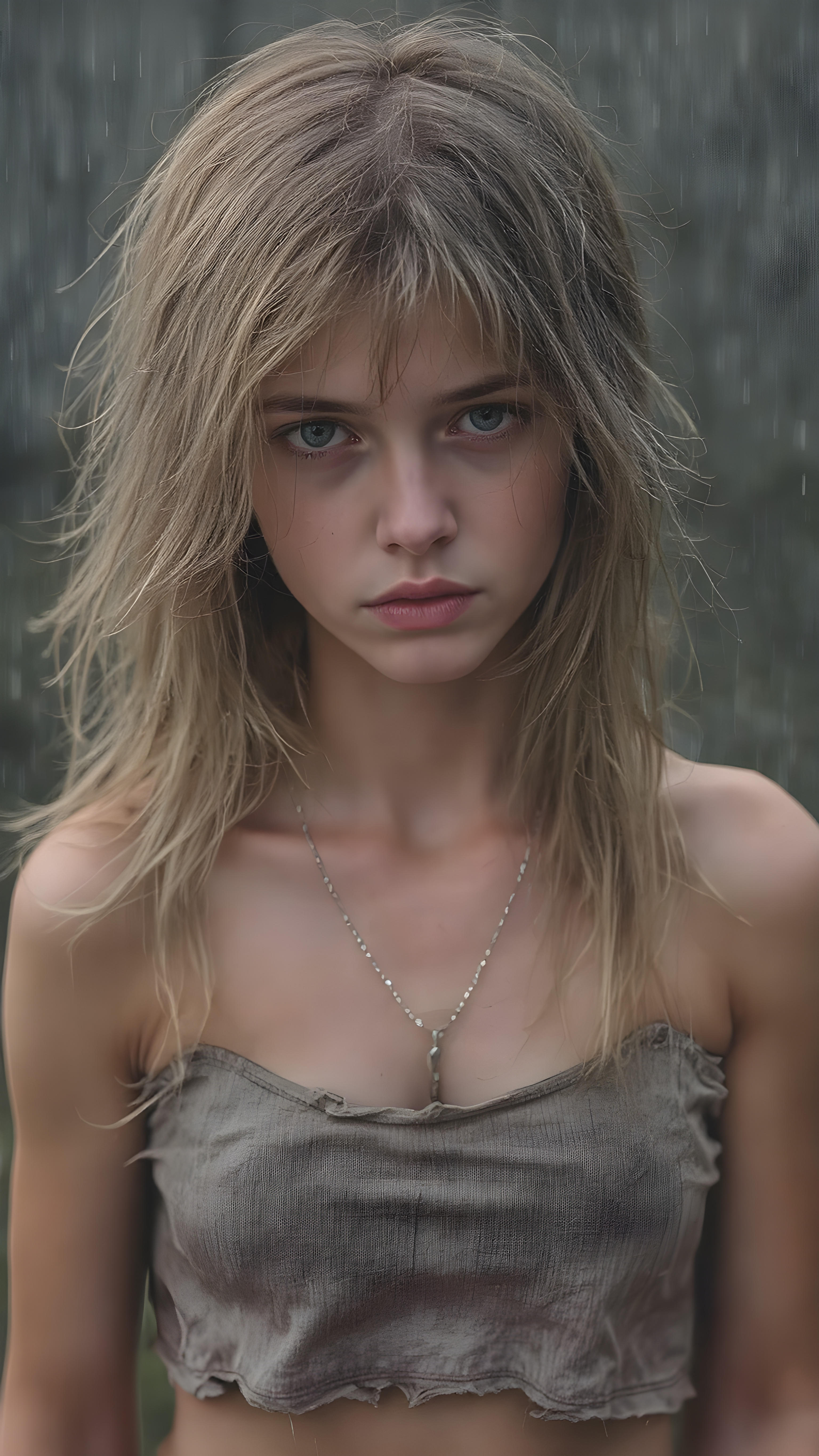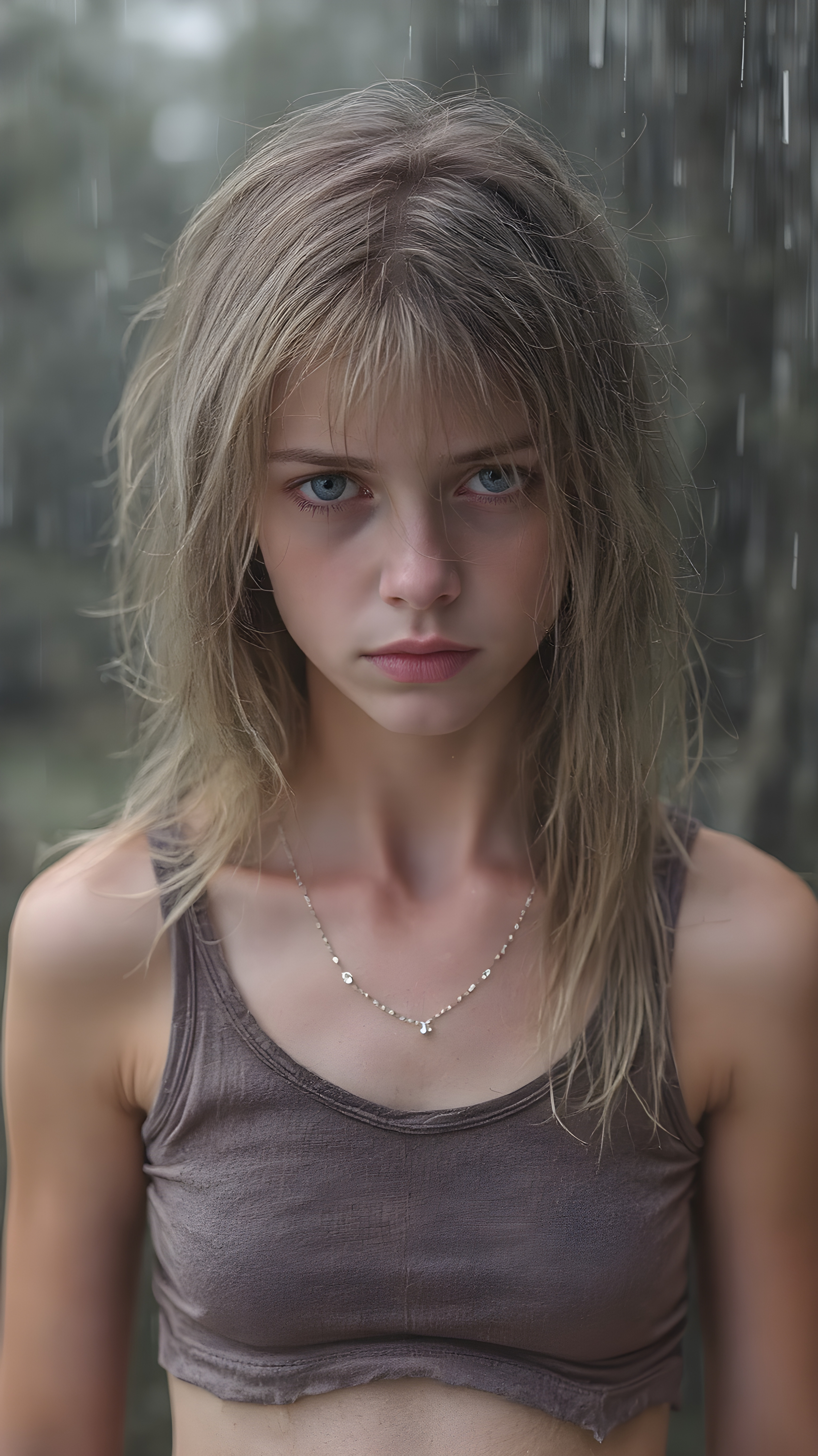 a poignant and emotionally resonant image portraying a young, abandoned, and destitute teen girl, clad in a tattered, ragged short brow cropped tank top, with her very long, messy blond brown wet hair, showcasing her pale, emaciated, and slightly skeletal features. She stands in front, looking mournfully at the viewer. The rain adds a serene touch to the scene, creating a sense of intimacy, photo-realistic, high-resolution image, capturing the essence of a teenager’s psychological and emotional state, she has a perfect curved female body, realistic colors, perfect light and shadows, wears a fine silver necklace