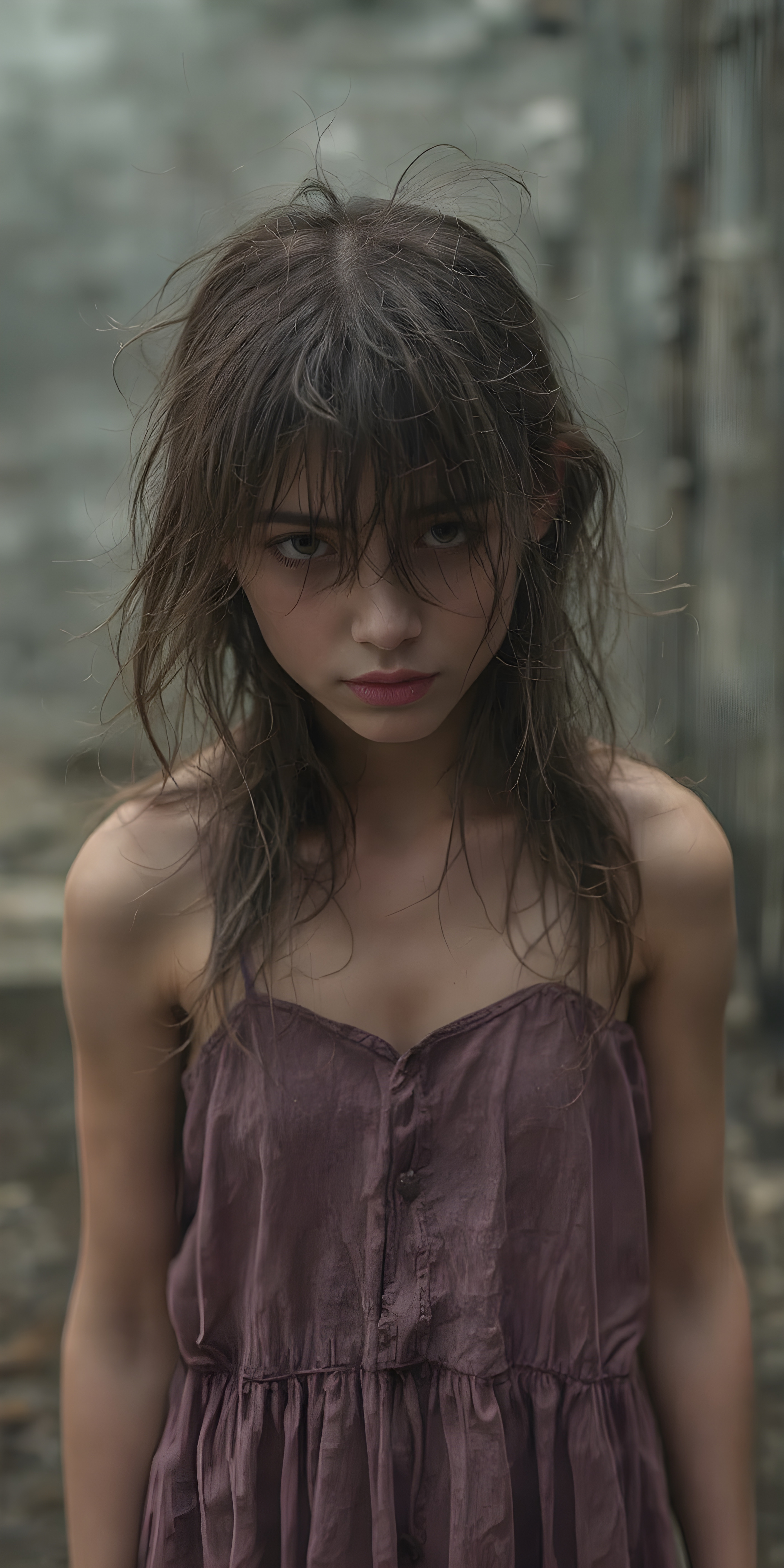 a poignant and emotionally resonant image portraying a young, abandoned, and destitute Korean teen girl, clad in a tattered, ragged short purple dress, with her long, messy hair, showcasing her pale, emaciated, and slightly skeletal features. She stands in front, looking mournfully at the viewer. The rain adds a serene touch to the scene, creating a sense of intimacy. Photo-realistic, high-resolution image, capturing the essence of a teenager’s psychological and emotional state