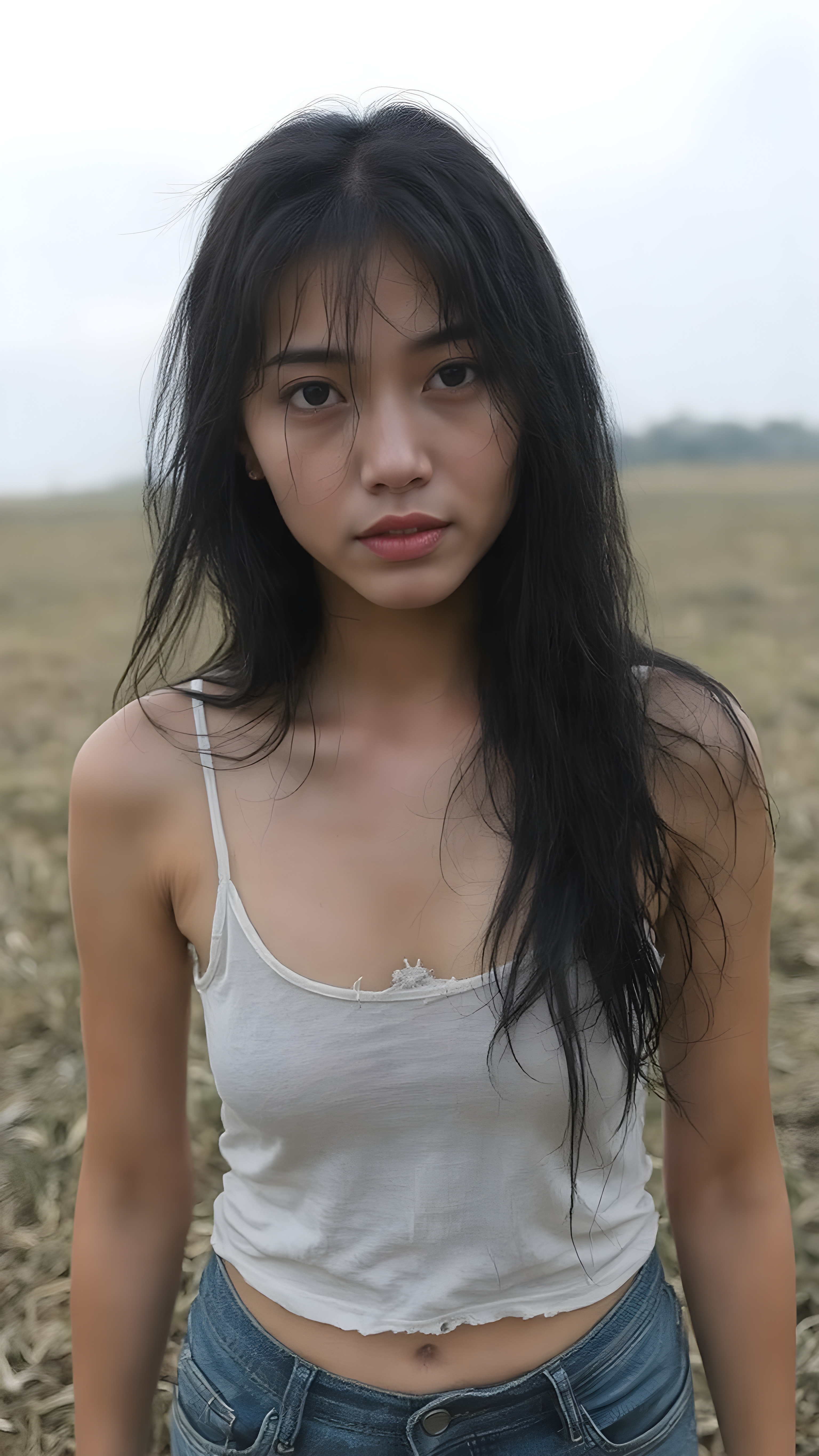 detailed photograph depicting a (((upper body shot))) of a (((beautiful but distressed Asian teen girl))) with flowing black hair, (((wet skin))), and (((dark and tired eyes))), dressed in a ((short, translucent white tank top)), that gently floats off her shoulders, and ((tired, worn blue jeans)). She stands in a (vast, open field), slightly tilted towards the viewer, looking directly into the camera. Her expression is one of melancholy and hopelessness, as if her future is grim and bleak, which contains a few, (very worn and torn) pieces of (((torn, stained white clothes))) and a few (((dirty, torn fabric rags))) that cover her pitifully minimal clothing. It should be emphasised that her overall appearance is ((extremely modest and understated)), with her ((wet, dark hair)) and ((sad, tired face)) contrasting against the ((dreary, yet beautiful)) autumn setting.