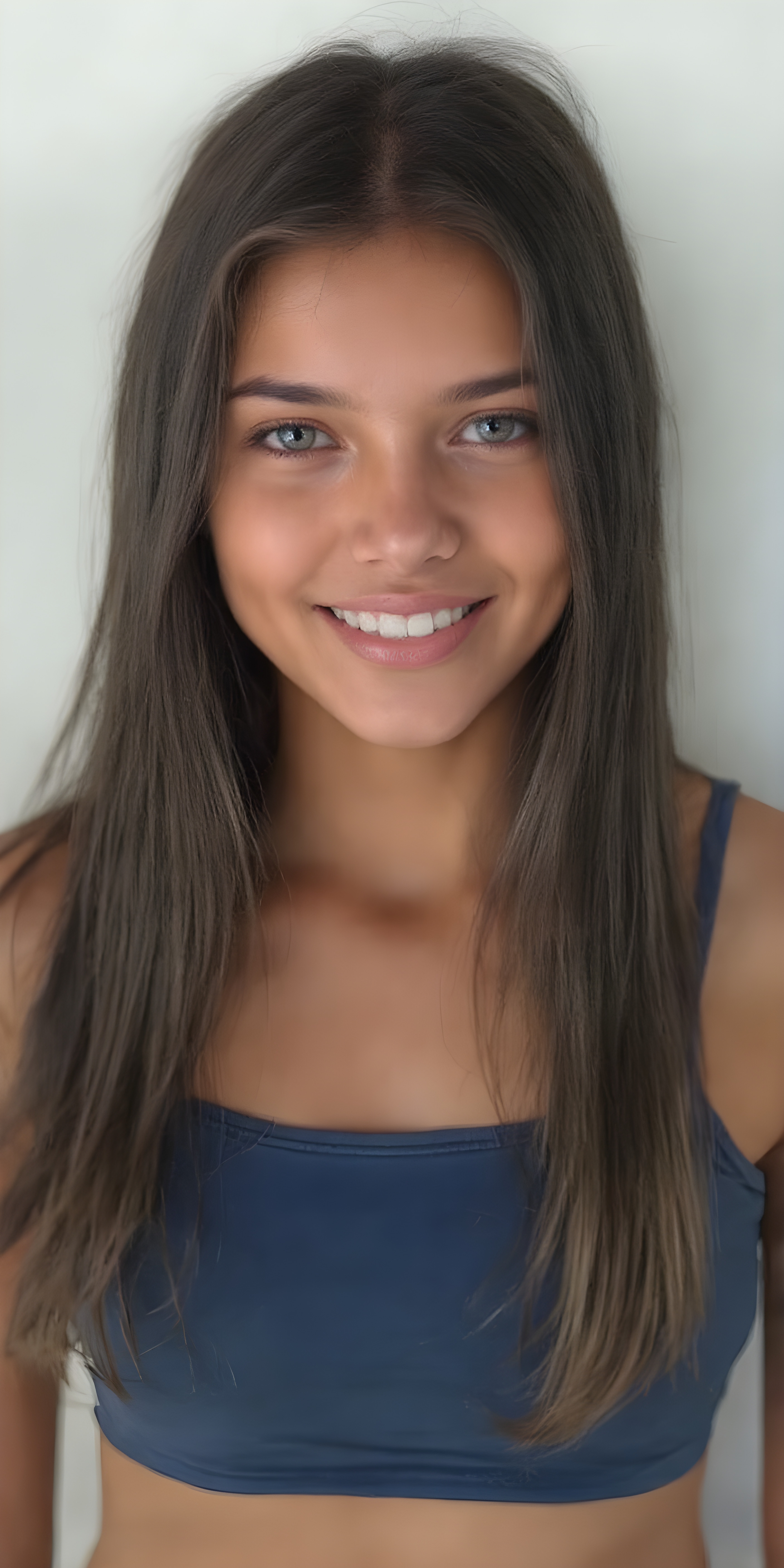 ((full body shot)) a joyfully cute (((young tanned teen girl))), with long, soft straight black (((hair))), the hair falls gently over her upper body and is the same length on both sides, exquisitely detailed amber eyes, dressed in a sleek, form-fitting blue (((crop tank top))), she has a perfect curved fit body, full lips, her expression radiating pure elation towards the viewer, detailed, realistic, 4k