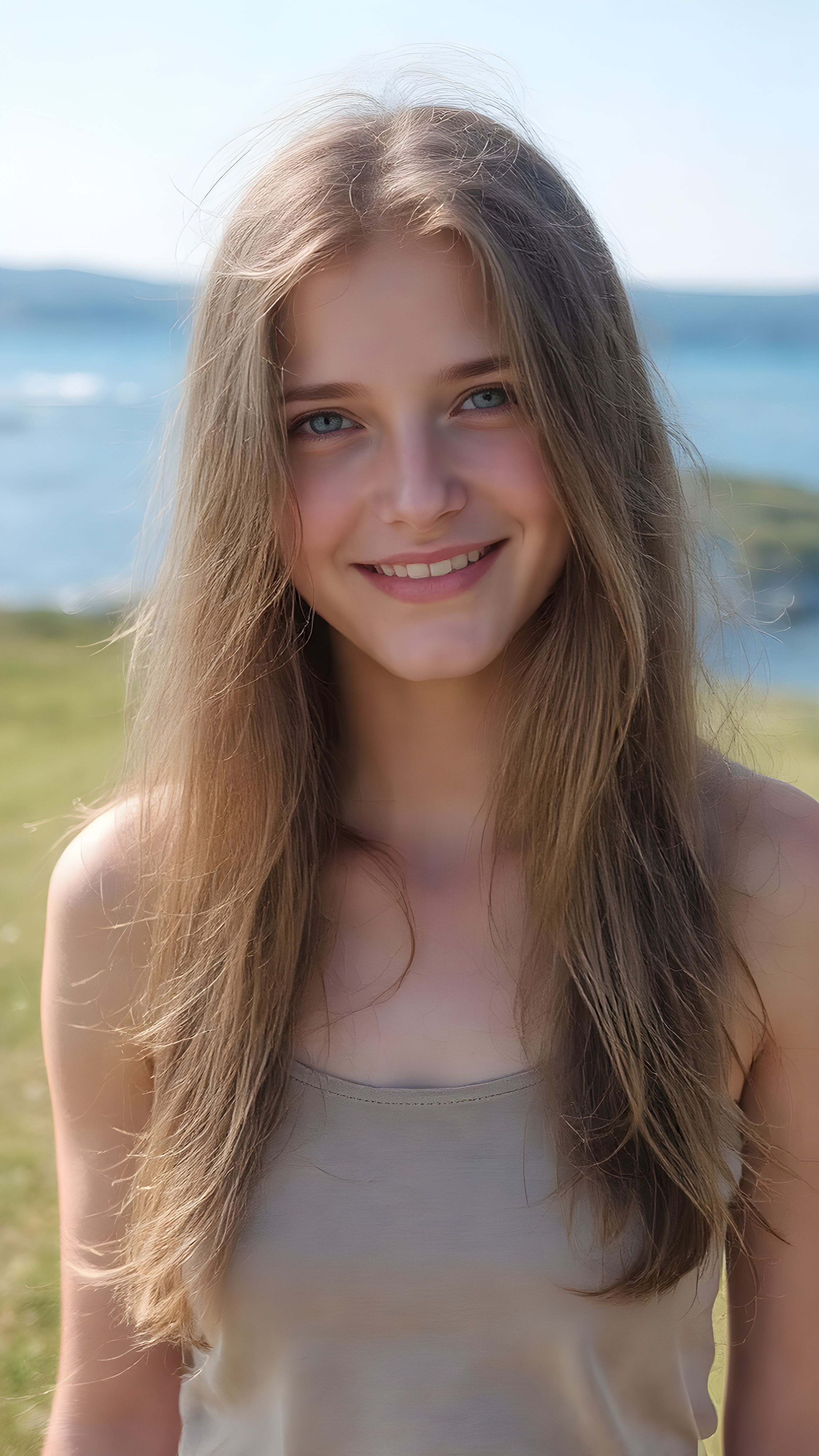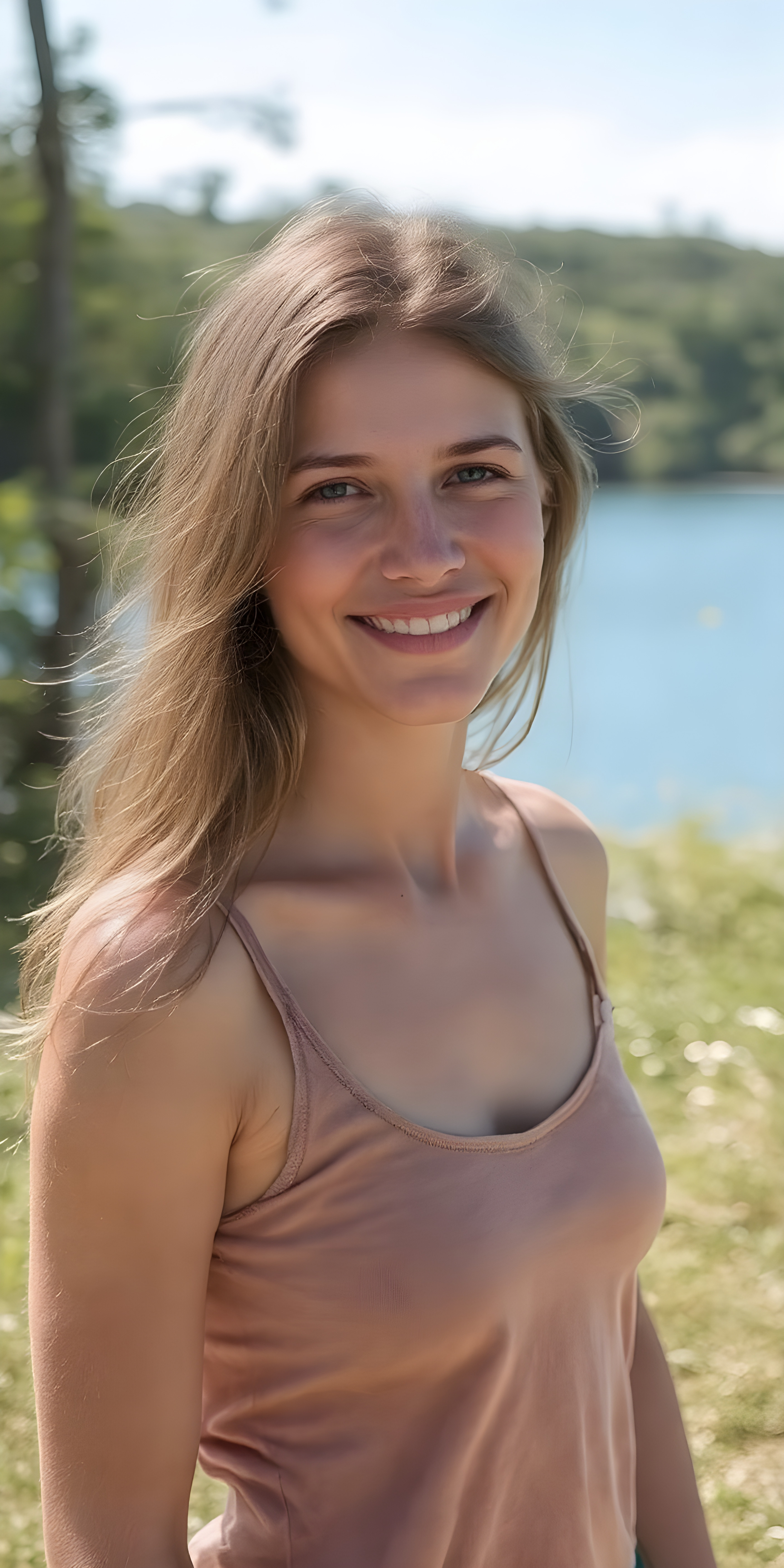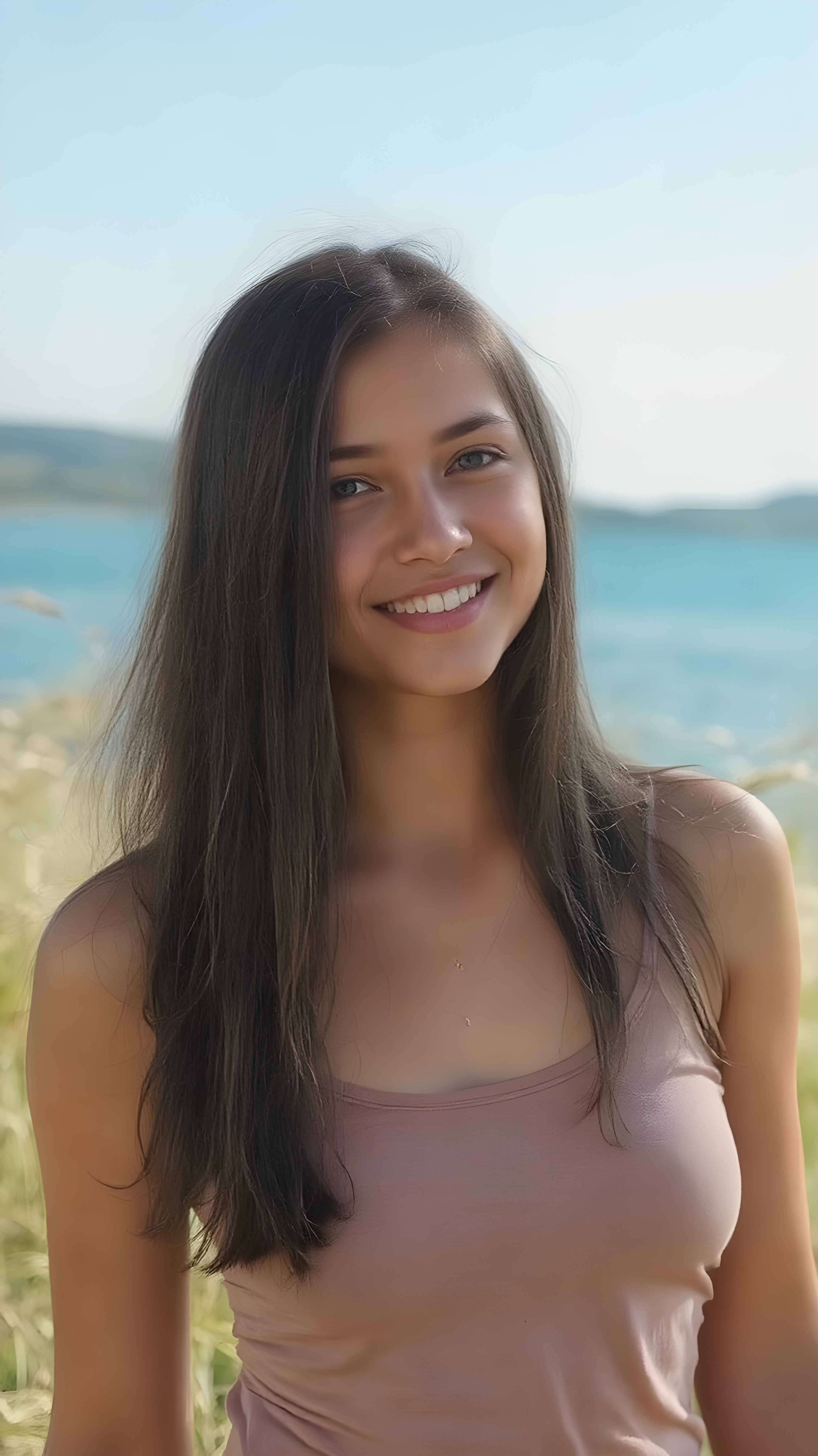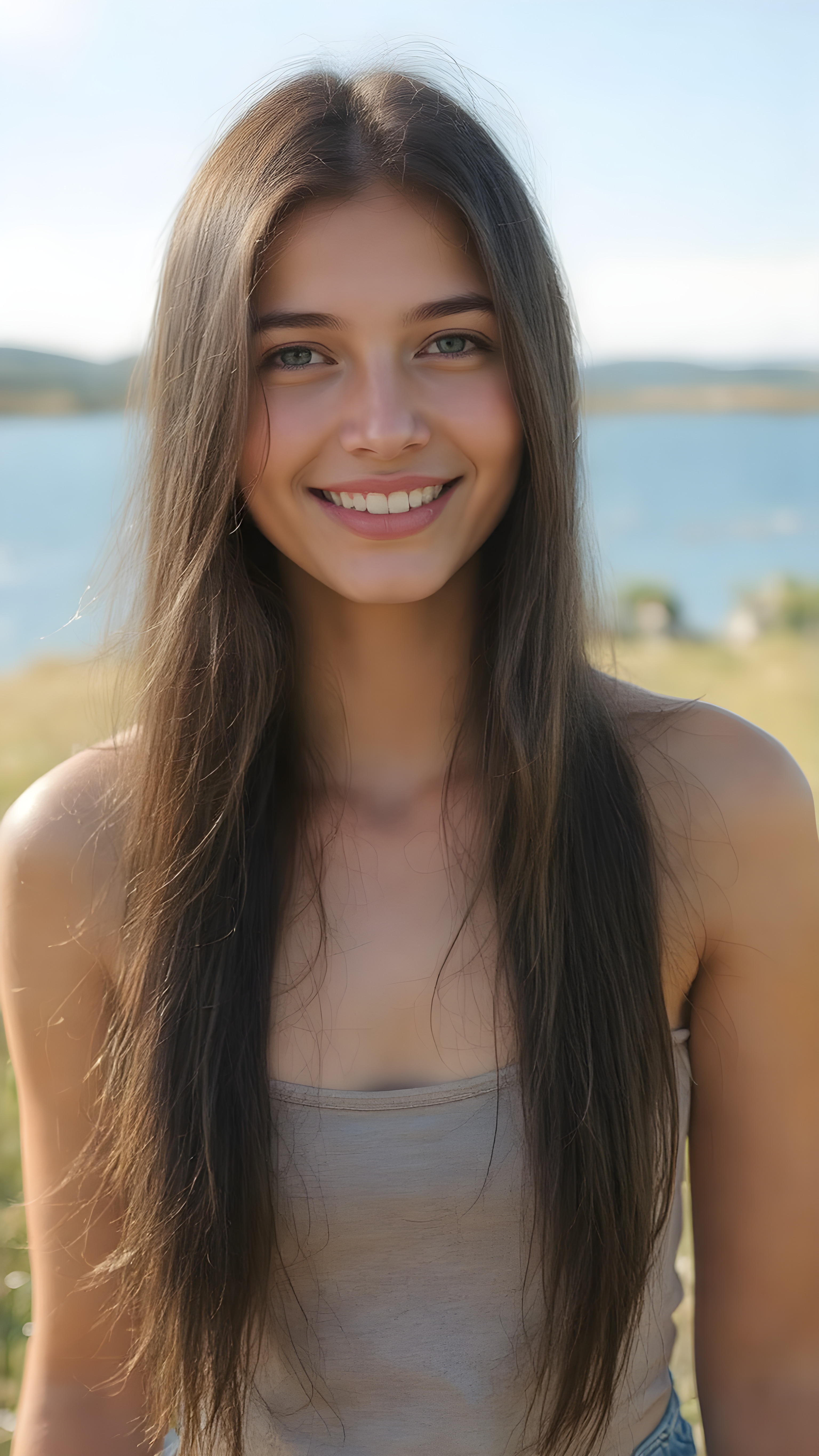 a fantastic young adult tanned teen girl, she is my daughter, with long straight black soft hair is standing in a sunny meadow. In the background is a deep blue lake, she is smiling, ((detailed and super realistic)), she wears a short plain tank top
