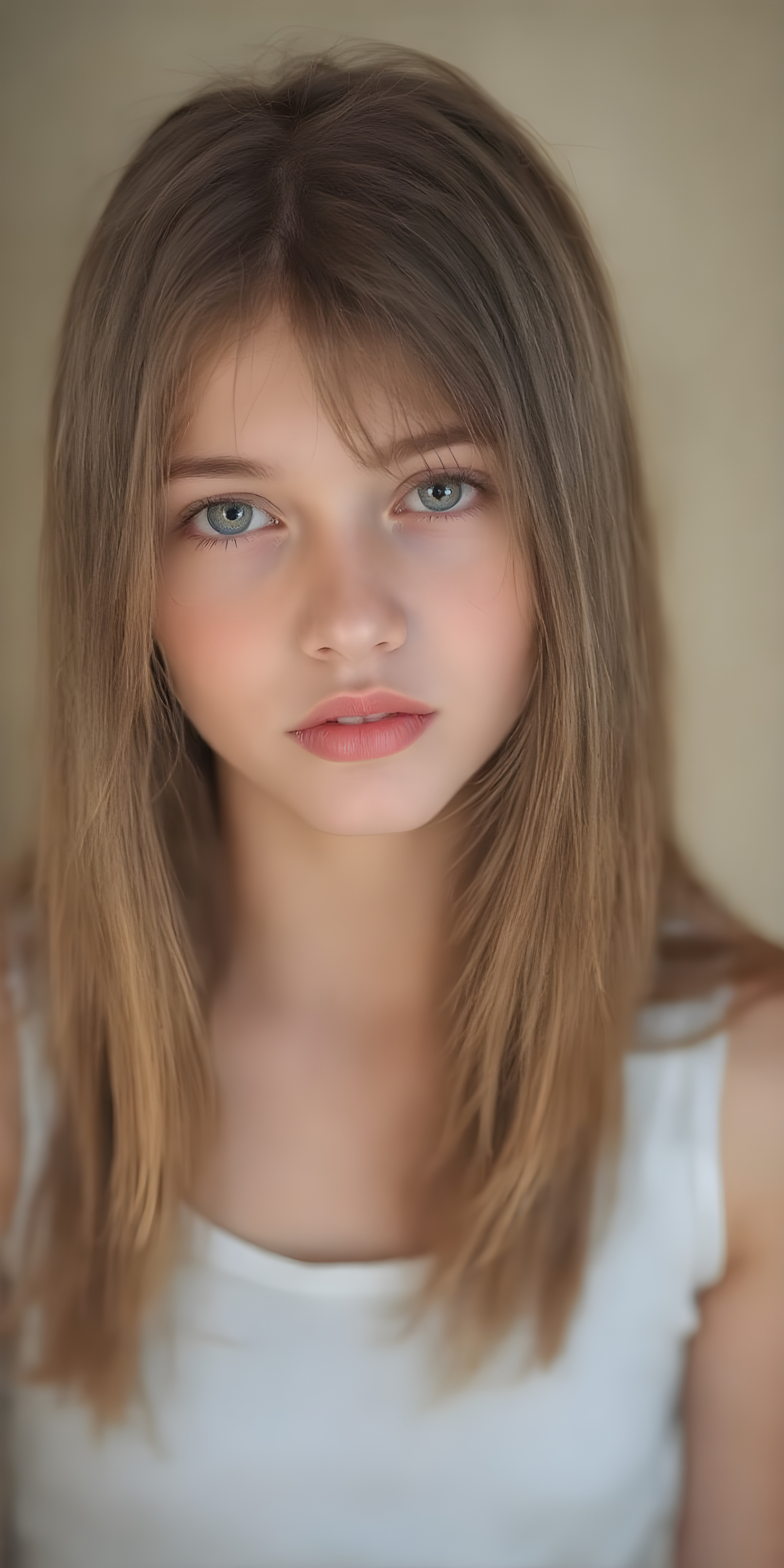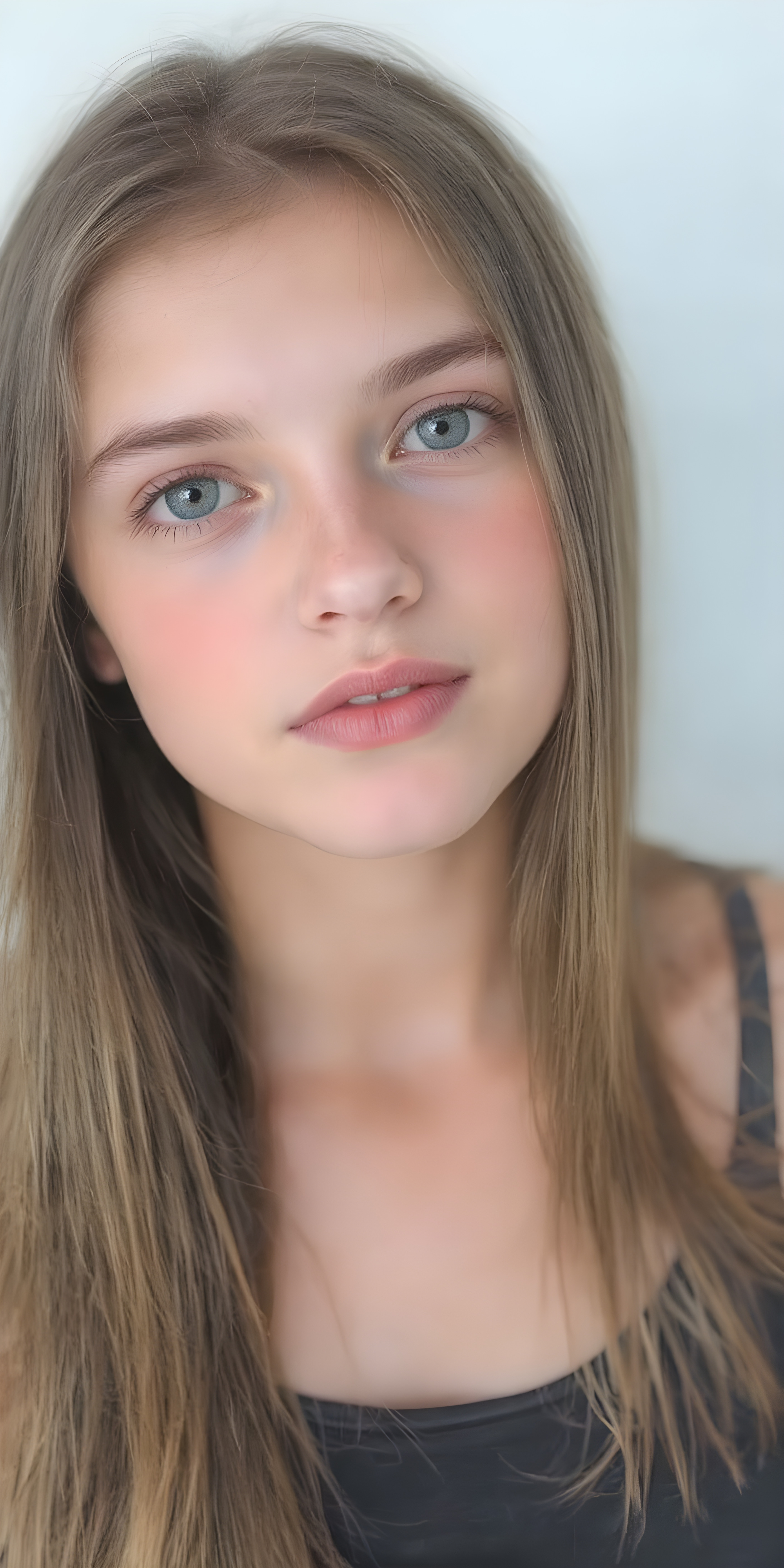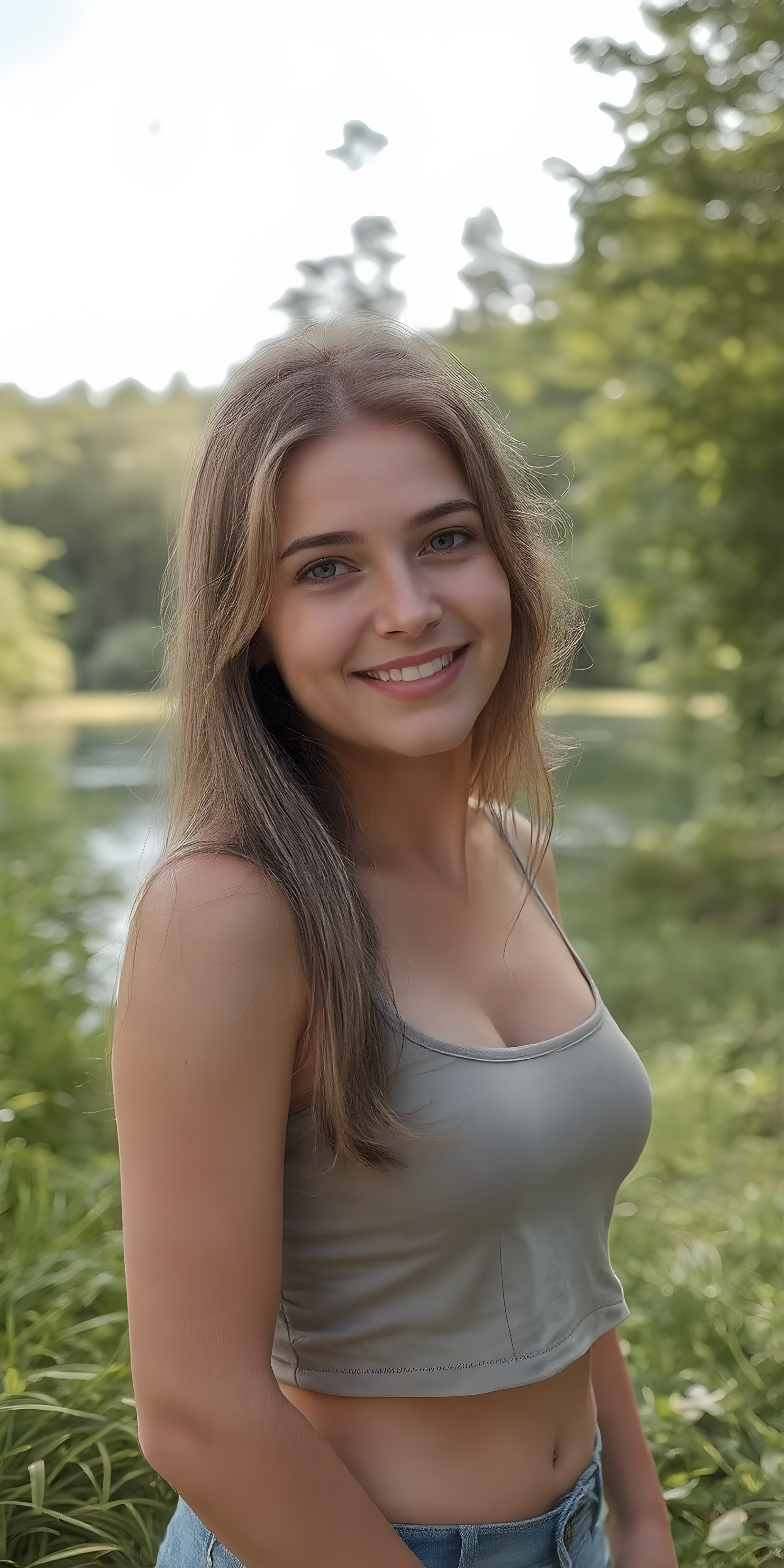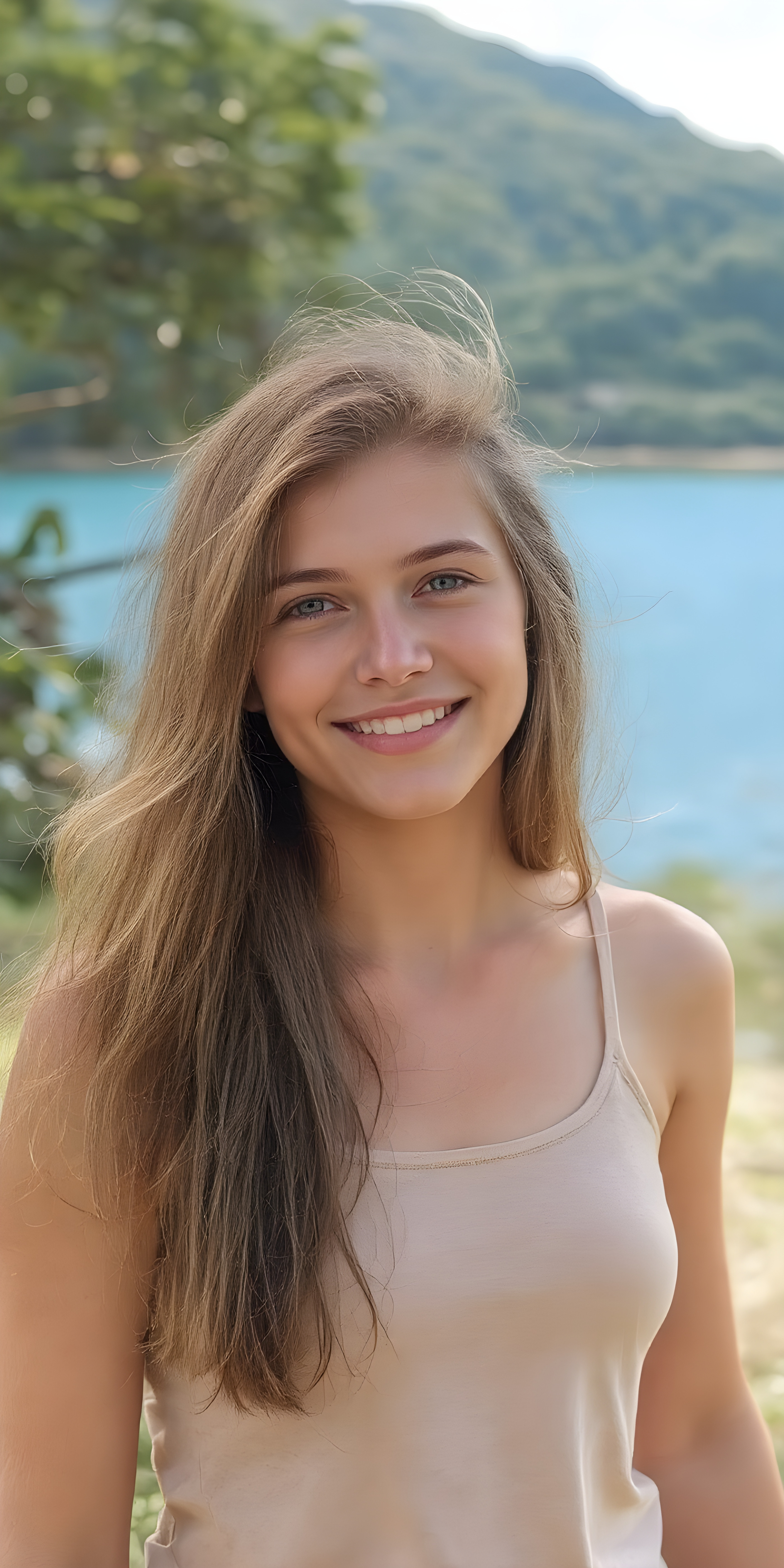 a fantastic young adult tanned teen girl, she is my daughter, with long straight black soft hair is standing in a sunny meadow. In the background is a deep blue lake, she is smiling, ((detailed and super realistic)), she wears a short plain tank top