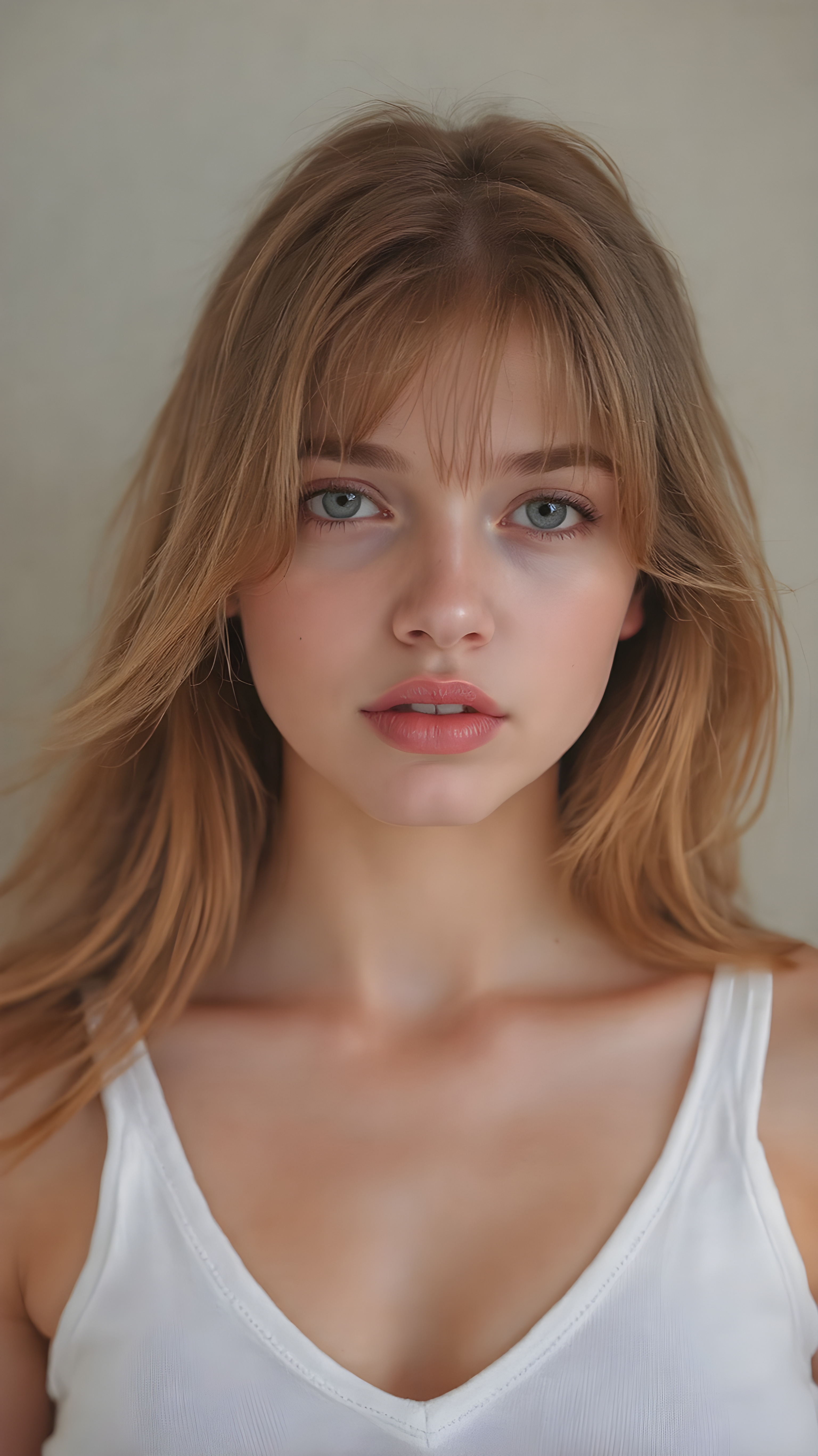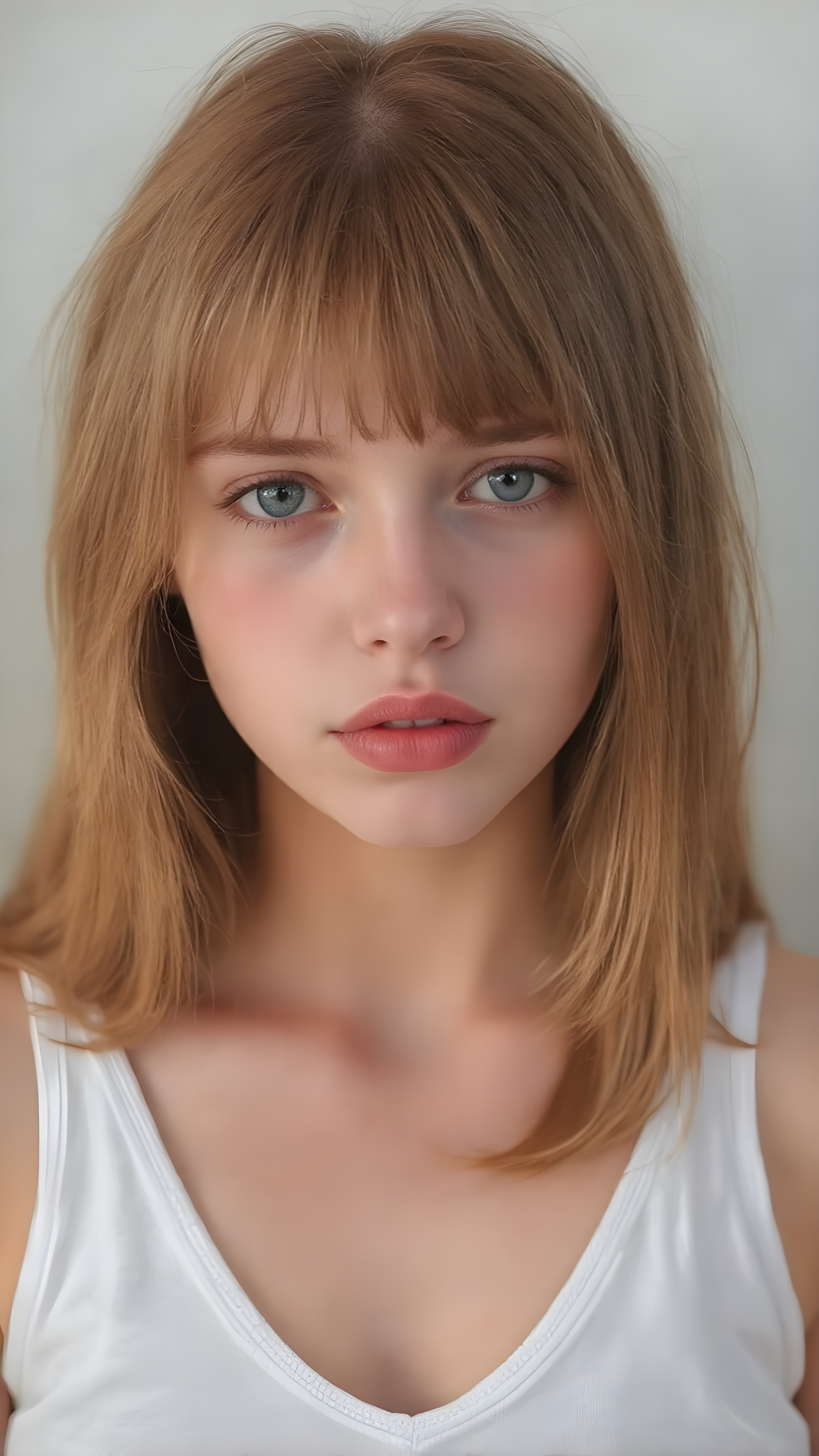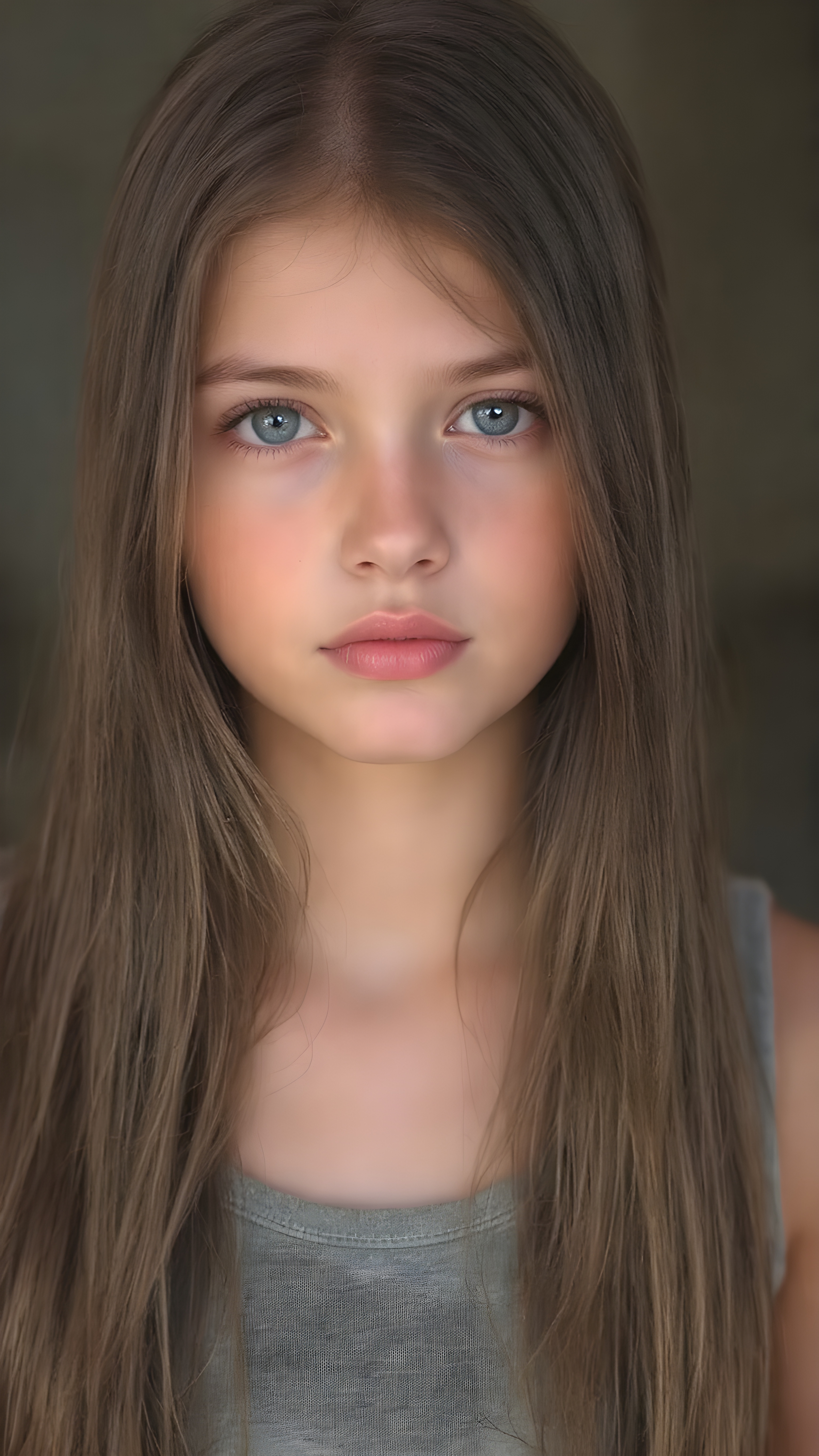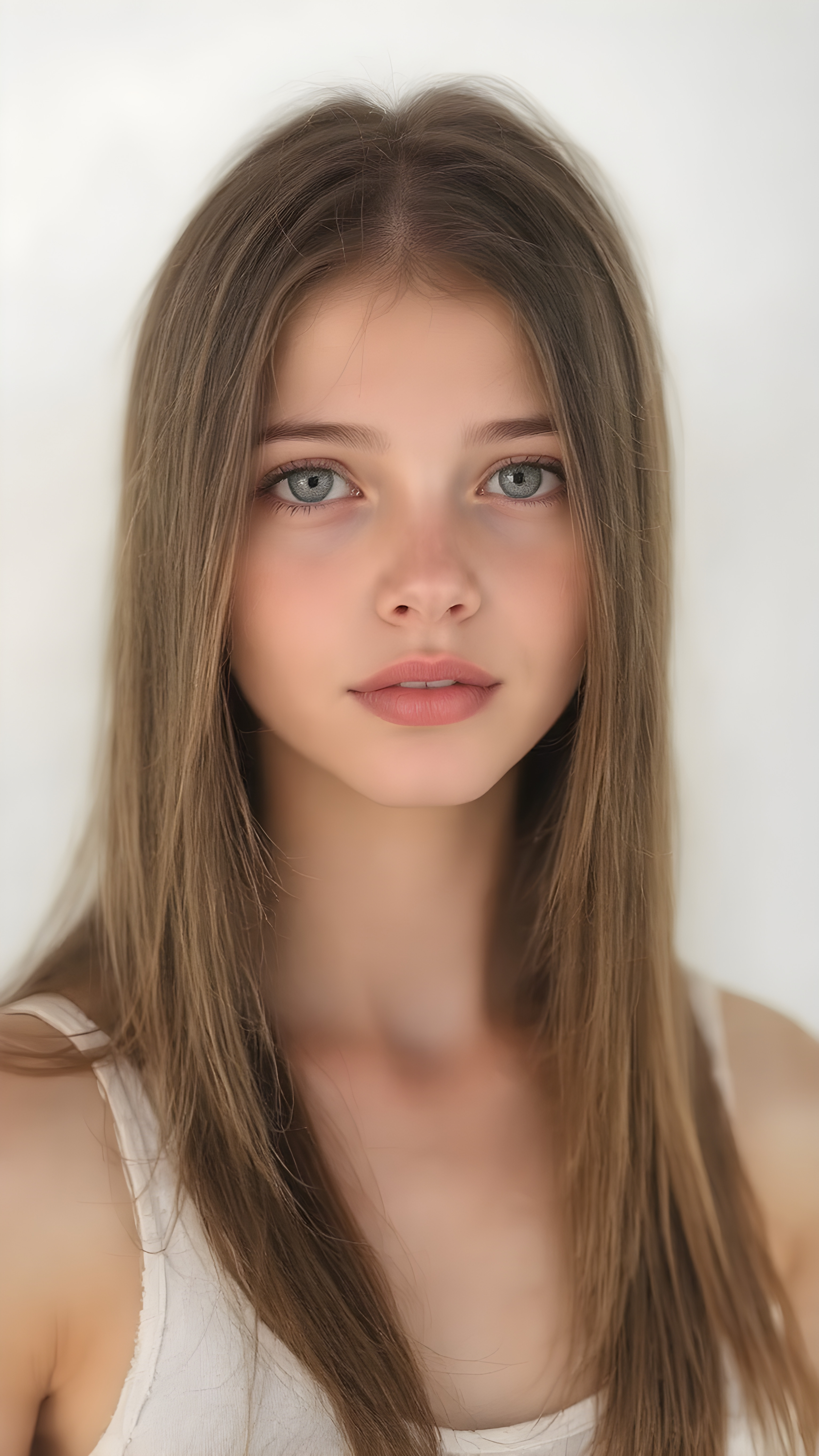 a fantastic young adult tanned teen girl, she is my daughter, with long straight black soft hair is standing in a sunny meadow. In the background is a deep blue lake, she is smiling, ((detailed and super realistic)), she wears a short plain tank top
