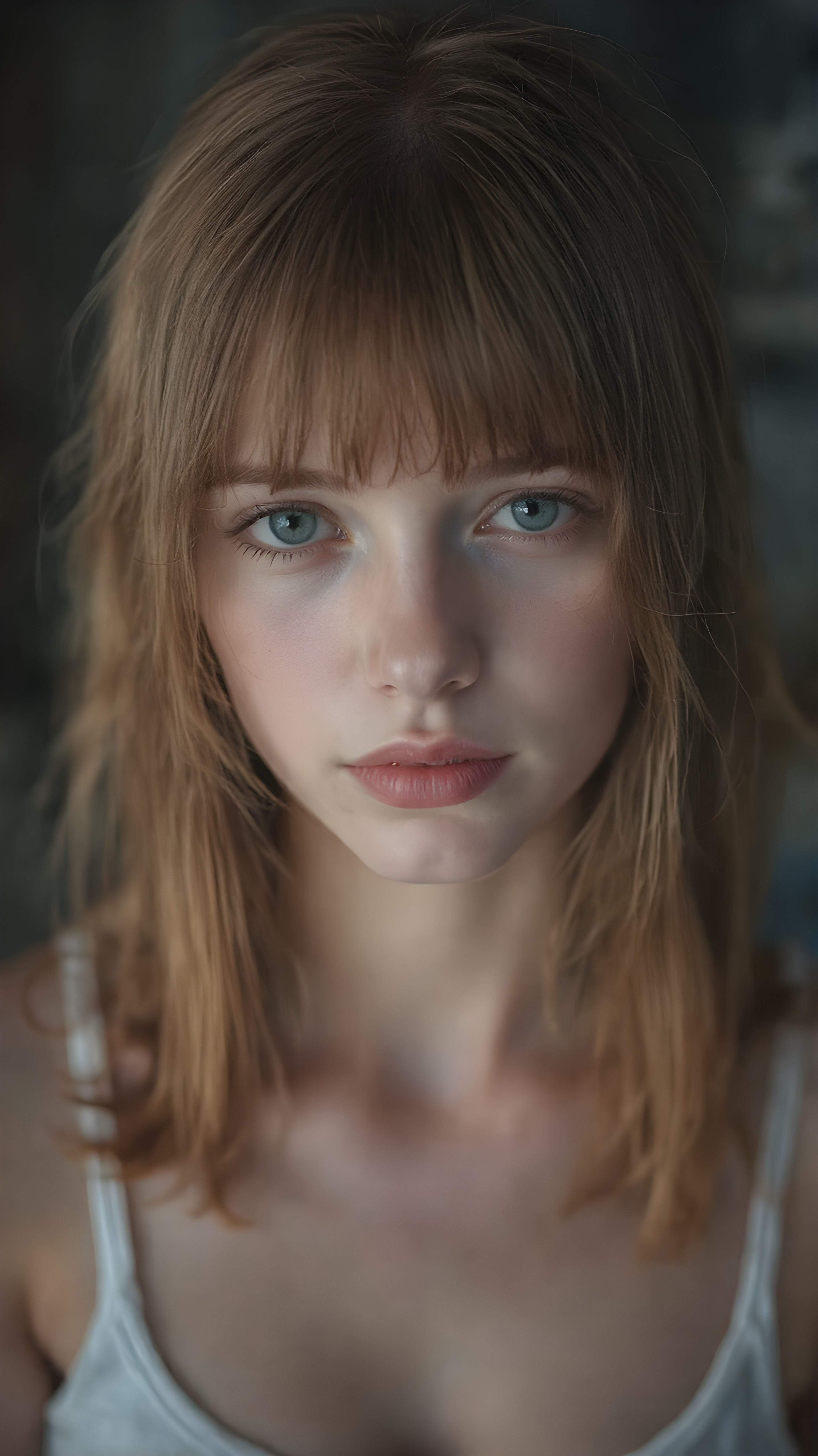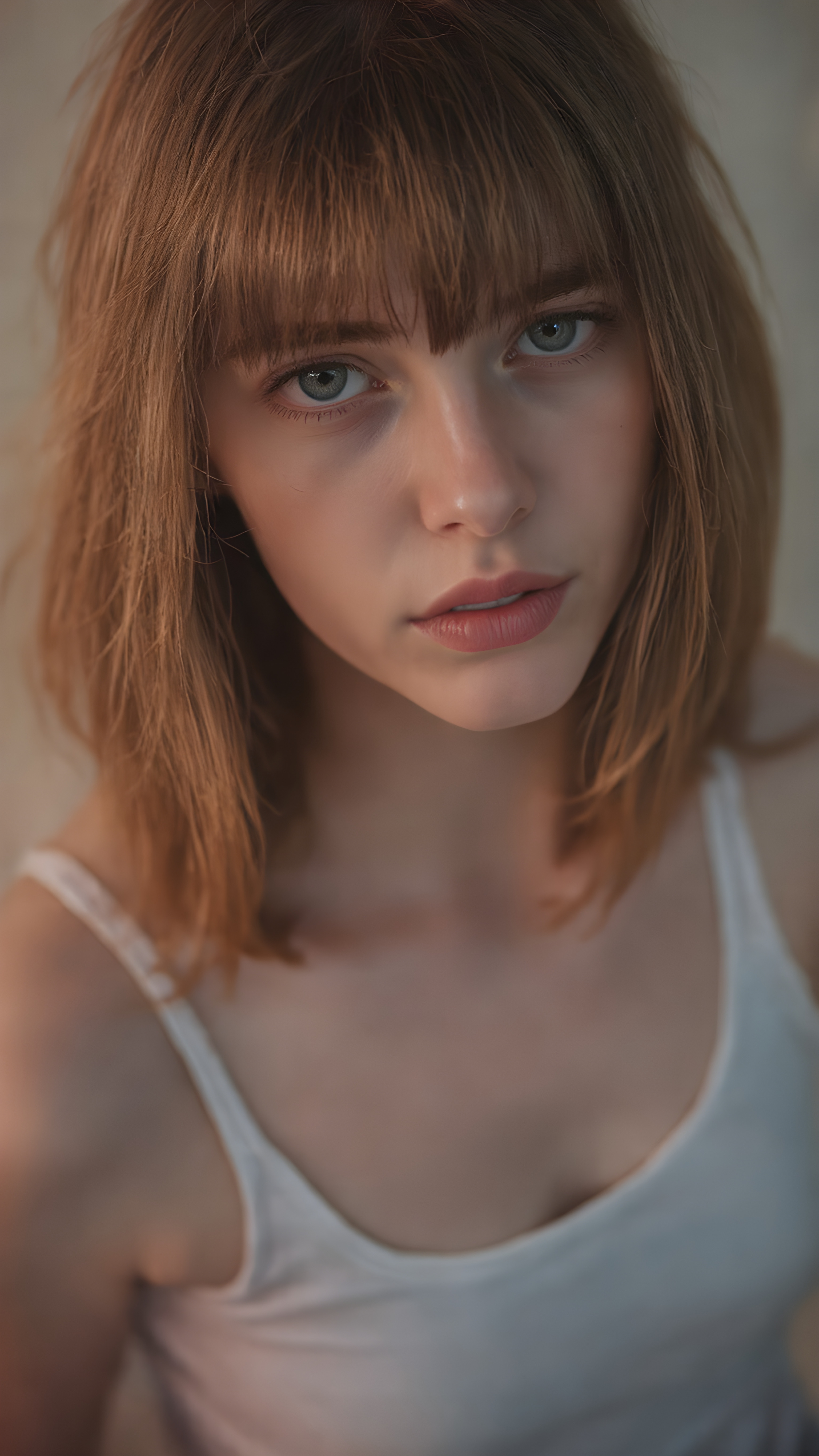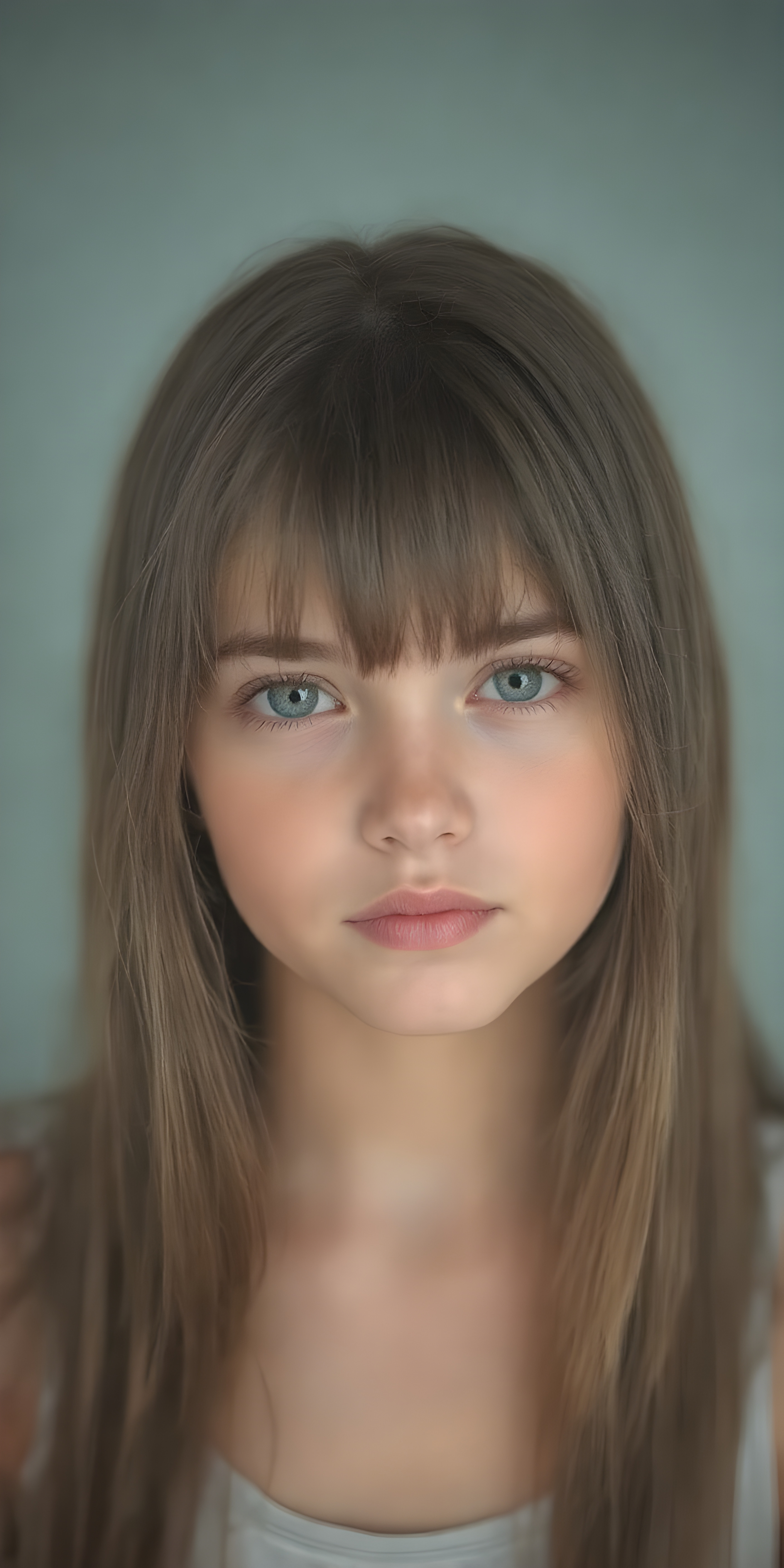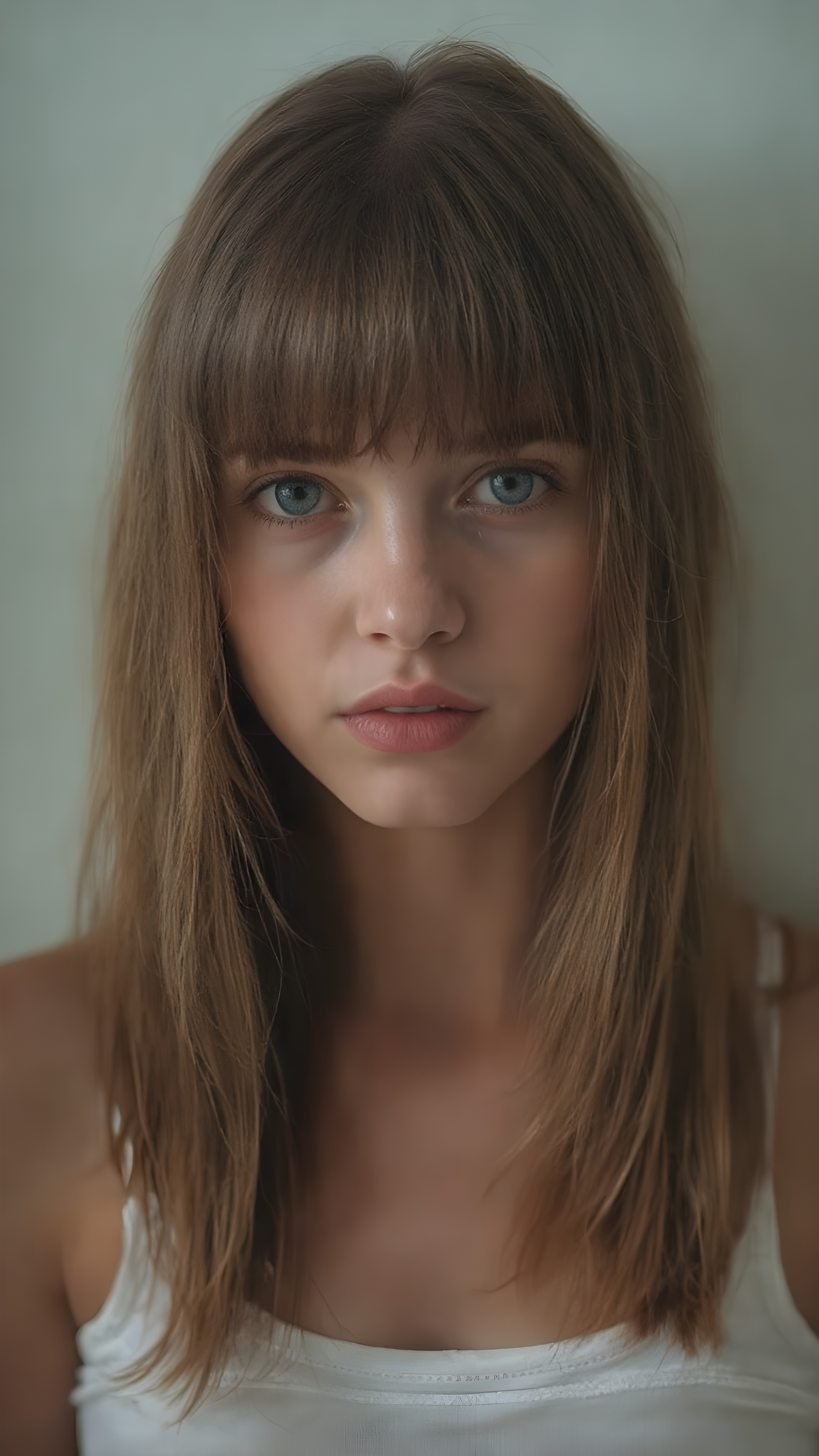 a fantastic young adult tanned teen girl, she is my daughter, with long straight black soft hair is standing in a sunny meadow. In the background is a deep blue lake, she is smiling, ((detailed and super realistic)), she wears a short plain tank top