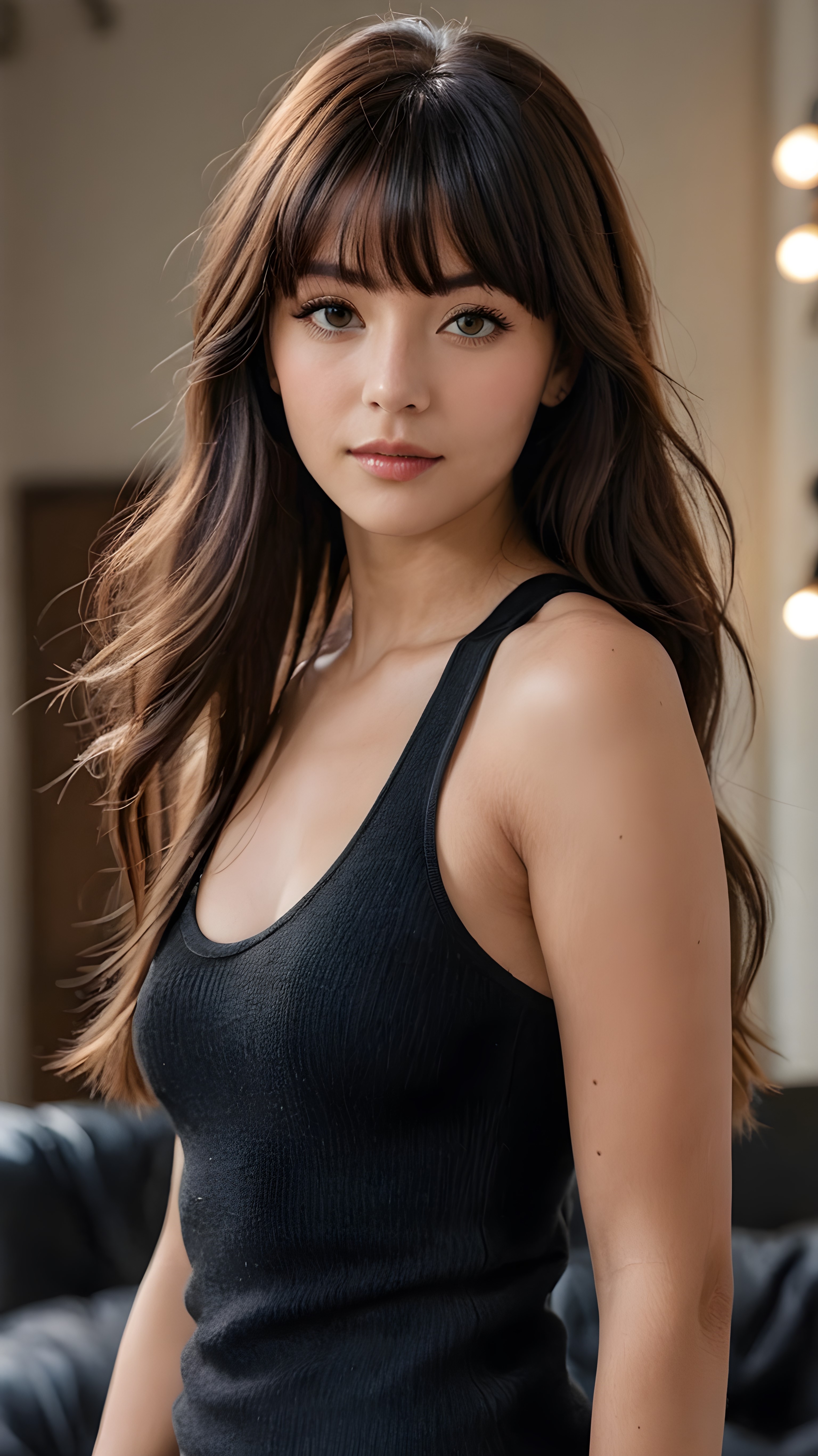 A (((professional photograph))) with a high-quality jet raven black thick, straight, long hair (((with bangs))), showcasing youthful features and a natural, athletic physique. The scene is framed by a (((black short wool tank top))), which highlights the natural beauty of the (skin) and the (hair). The light is backlit, with a (full body) in view, exuding a sense of (realism) and (natural beauty). The girl is focused on her (hair) and looking straight into the camera, embodying a sense of (photorealism) and (natural elegance).