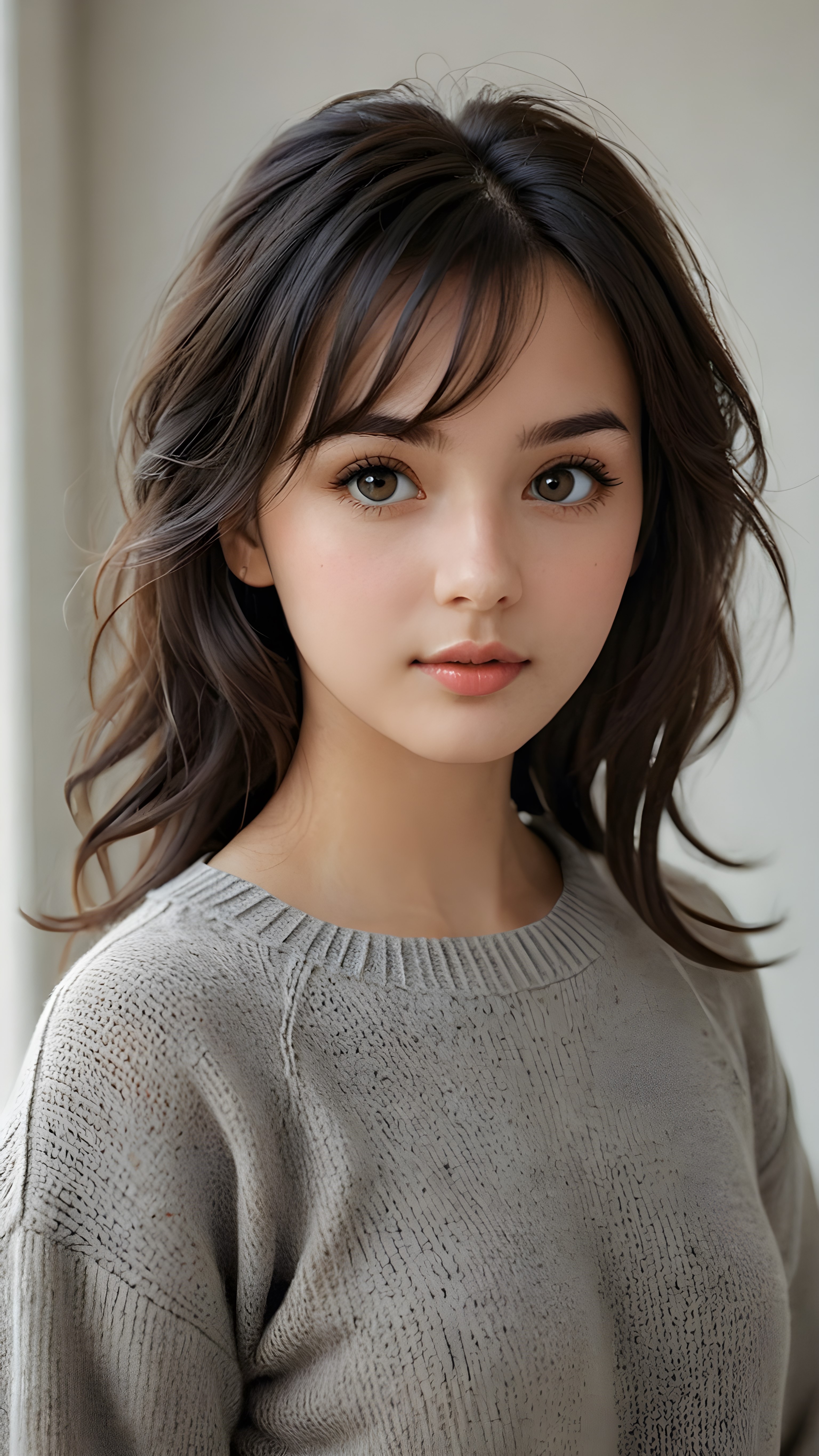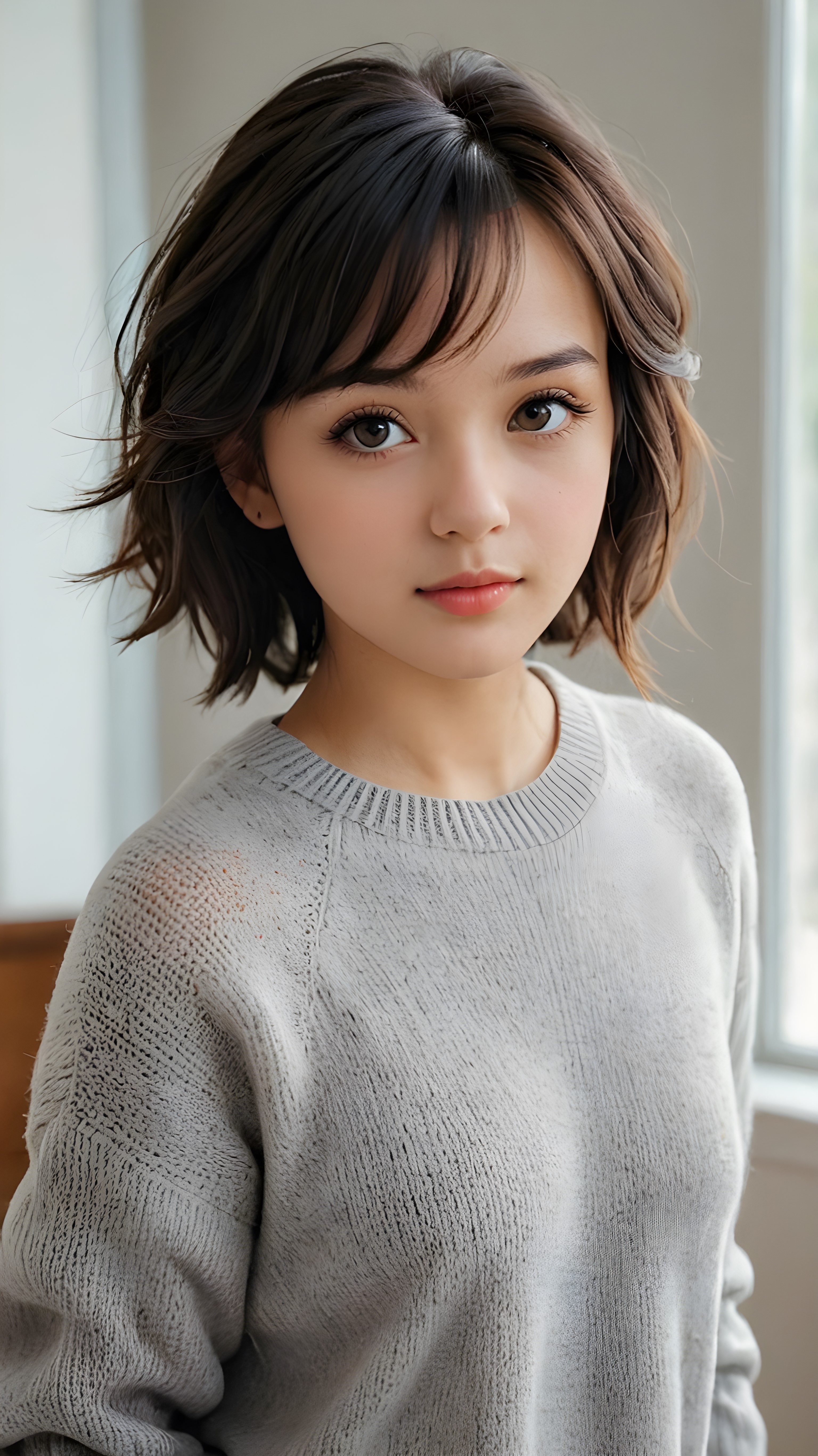 A (((very cute girl))) who exudes an air of youthful beauty, with short, black bangs that are cut to frame her face perfectly and soft, realistic detailed (amber) eyes that add a touch of realism to her look. She’s wearing a (short, grey wool sweater) that emphasizes her cuteness even further, complemented by the subtle glow of (soft, natural light) that accentuates her features. Her hair is on pointe for a casual, everyday look, giving off a soft, ethereal vibe. She poses with her head tilted back and eyes looking up at the camera, capturing an air of tranquility and elegance. Full body shot. Realistic detailed skin.