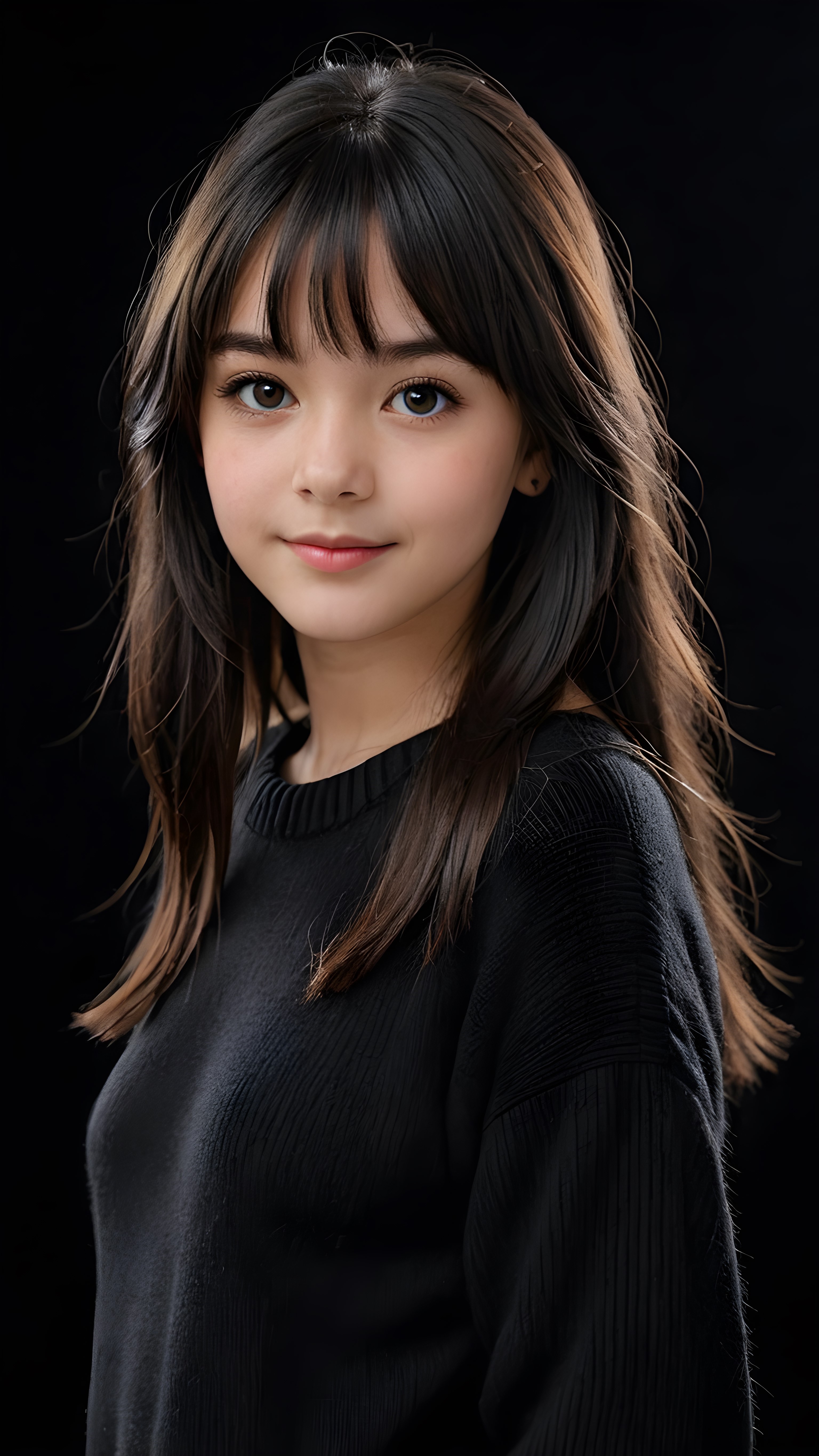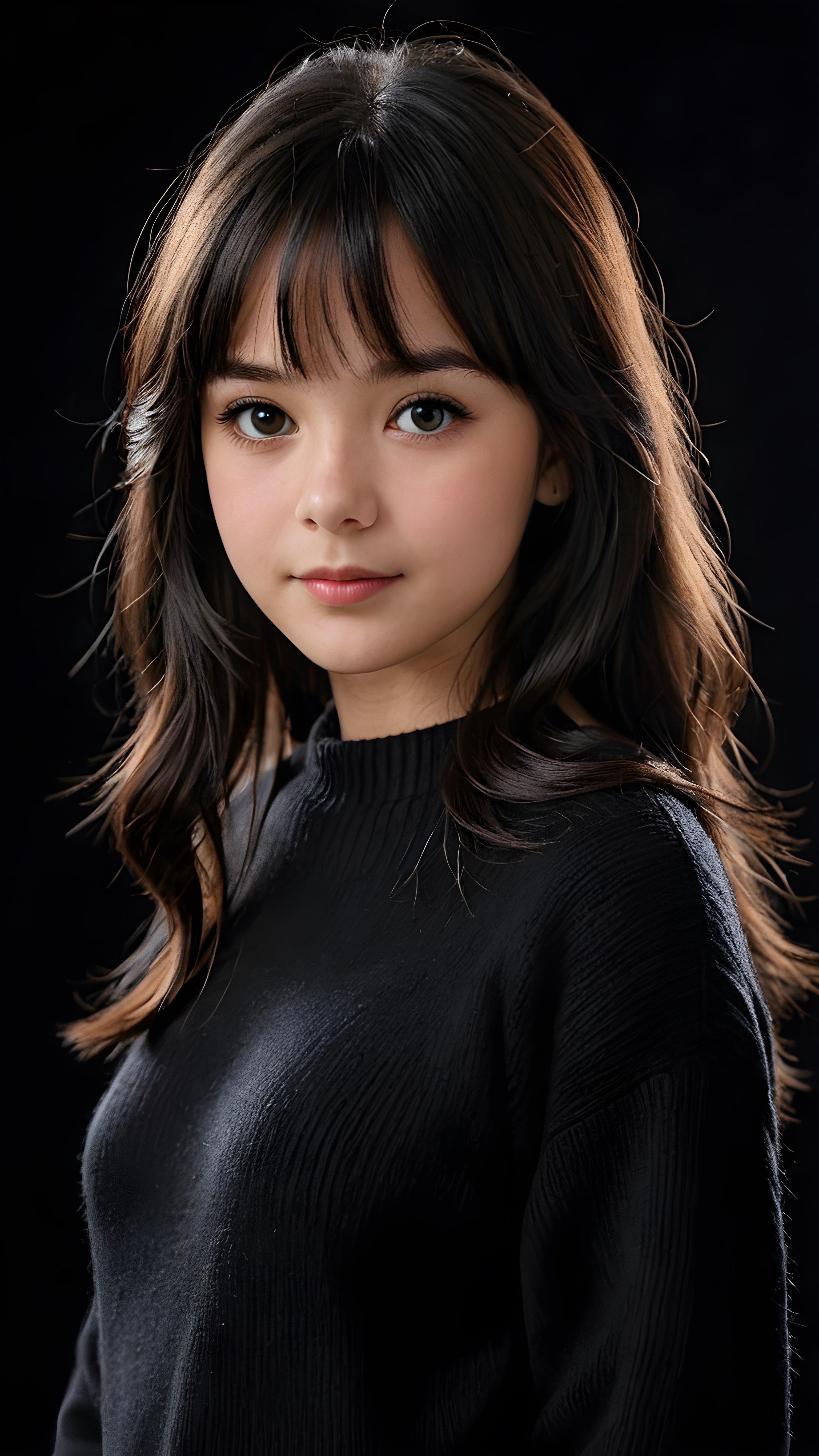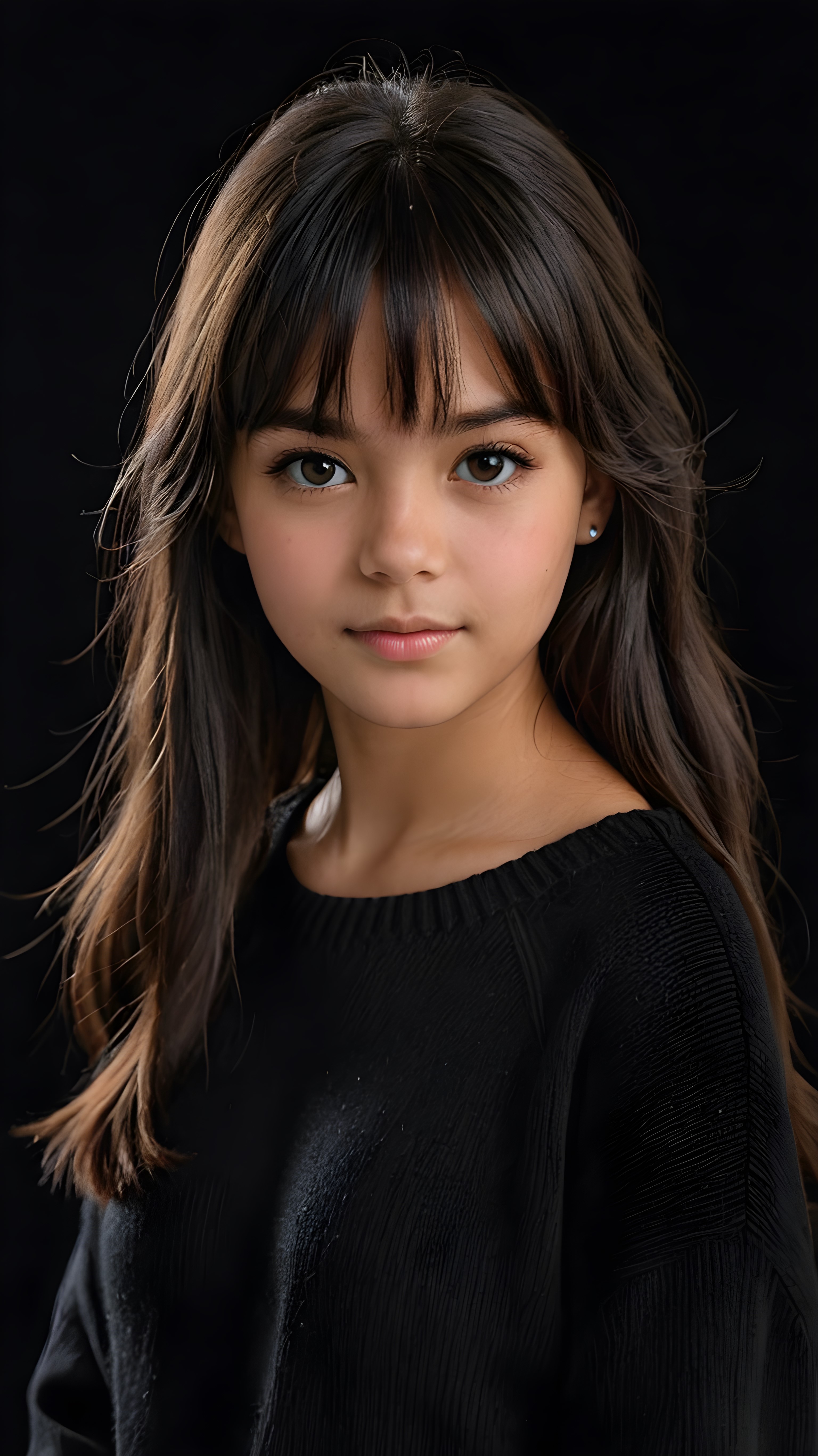 a detailed an realistic photo from a young tanned teen girl, 13 years old, jet raven black thick straight hair and bangs, black wool sweater, ((stunning)), ((gorgeous)), ((black background))
