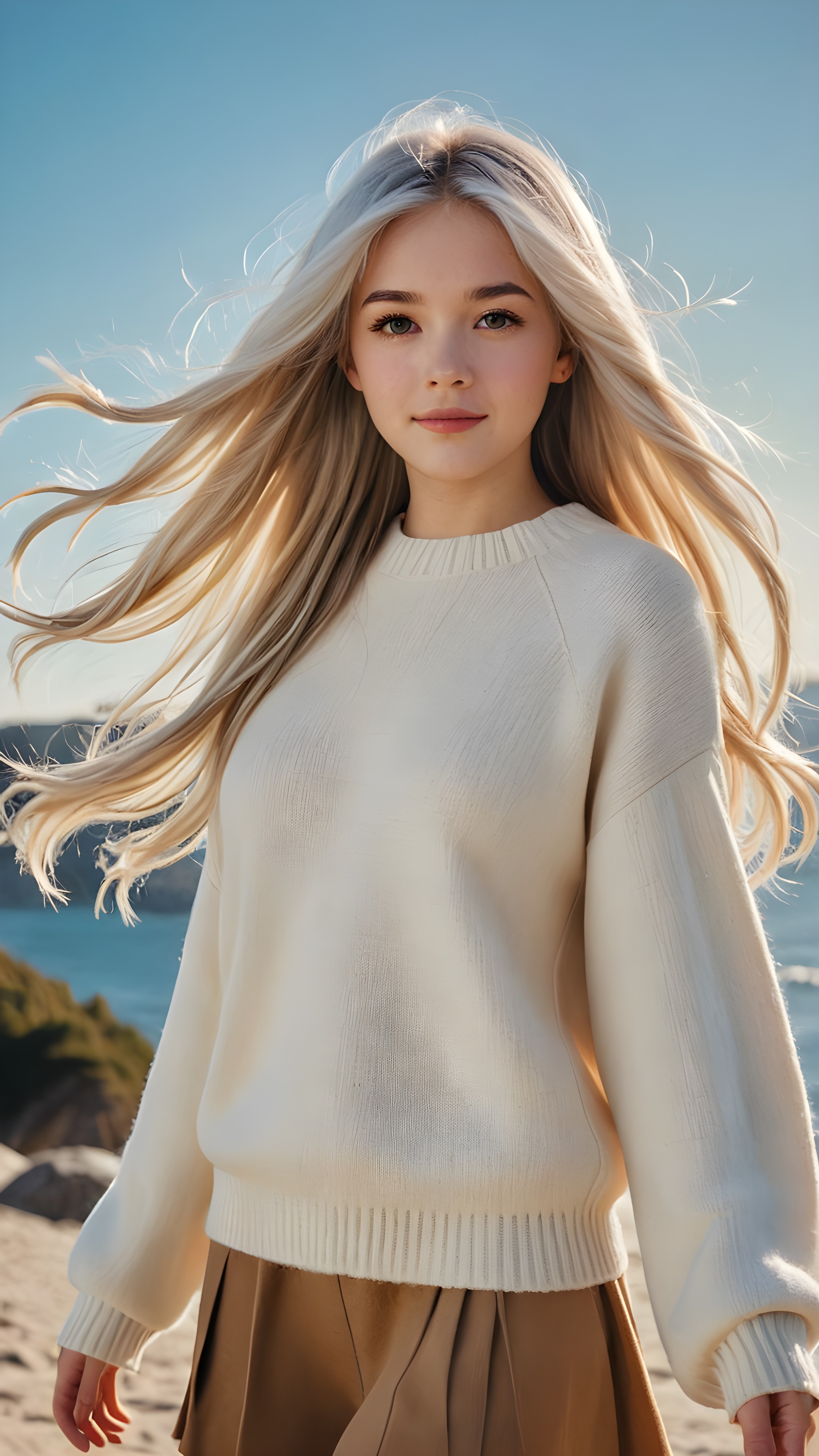 a (((detailed realistic full-body photo))), capturing a breathtakingly beautiful young teen girl with luxurious, ((extremely long, thick, jet white hair)) and bangs that gracefully sweep across her face, wearing a ((soft beige wool sweater)) that accentuates her figure. The sun is out in full force, with a clear blue sky providing a stunning backdrop for this incredible scene