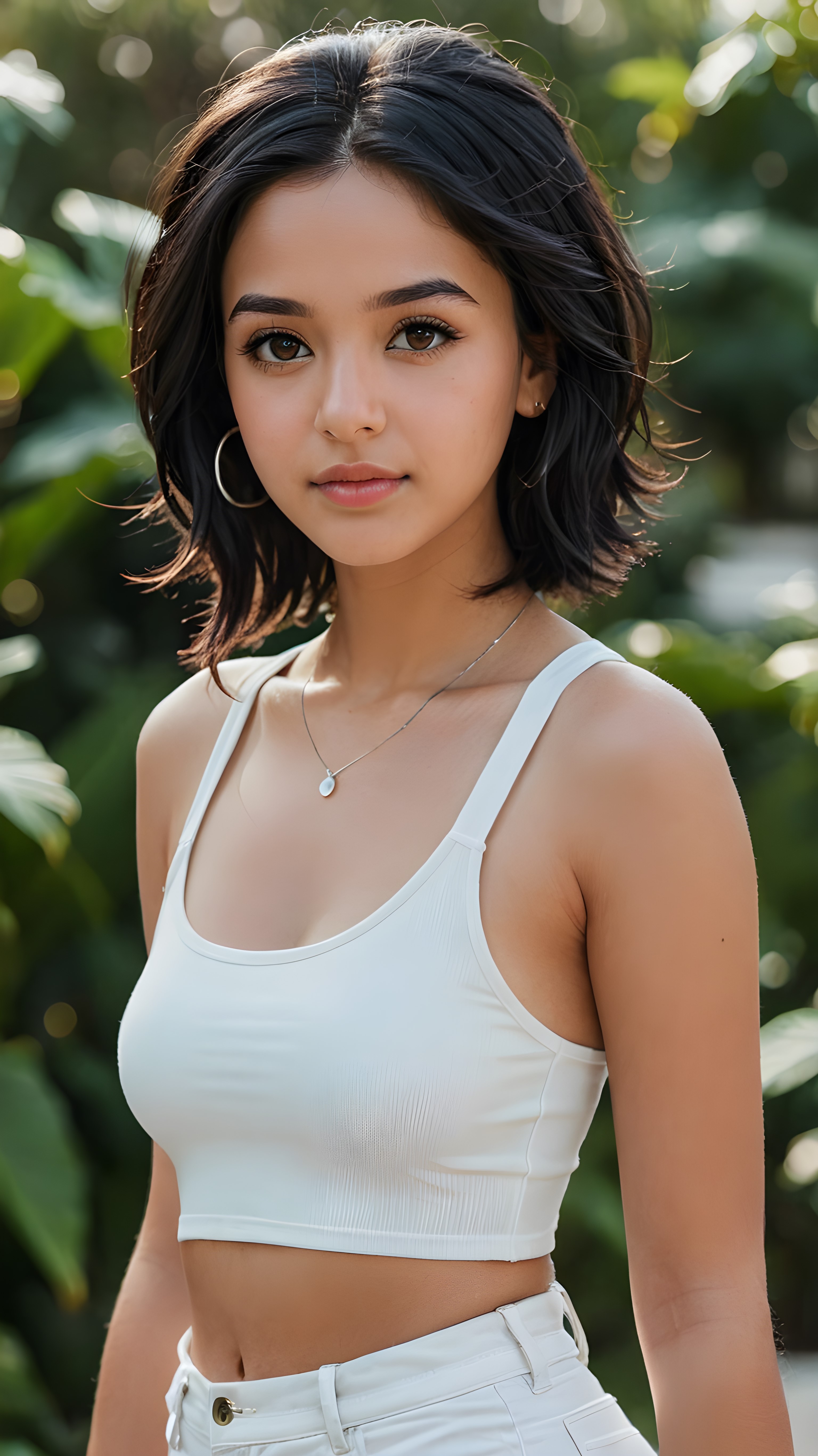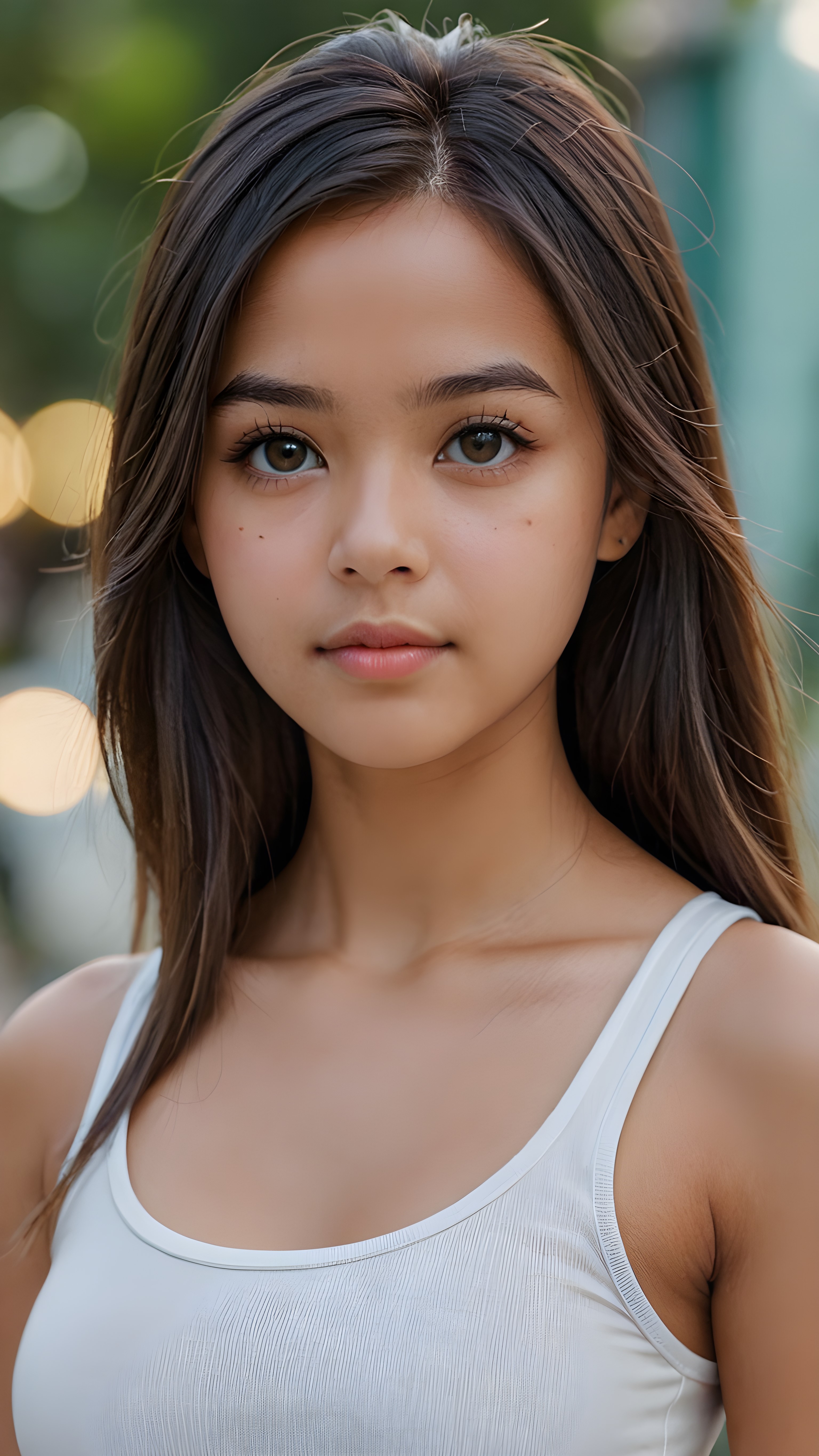 super realistic, detailed face, cute 17 years old Exotic girl, long straight hair, realistic detailed eyes, wear white short tight tank top, looks sadly at the camera, perfect curved body