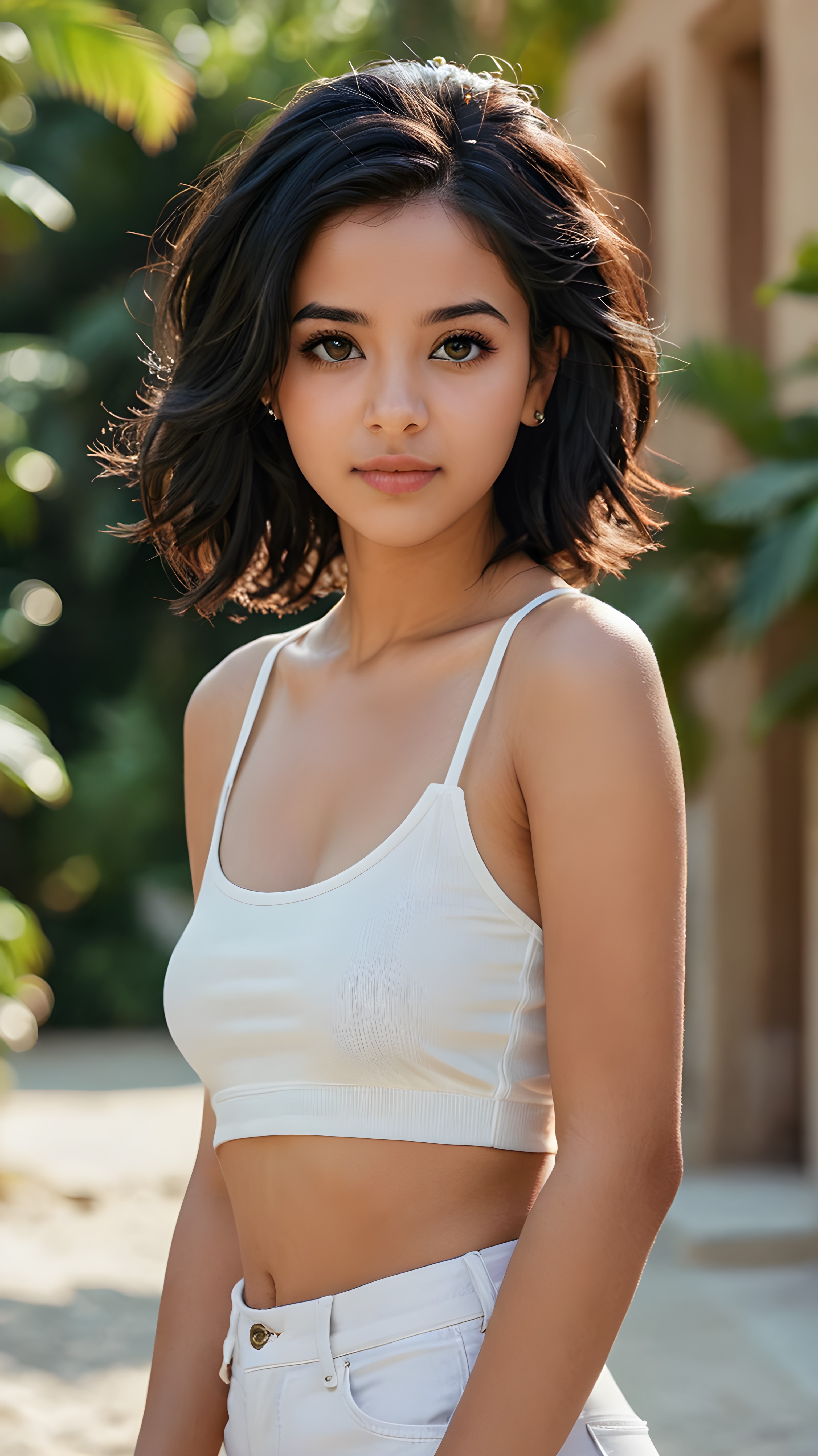 a (((stunningly gorgeous))) (((detailed and realistic portrait))) featuring a cute Arab teen girl who wears a (((white short cropped tank top))), long straight obsidian black hair, she has a perfect curved body