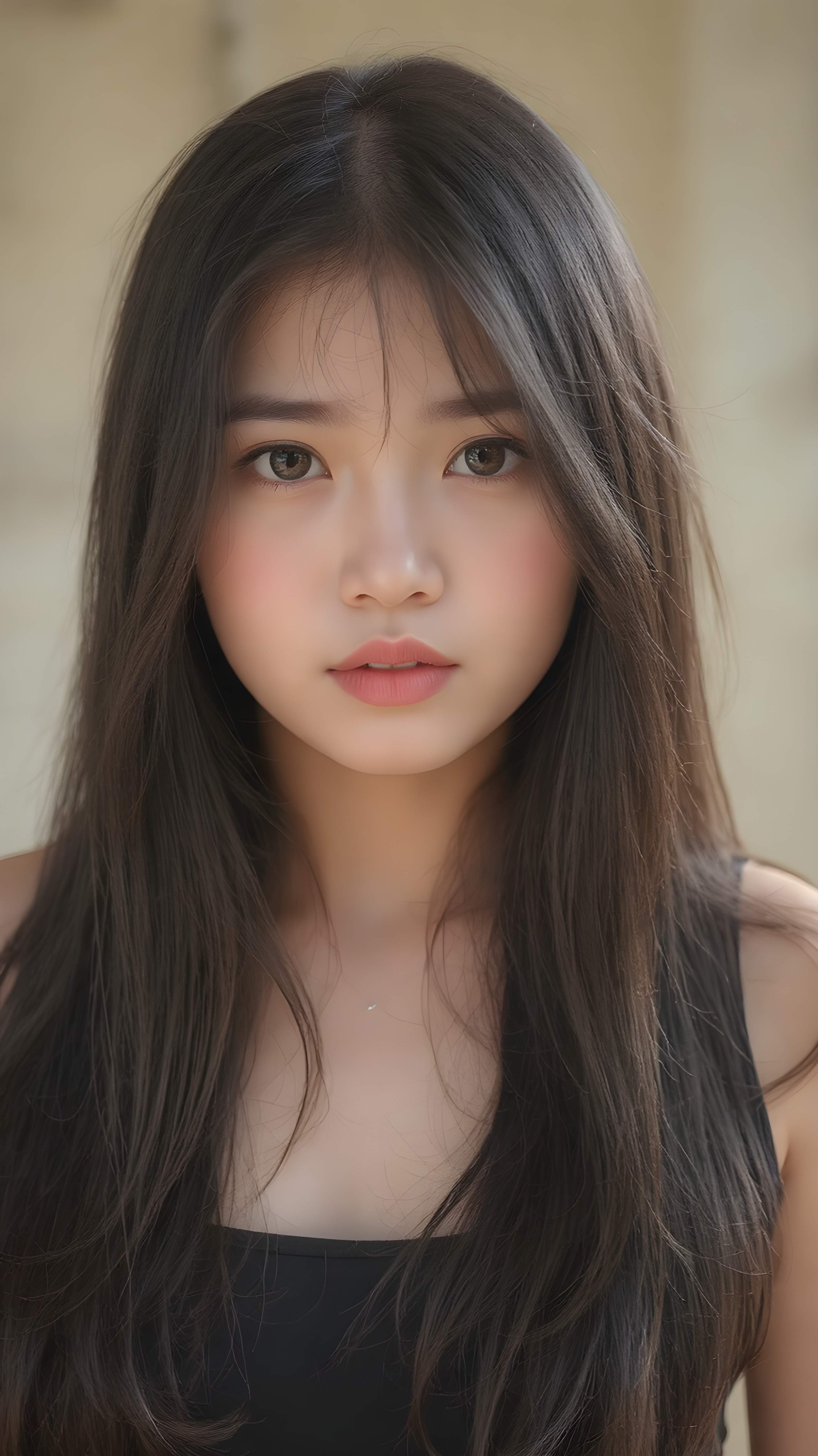 ((extremely detailed)) ((ultra high resolution)) ((masterpice of photography)) with ((straight long black hair with fringes slightly curled)), which captures the essence of a breathtakingly beautiful ((teen girl)), with (soft, perfectly realistic looking) skin, (natural looking lips) and (natural looking eyes) that sparkle with realism. She’s exuding an air of confidence and allure, dressed in a (((short, tight white cotton tank top, deep v-neck))). The scene is (intimately detailed) and (insanely realistic), with a (full body shot) that showcases her exquisite beauty and (softly backlit) surroundings that accentuate her and the dress’s intricate details