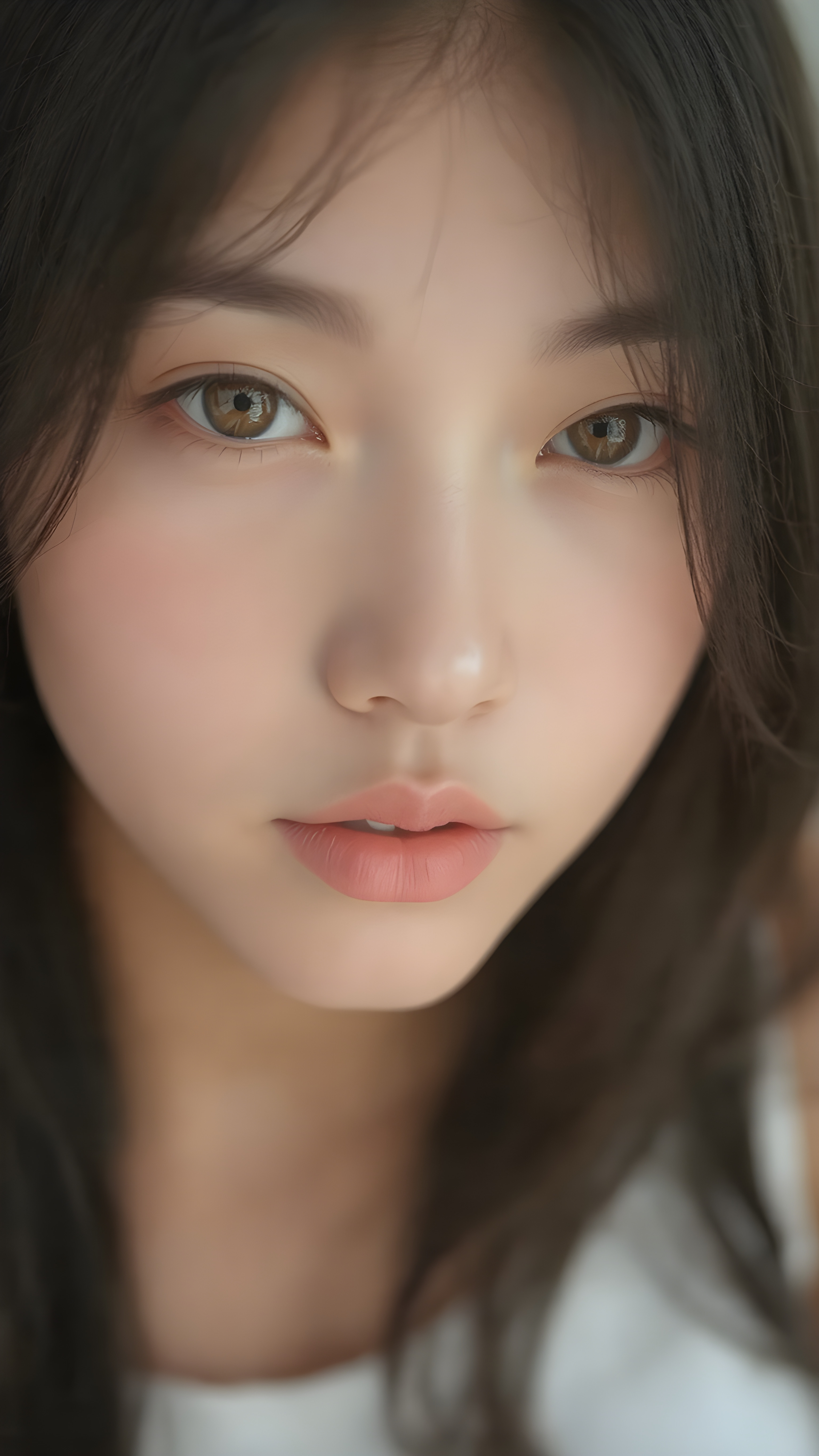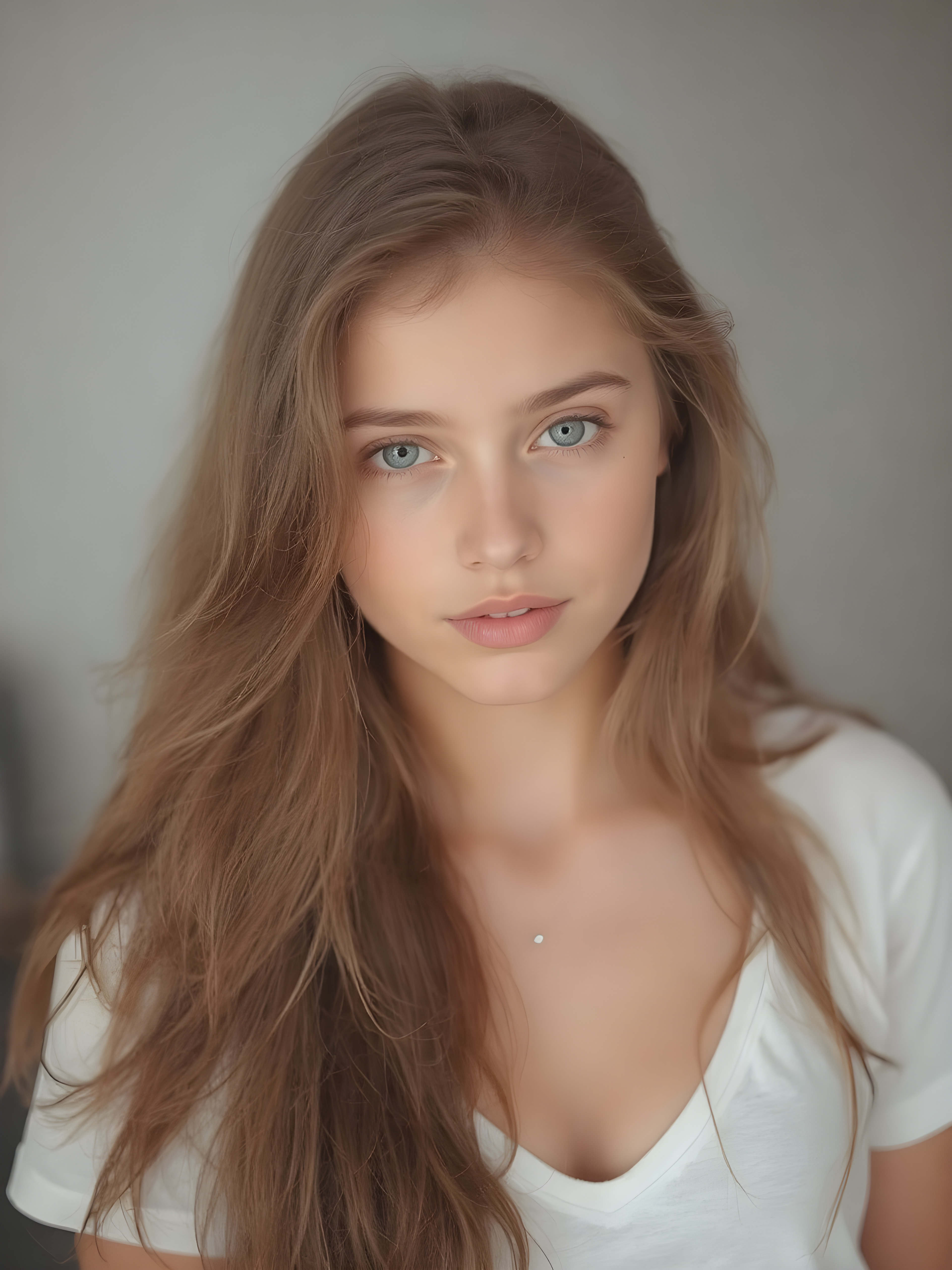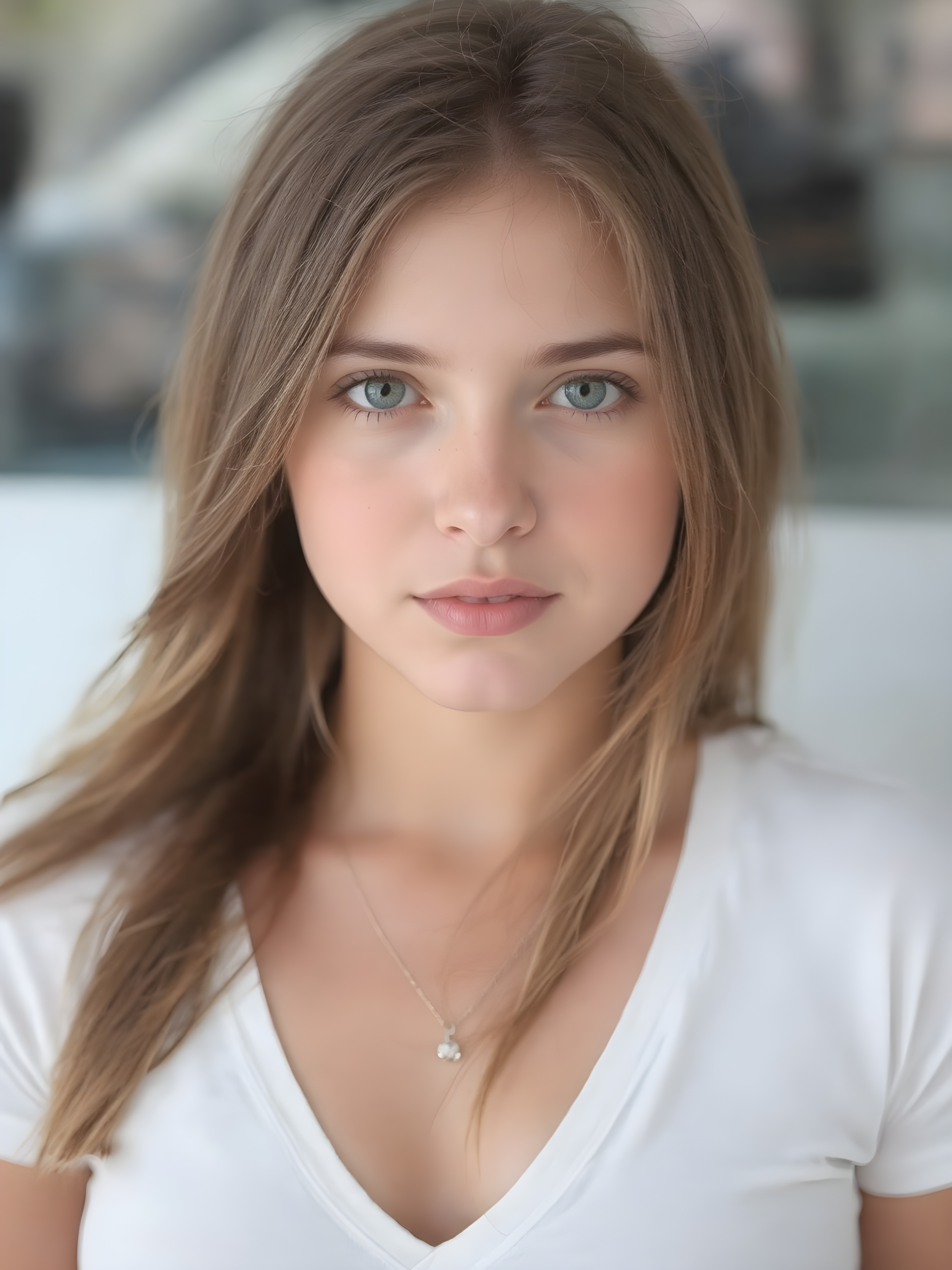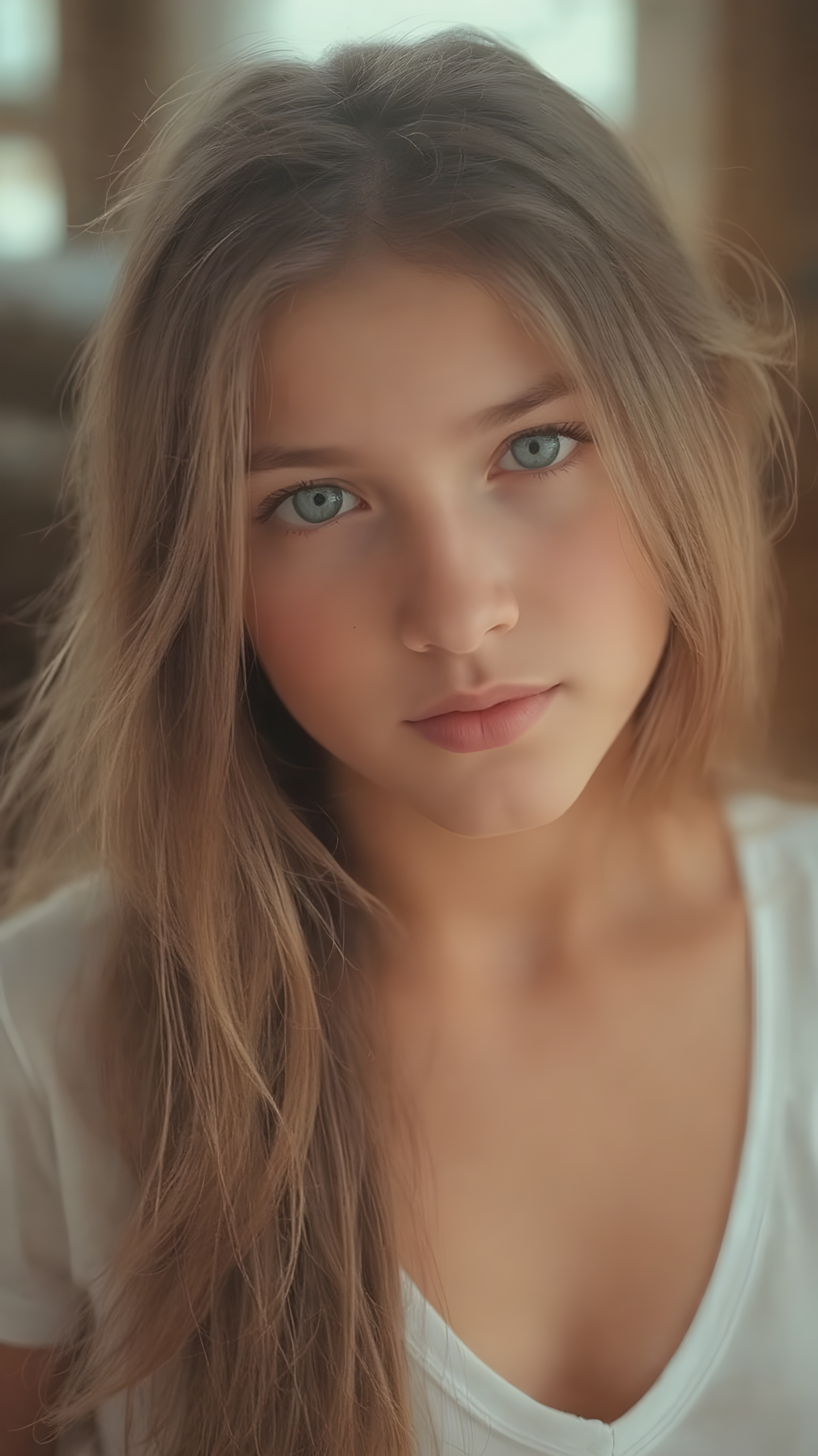 a (((masterpiece of photography))), ultra high resolution and straight, long brown soft hair, showcasing an incredibly beautiful young teen girl with (realistically detailed, soft light backlit) surroundings that bring out her (exquisite features) and the (intricate details of her skin) in a (highly detailed, 8K frame) that draws the eye and exudes confidence and allure, she wears a thin white t-shirt with deep v-neck